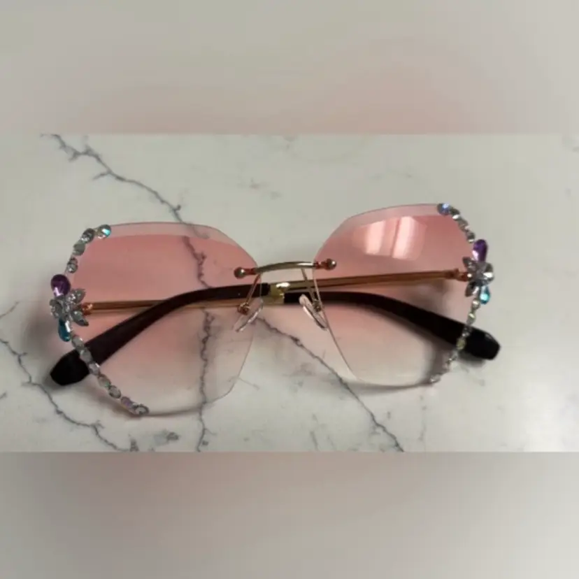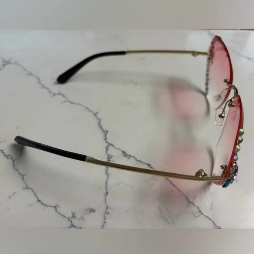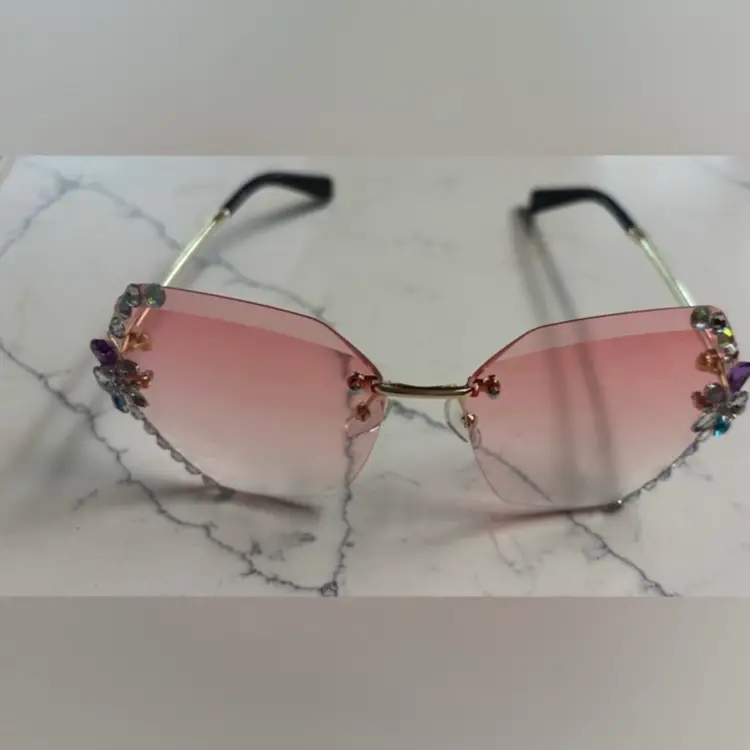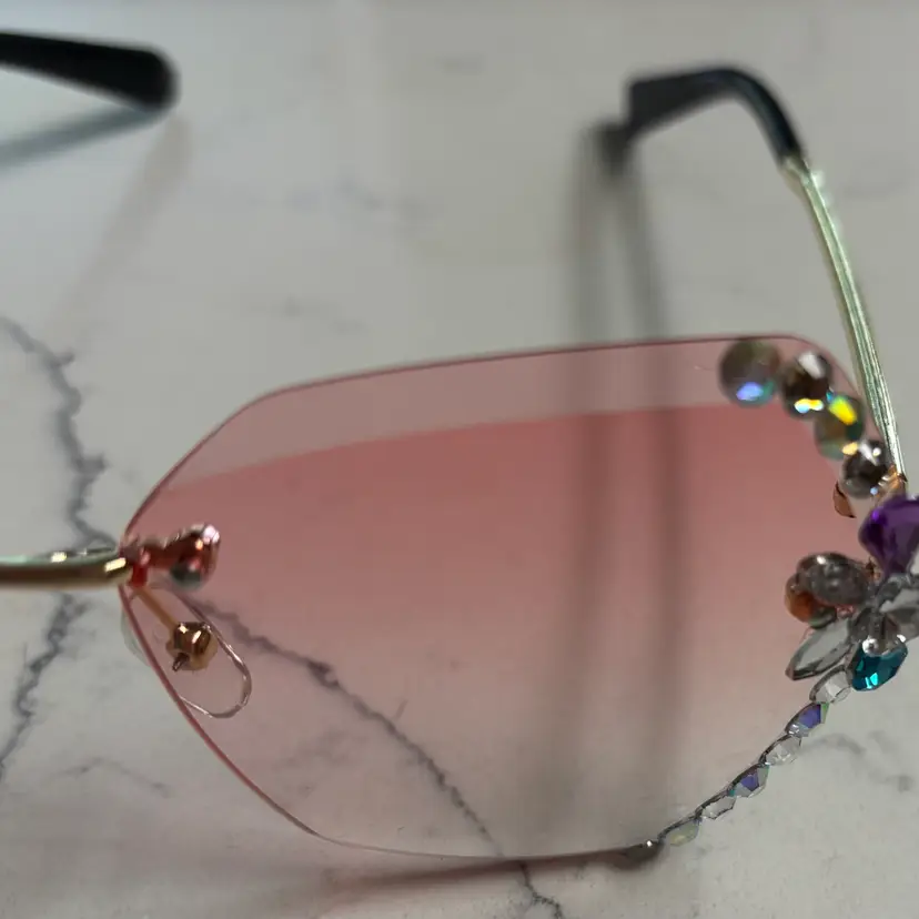 Oversized rimless sunglasses with a pink gradient tint. Embellished with rhinestones and faux pearls along the edges. Gold-toned metal arms with black tips.