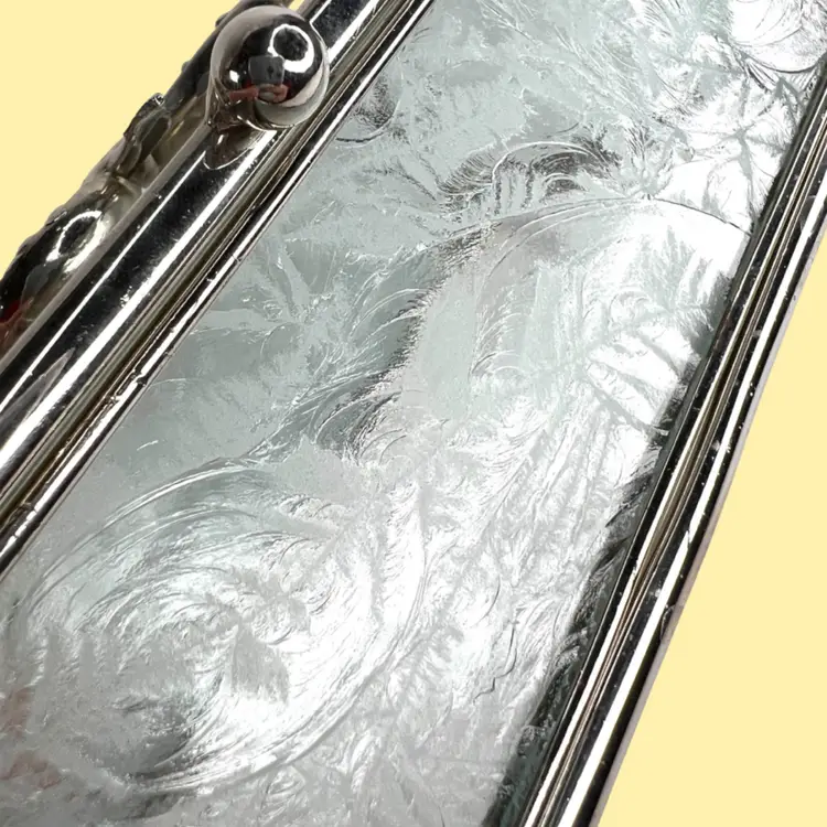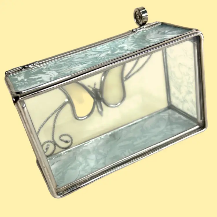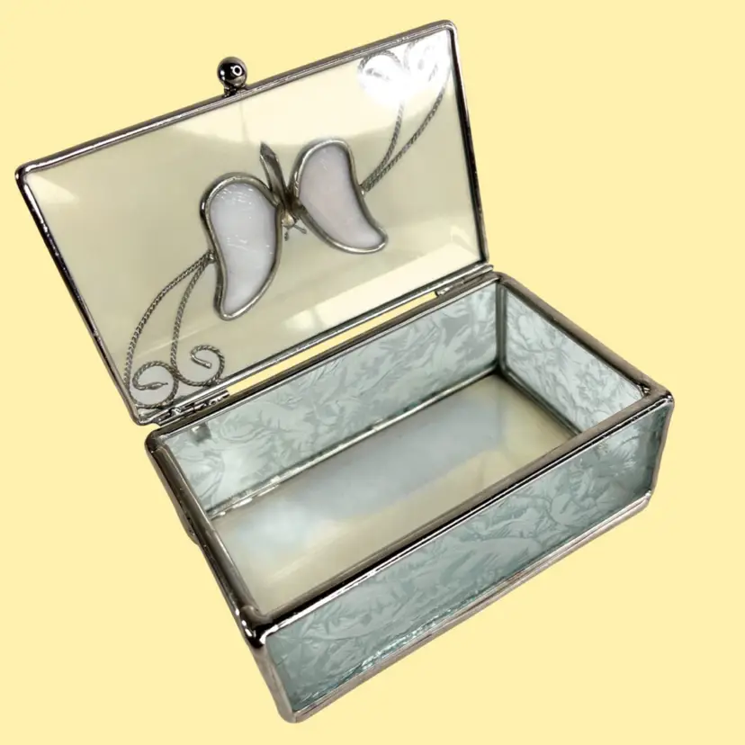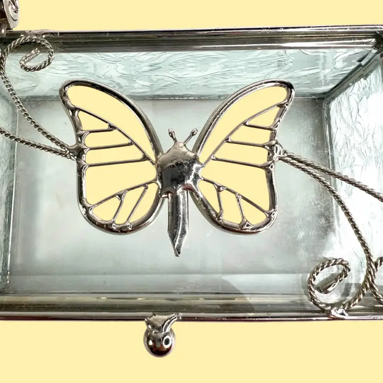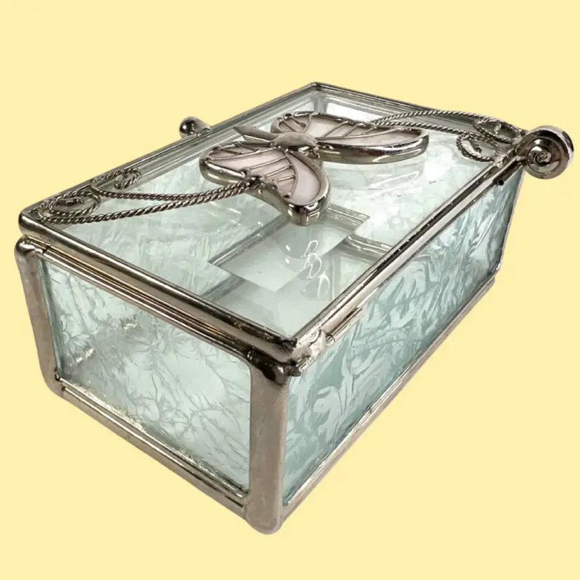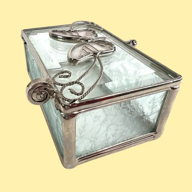 Pink Stained Glass Butterfly π¦ Jewelry Trinket Silver-tone Glass Box. Frosted, Etched Design on Sides. Weighs 1 pound 5β L x 4β W x 2-1/4β D Condition: Minor scratch on lid- see last photo with purpled circled area.