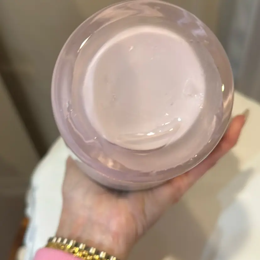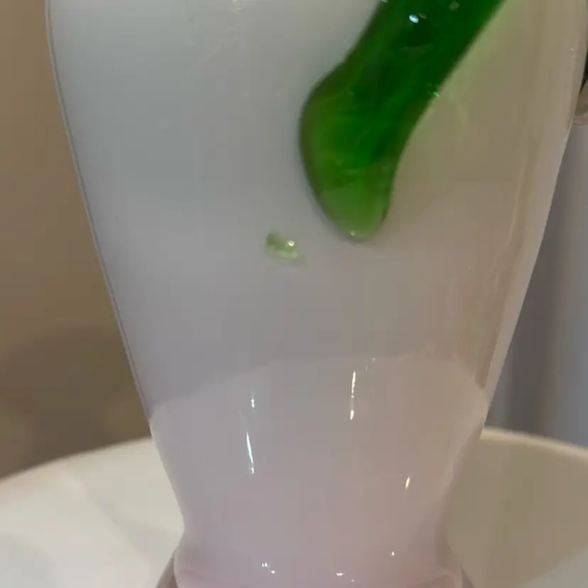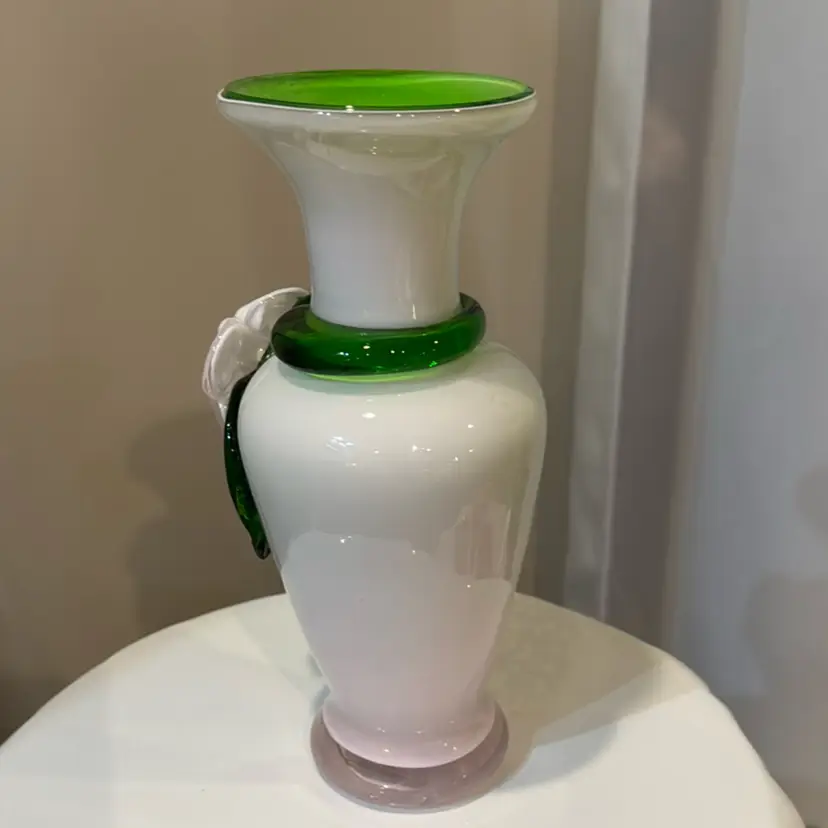 Beautiful blush pink vase with applied vine and flower. Lime green interior. Small drip of glass vine. Measures 8 1/2 inches tall.