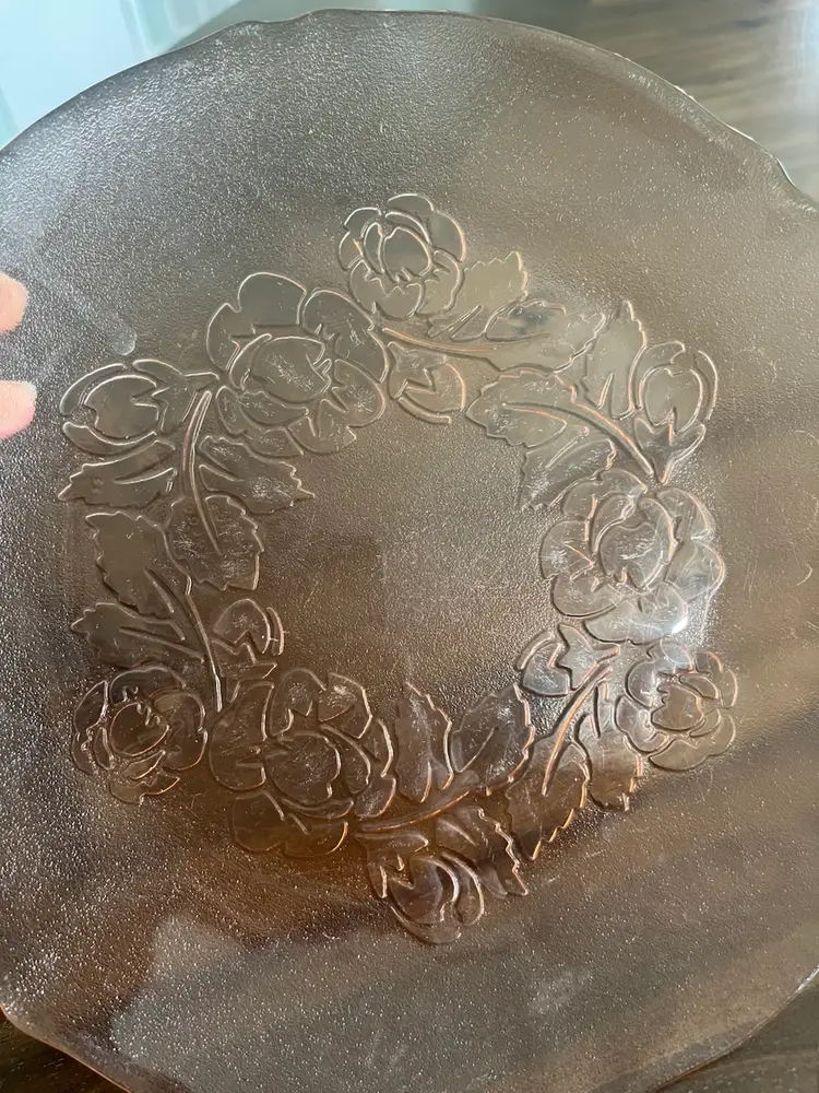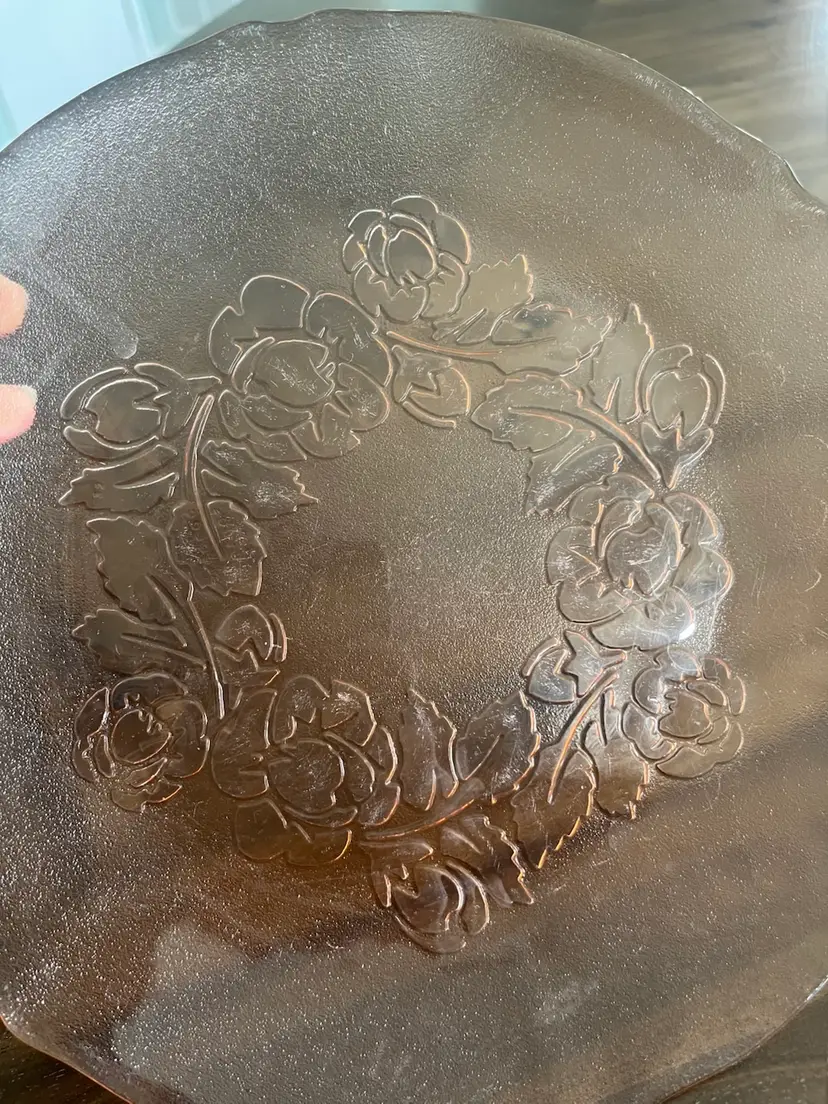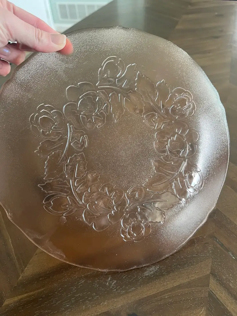 This particular plate features a raised floral motif, likely roses, on a frosted or textured glass background. The "Rosa" pattern is one of Arcoroc's well-known designs, often found in various colors and types of tableware. These pieces are collectible and appreciated for their vintage charm and the quality of French glassmaking.