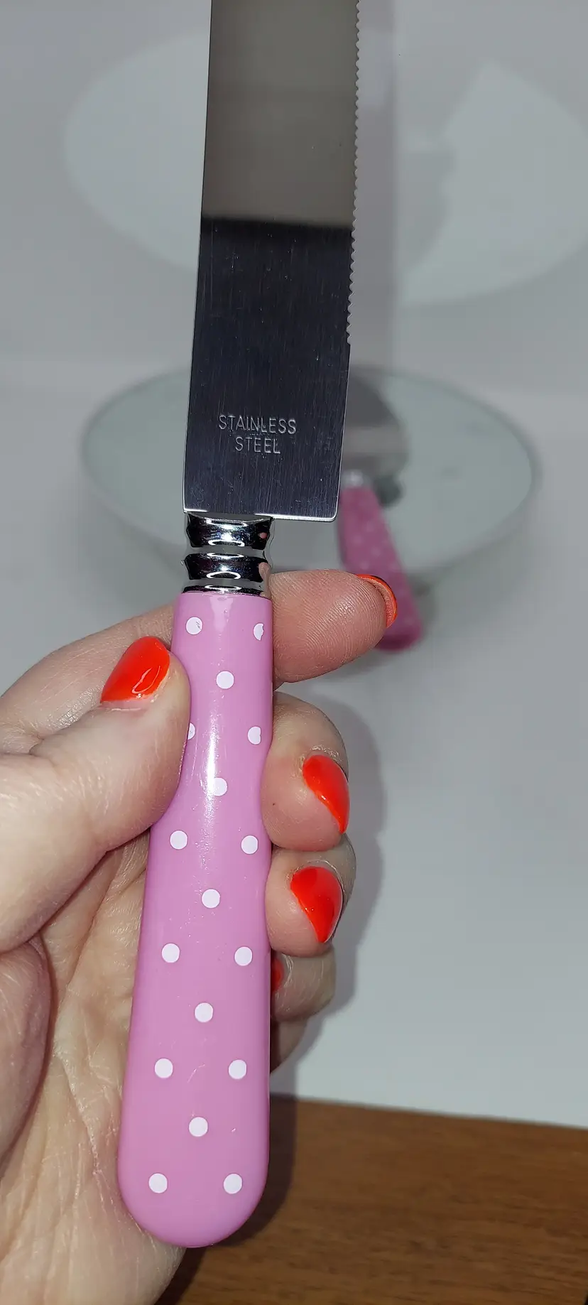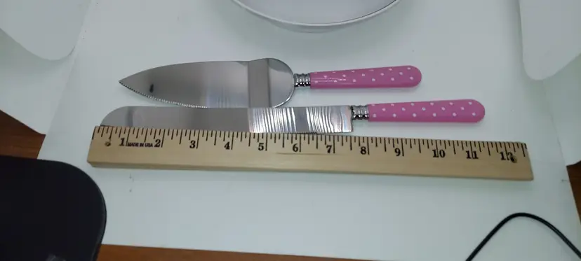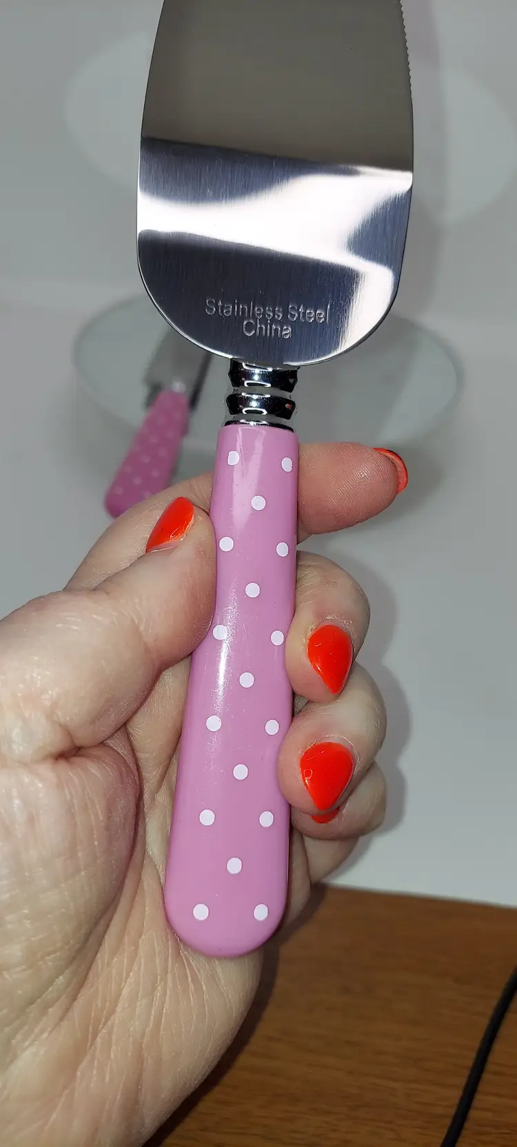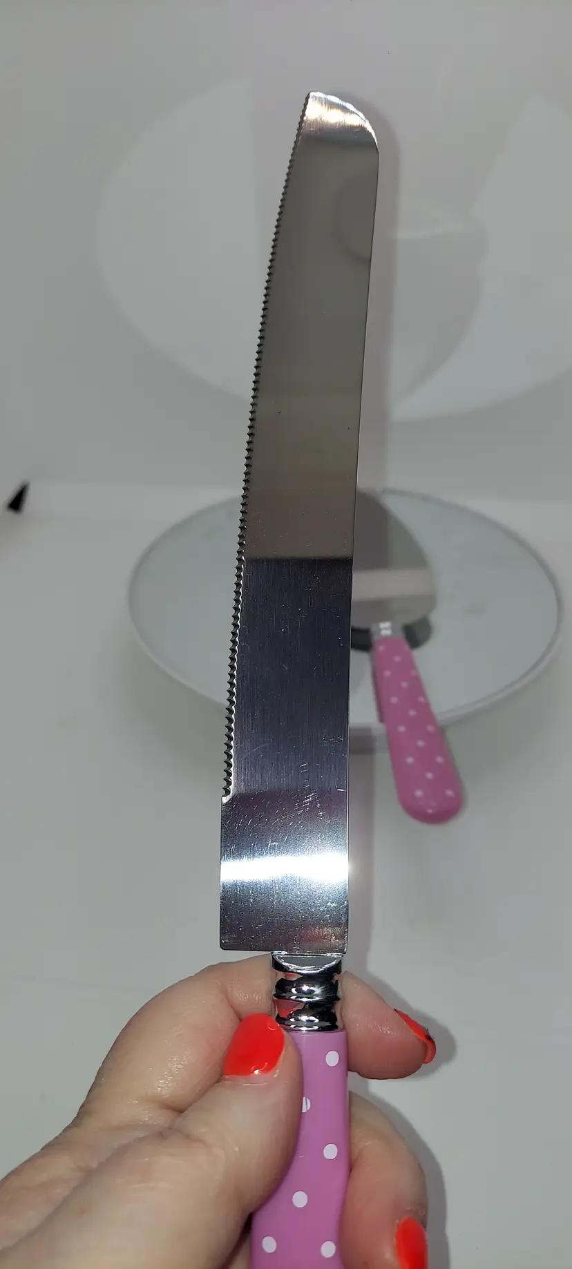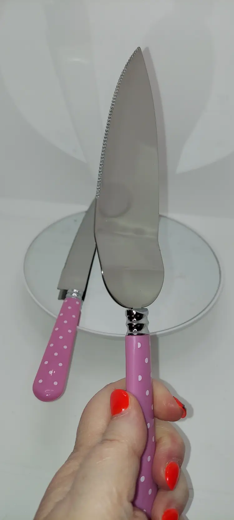 This is a 2 piece set of Pink and White Arcylic handled Polka Dot Bread Knife and Cake/Pie Server. The blades are stainless steel and are LIKE NEW, never used. They are very sharp! So Fun for Easter, a Baby Shower or a little Girls Birthday!