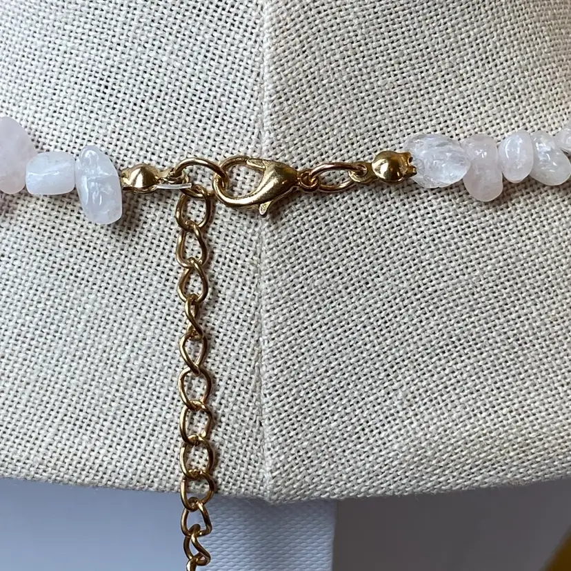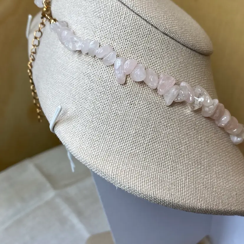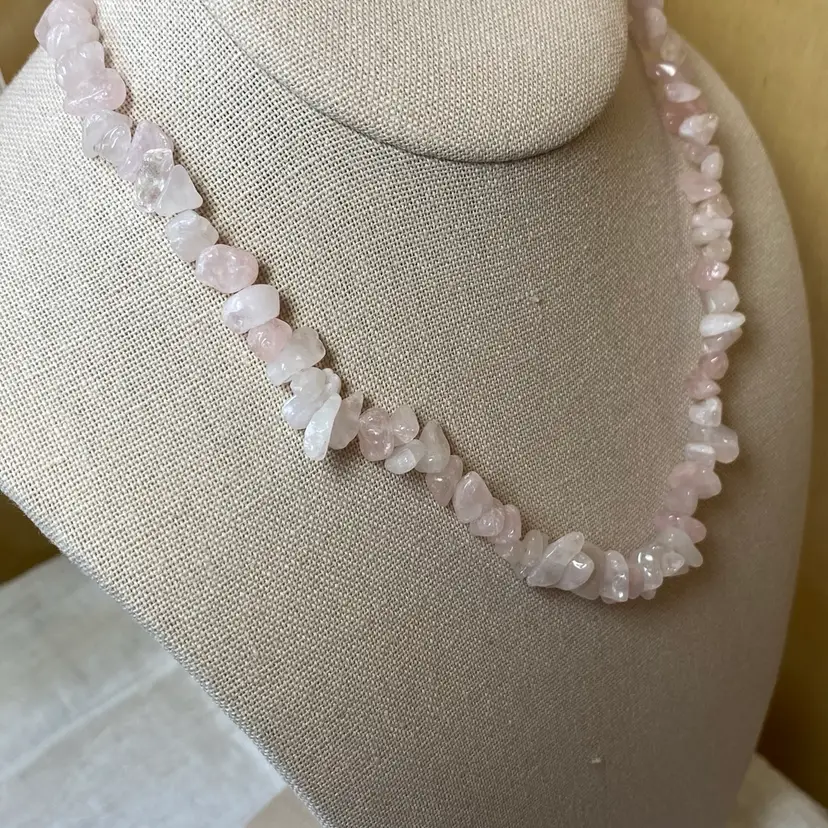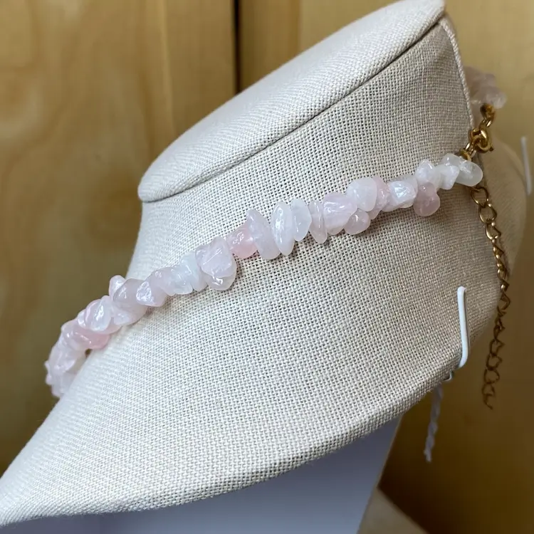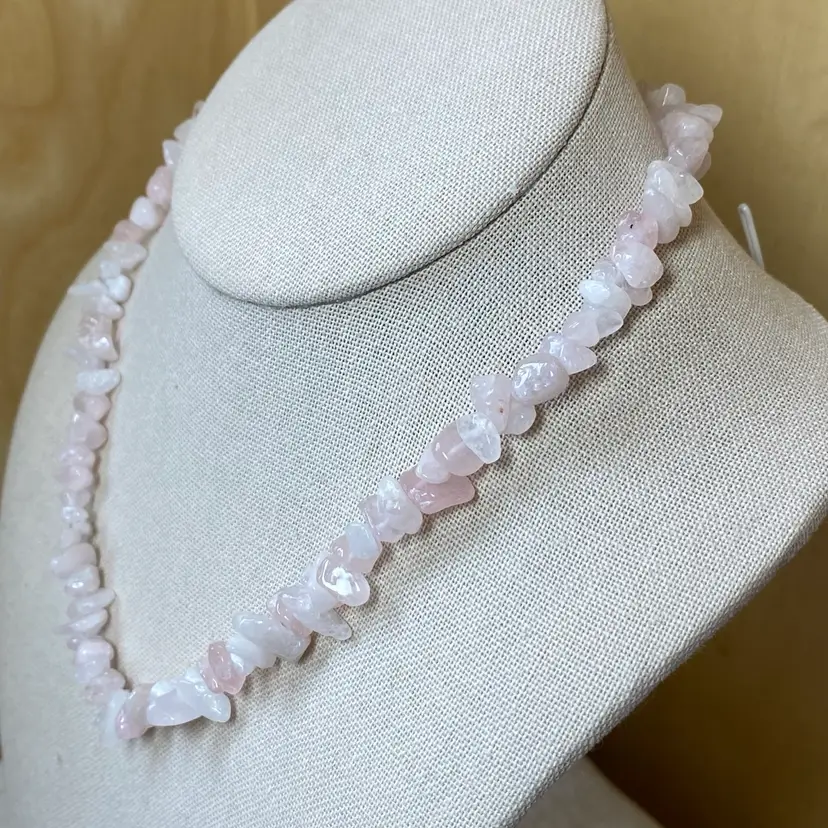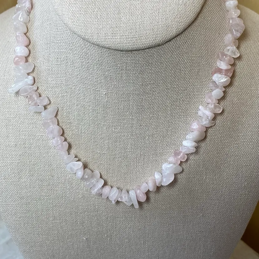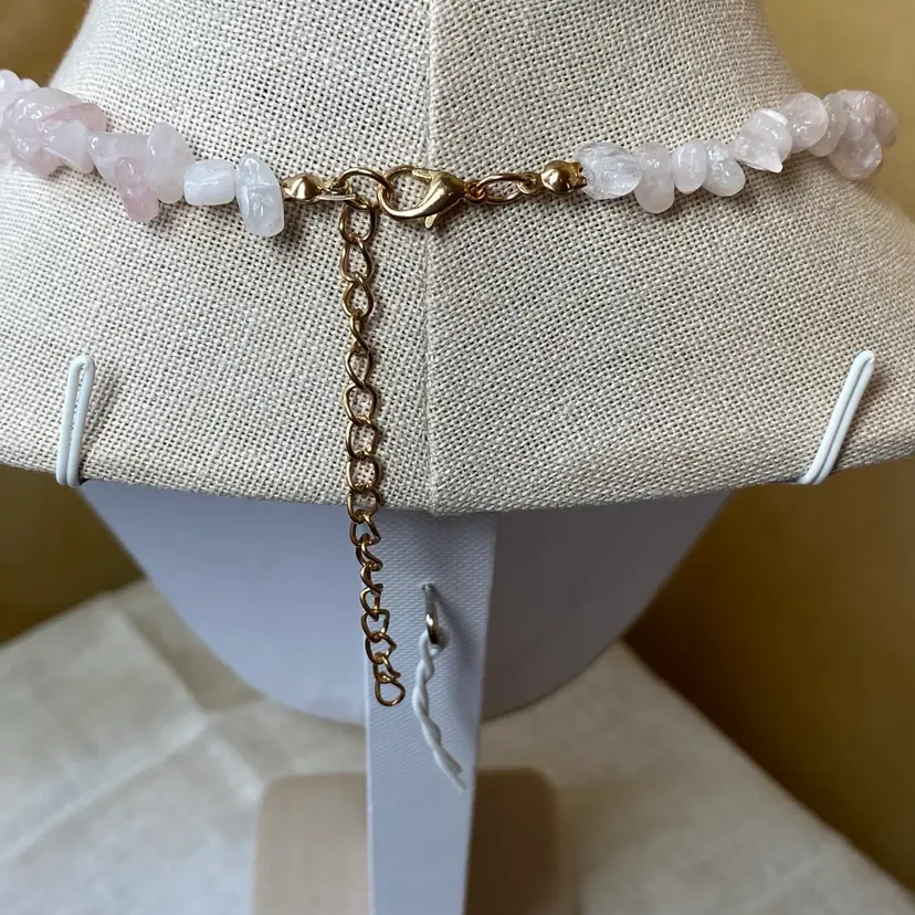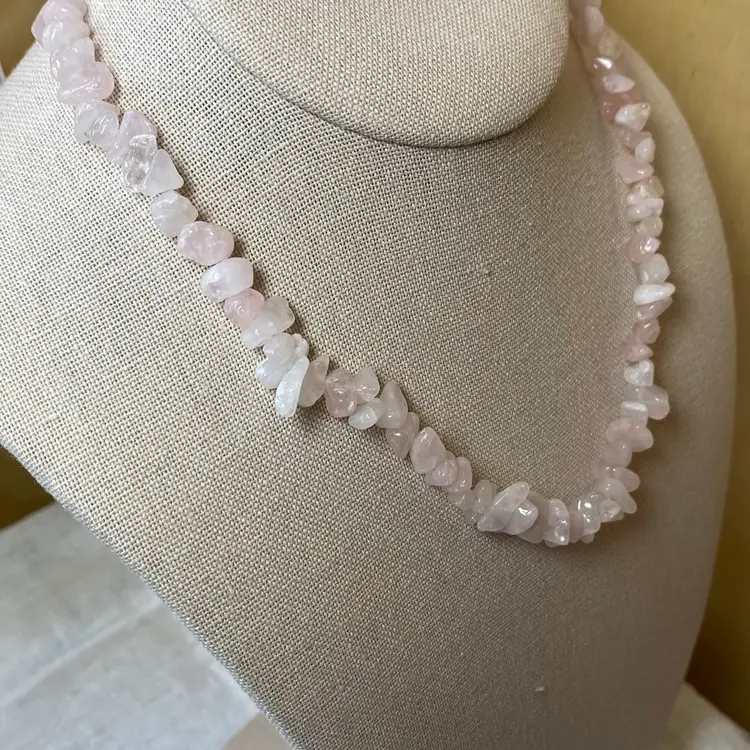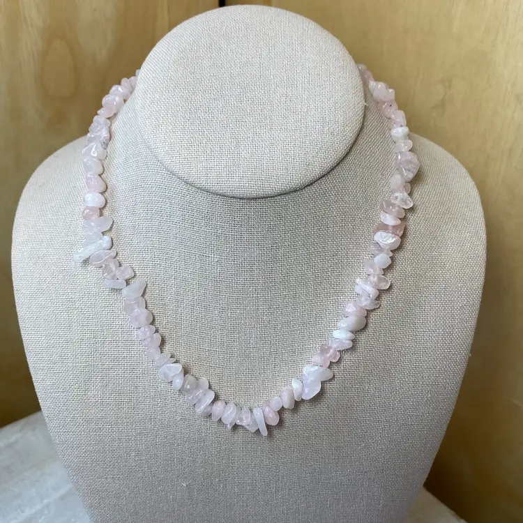 Add a touch of elegance to your outfit with this beautiful pink and white rose quartz chip bead necklace. The lobster claw clasp ensures a secure fit, while the adjustable length allows for customization to fit your personal style. The natural stone and gold tone metal make for a stunning combination, perfect for any occasion. This necklace features a bohemian style with a touch of nature, beauty, family & friends, love, and vacation themes. The 17-inch length necklace is made of high-quality materials, including stone and metal. The necklace is pre-owned and in great shape. It would make a great addition to any jewelry collection.