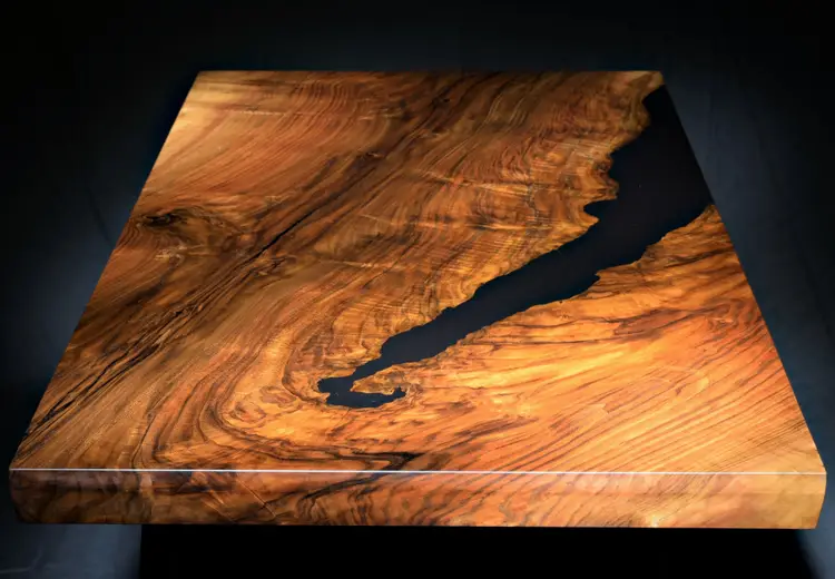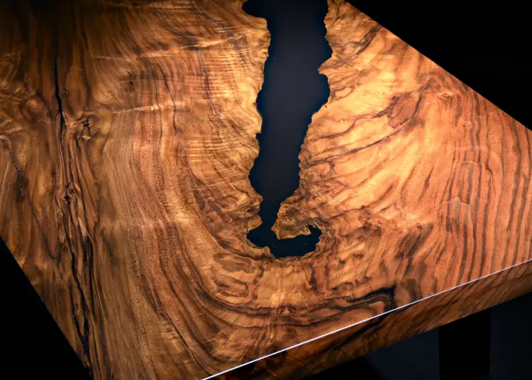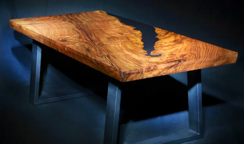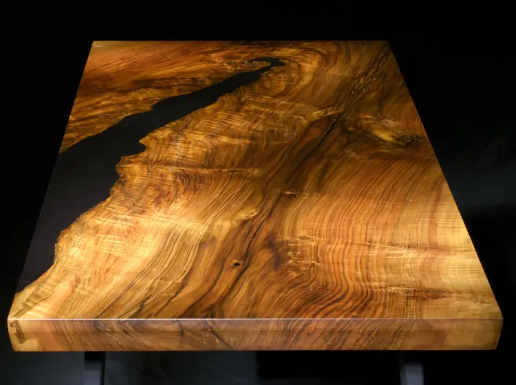 Bastogne walnut is a rare hybrid prized for its color variation and distinctive grain. The natural contrast between heartwood and sapwood creates an unrepeatable masterpiece. Black epoxy resin creates a river between two live edges, creating a smooth, durable surface that celebrates the wood's natural imperfections.