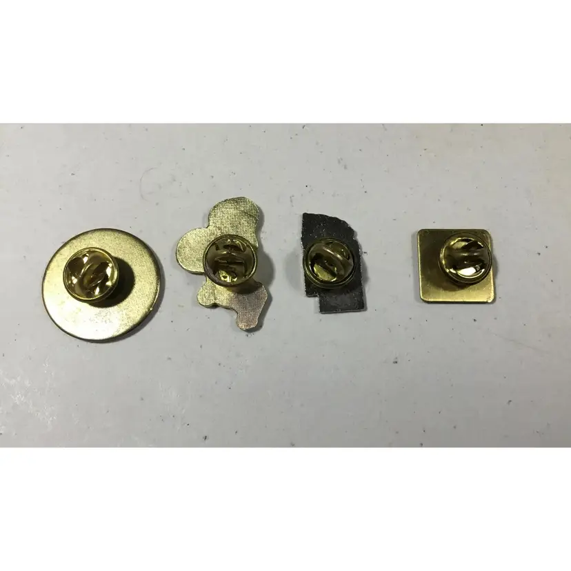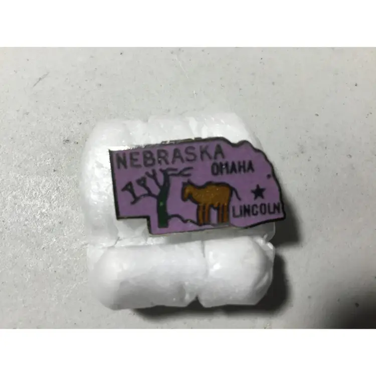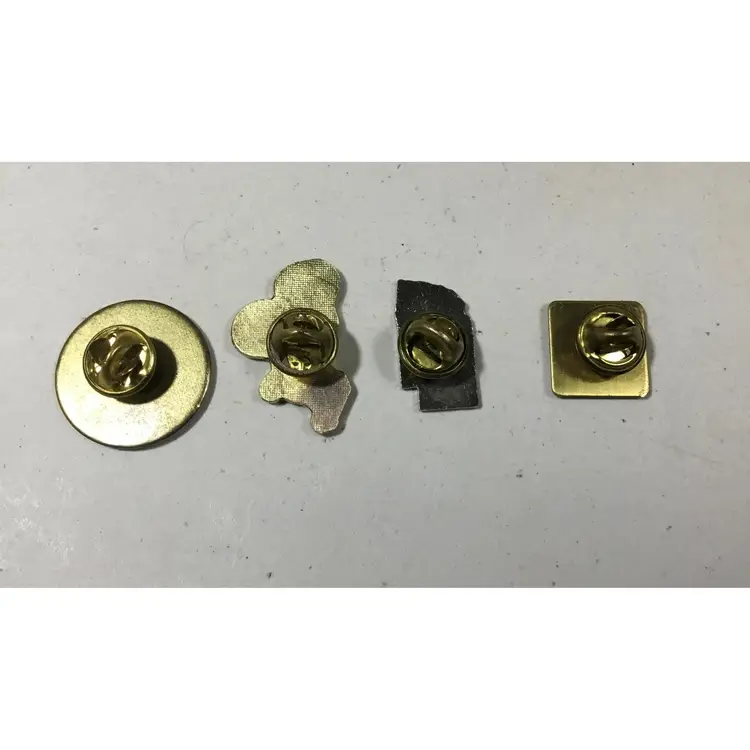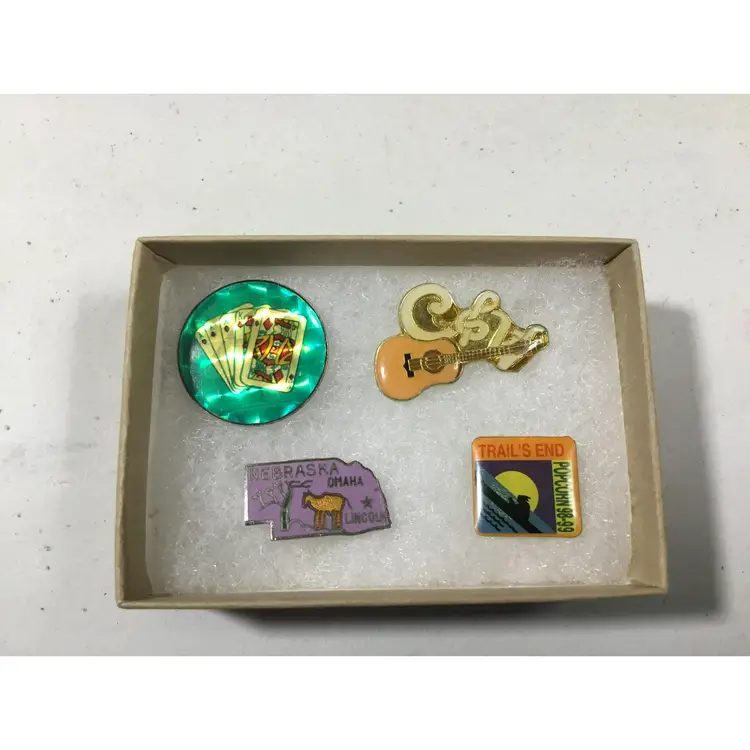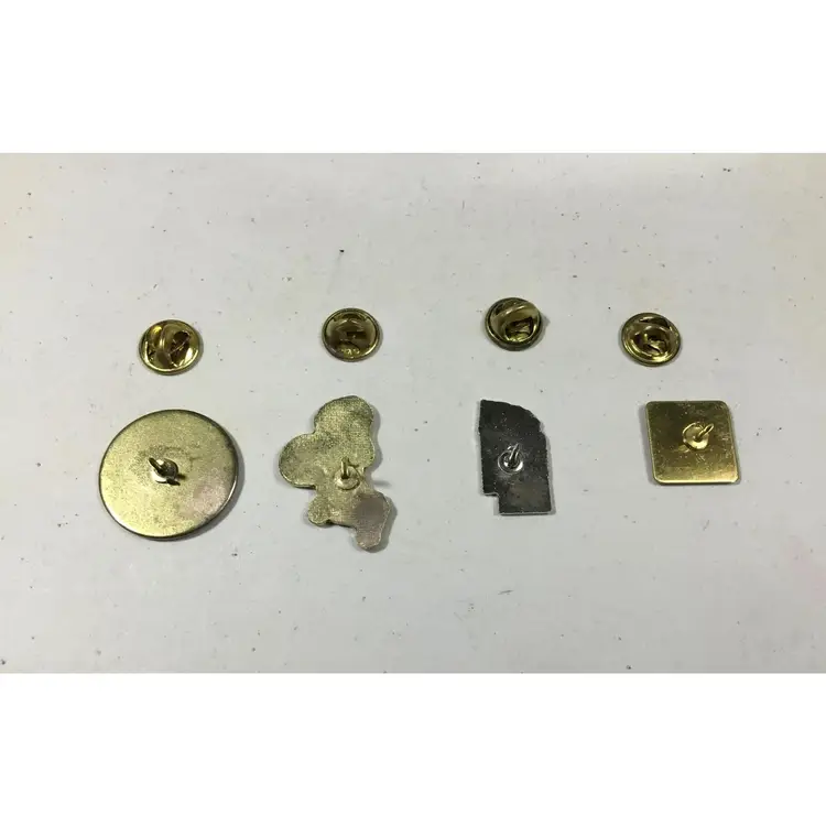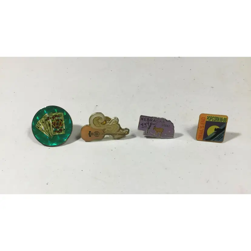 Generally 1" by 1" all enameled pins, one is Boy Scouts, one for card players, one is C & W band, one is Nebraska. All have butterfly clutch backs of metal. Textured metal on back of C & W pin. Other pins have some tiny scratches on the backs.
