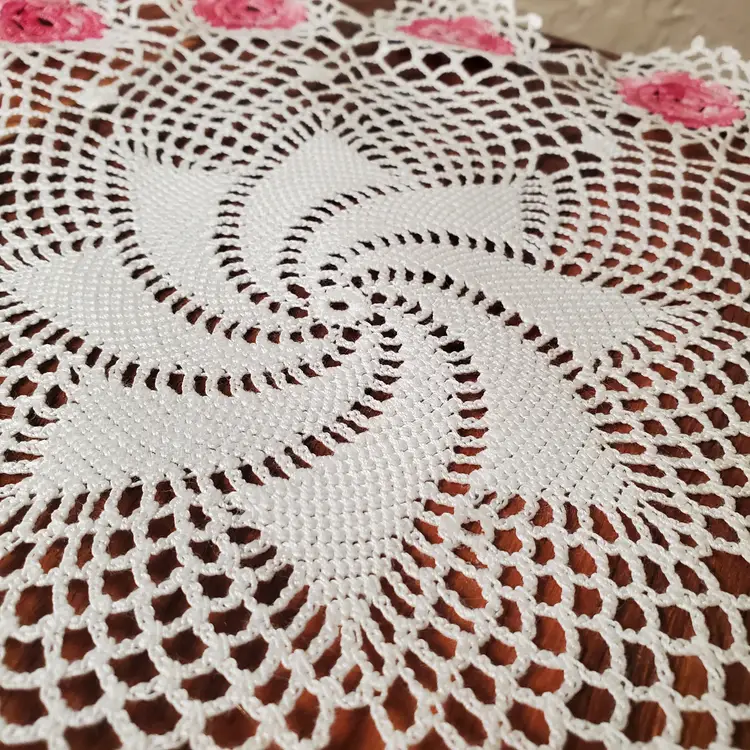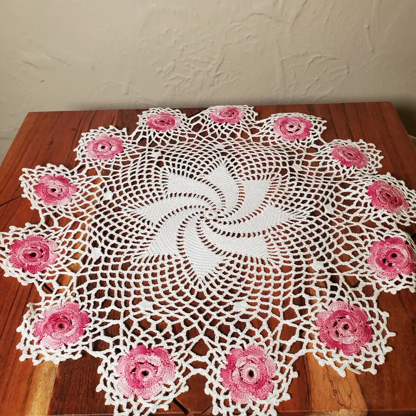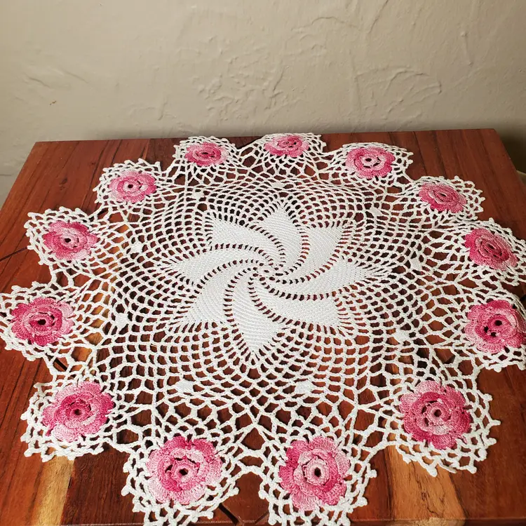 This pink and white crochet doily is in perfect condition. 11 3/4" diameter.