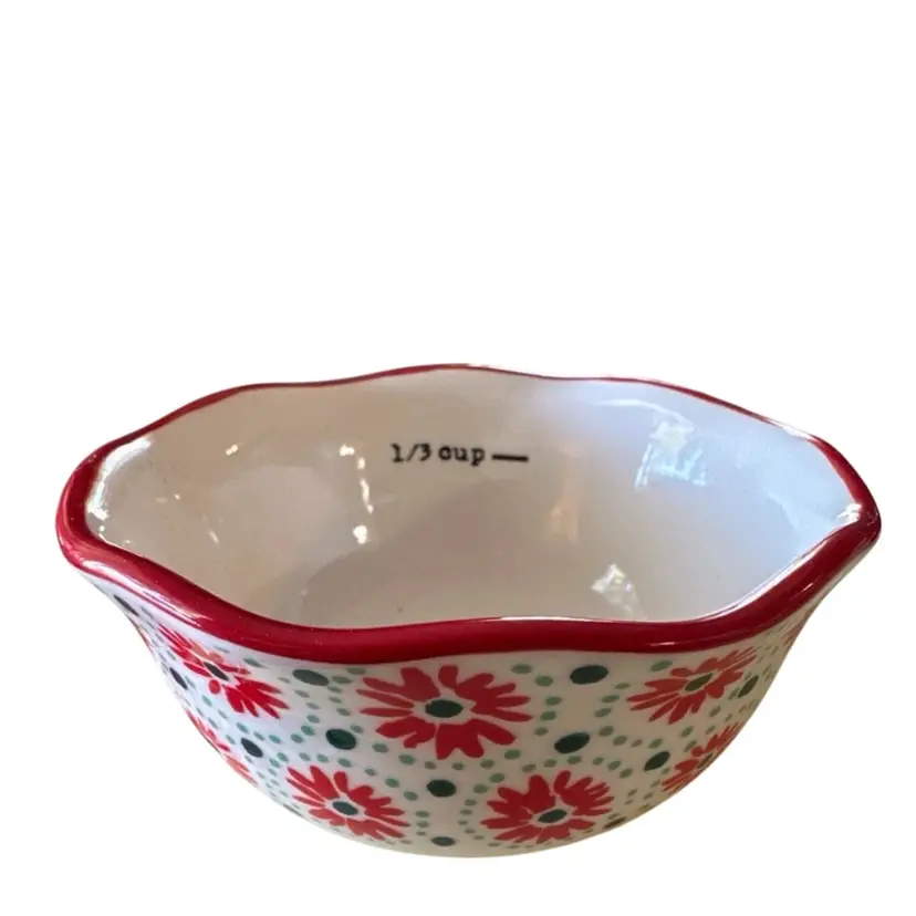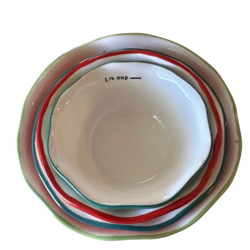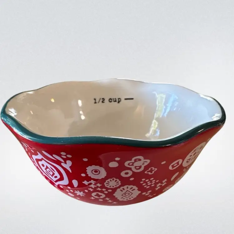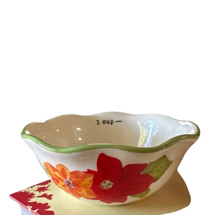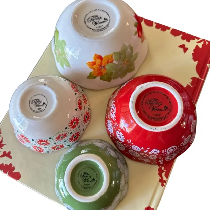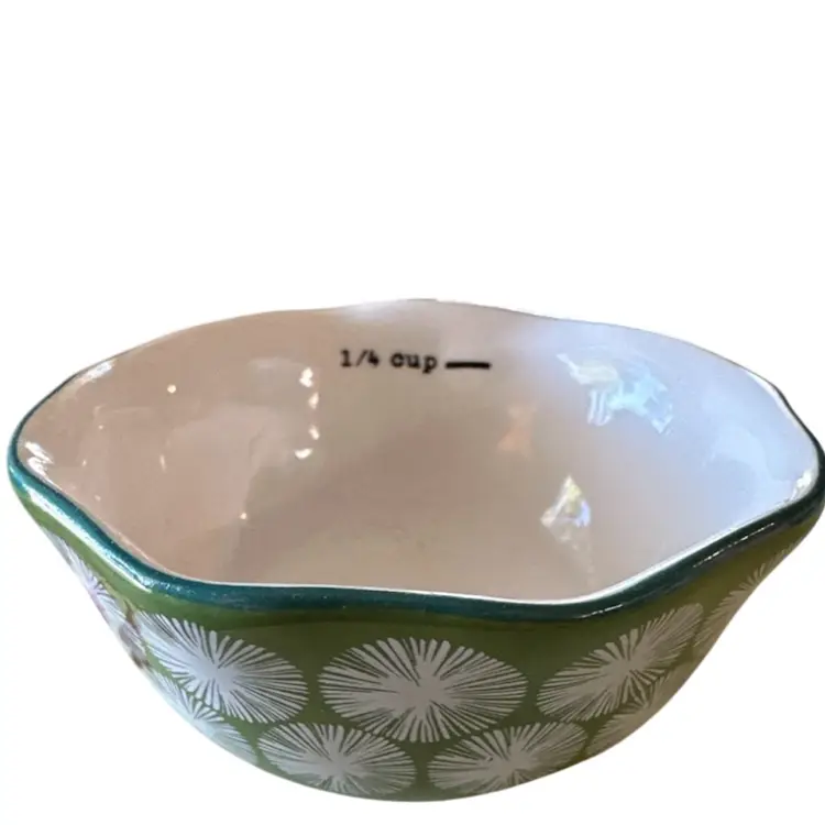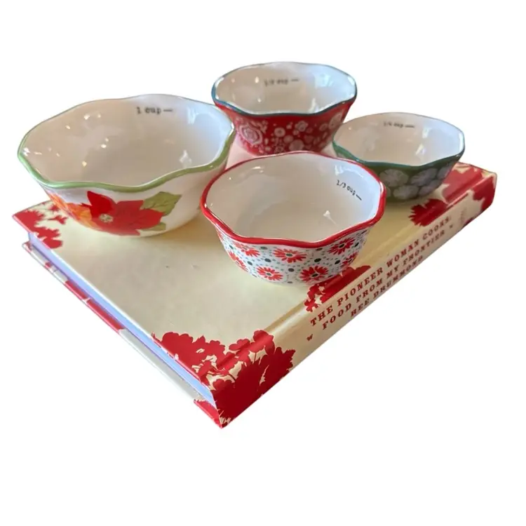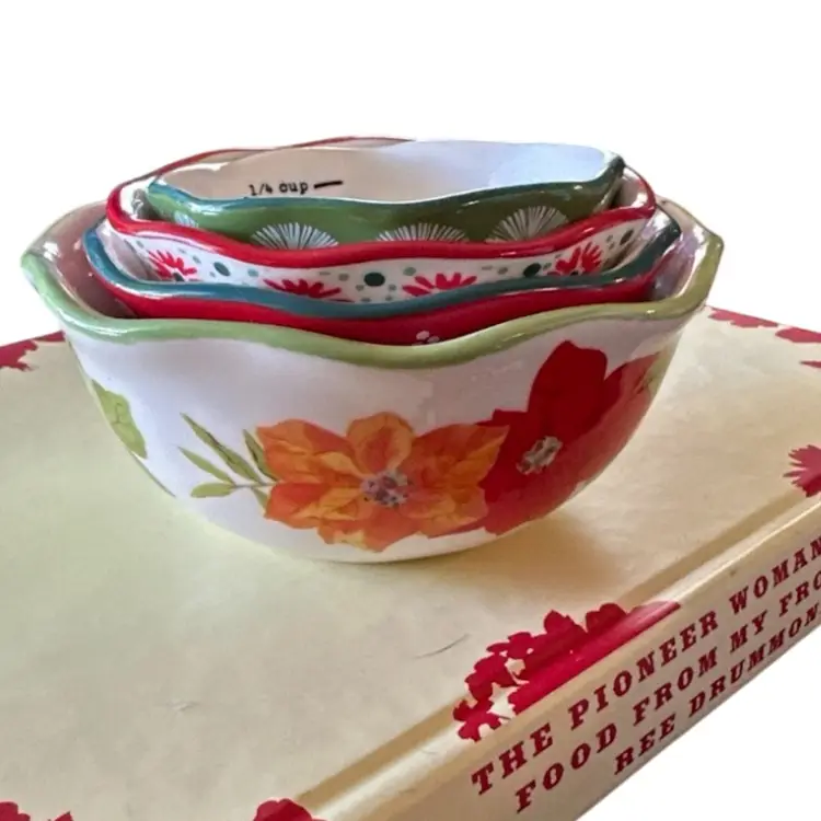 The Pioneer Woman 4 Piece Nesting Measuring Bowls set features a beautiful floral pattern on round stoneware ceramic bowls in multicolor. These measuring cups are perfect for all occasions and are universal in their food compatibility. The nesting design makes storage easy, and the Pioneer Woman brand ensures quality and originality. With measurements of 1 cup, 1/2 cup, 1/3 cup, and 1/4 cup, this set is a must-have for any kitchen. Excellent condition. Appear to have never been used.( Cookbook not included.)