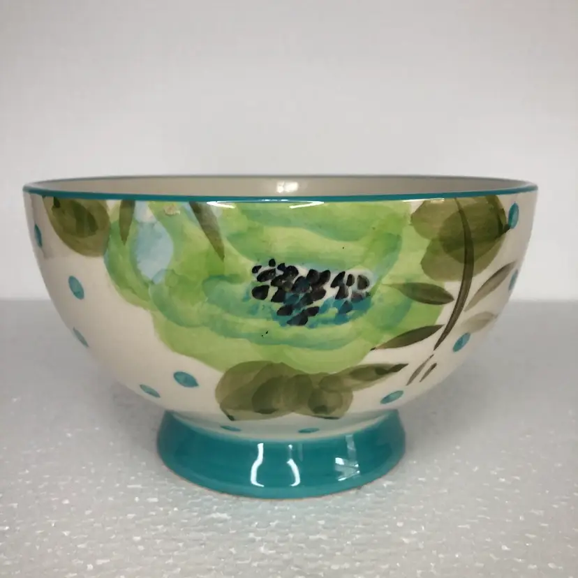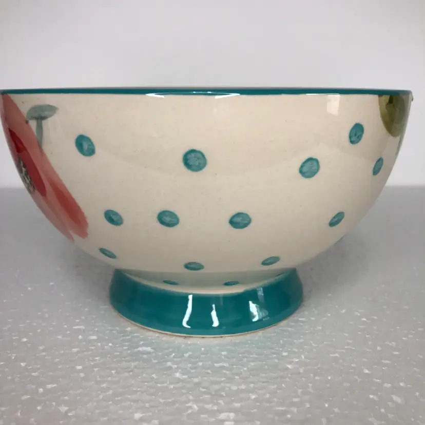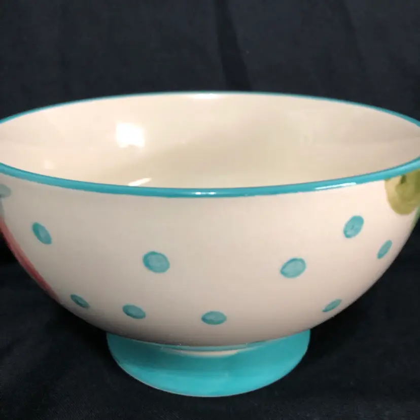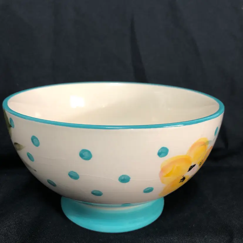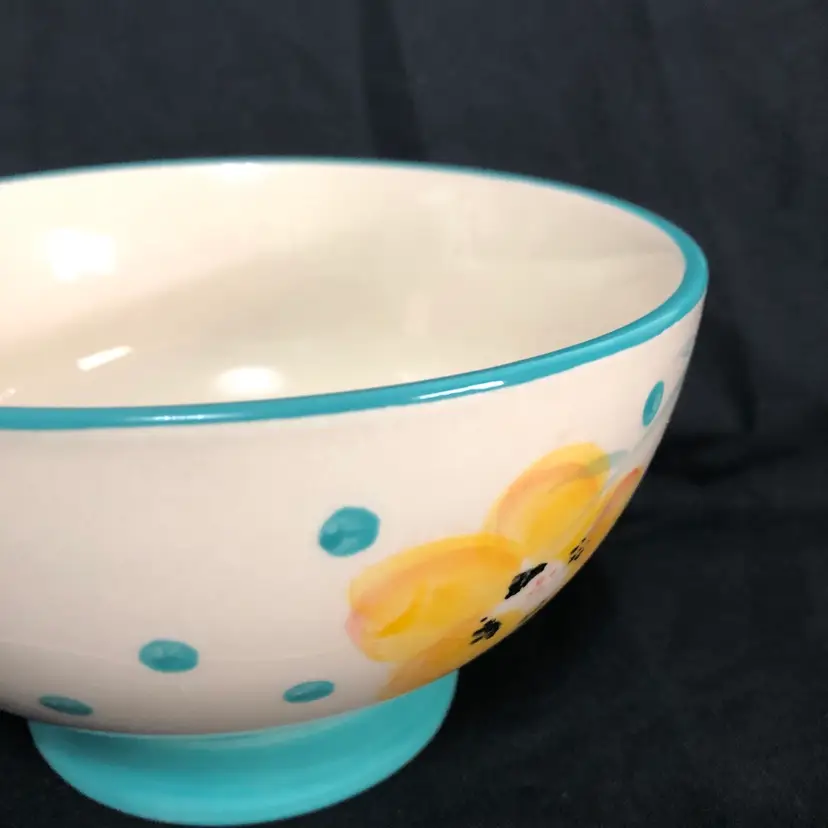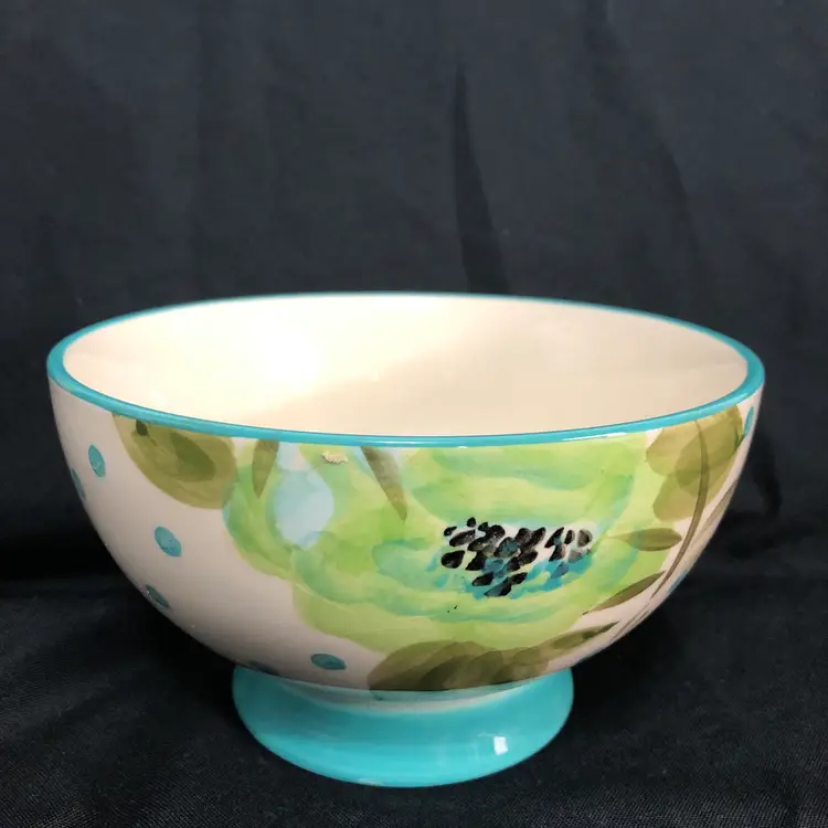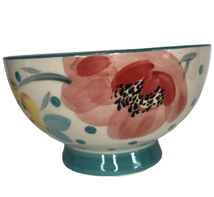 Beautiful Pioneer Woman Bloom Dots Footed Bowl in turquoise with a cheerful floral design.