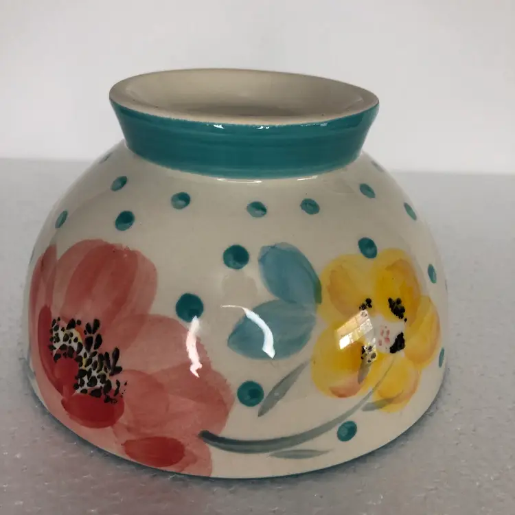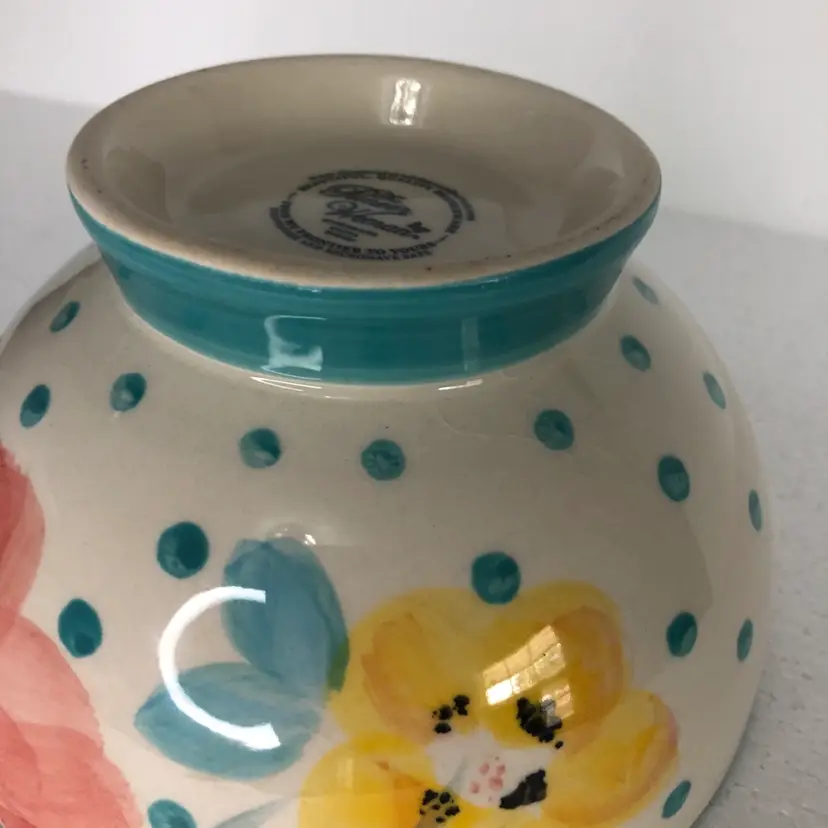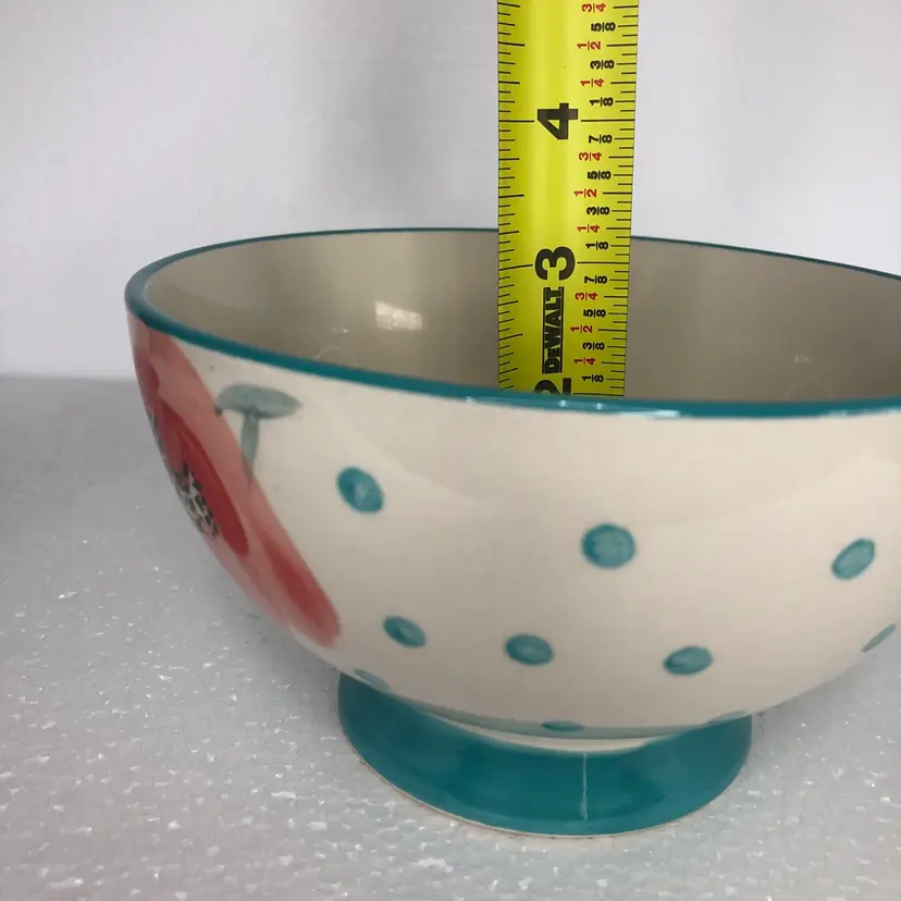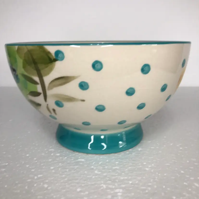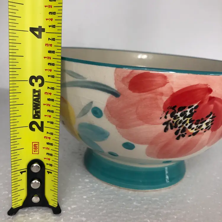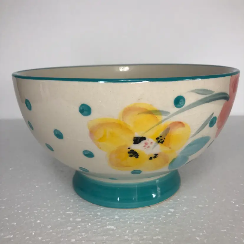 Beautiful Pioneer Woman Bloom Dots Footed Bowl in turquoise with a cheerful floral design.