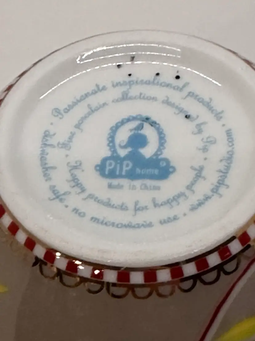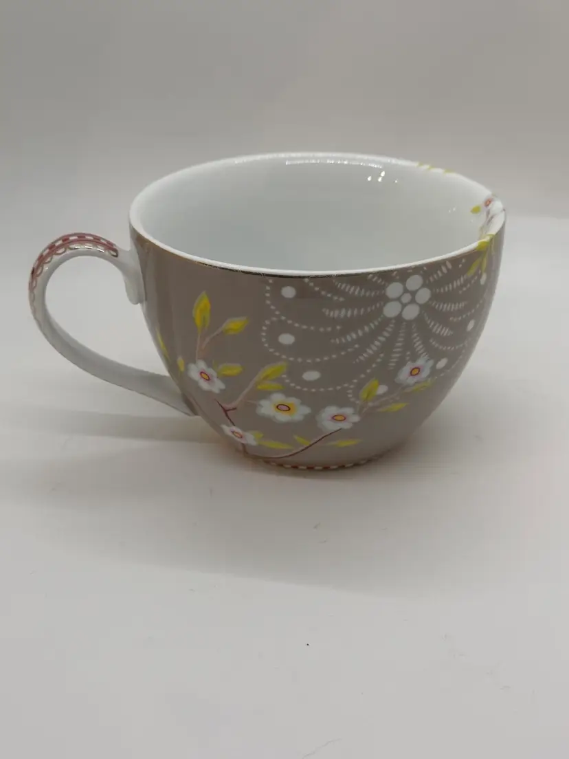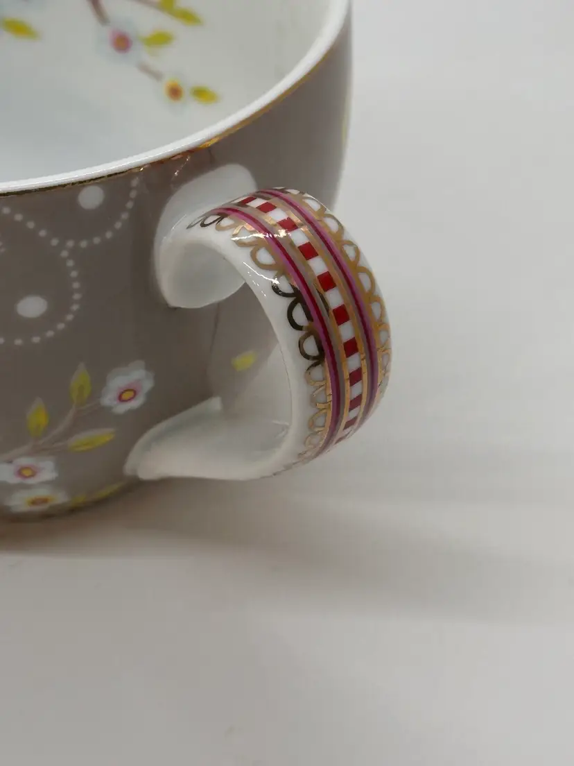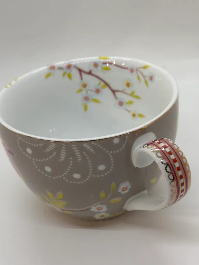 Pretty floral with the bird on it teacup made by Pip Home. Fine porcelain . stands 2 1/2 inches tall and 3 3/4 inches wide at top. No chips or cracks. Teacup only.