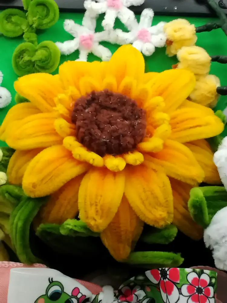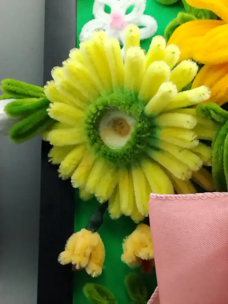 This handmade pipecleaner/chennile Stem Floral Bouquet is mounted on a 12x12 inch black wood frame that can be wall or flat surface display. Three large brilliant flowers are showcased in this arrangement, and surrounded buy accent flowers and a large whimsical bow. This was handmade by me.
