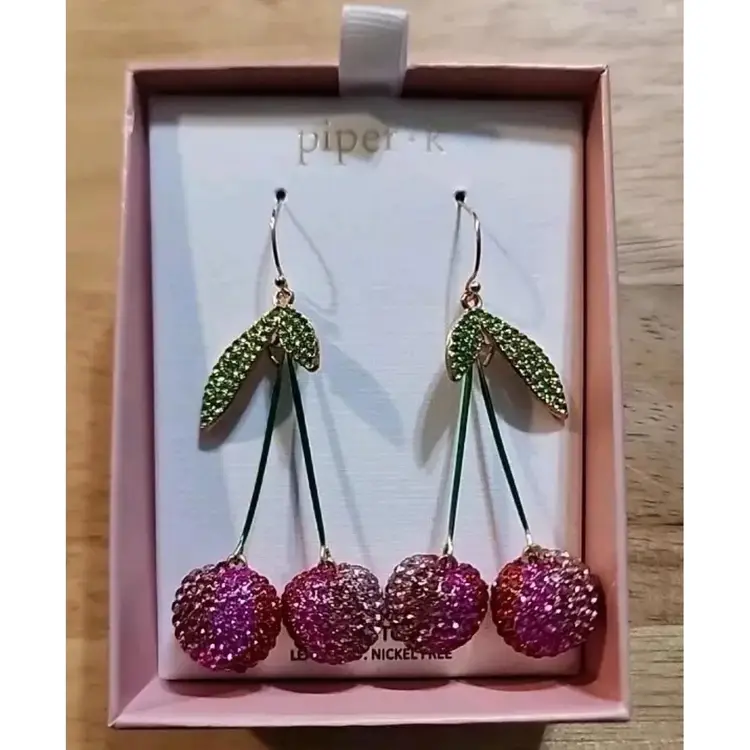 These Piper K earrings feature a fun fruit design with cherry-shaped glass stones hanging from a gold-tone base. The earrings are dangle/drop style, with a length of 2 inches. The multicolor stones add a sparkly touch to the overall aesthetic, making them a playful and stylish accessory for any outfit.