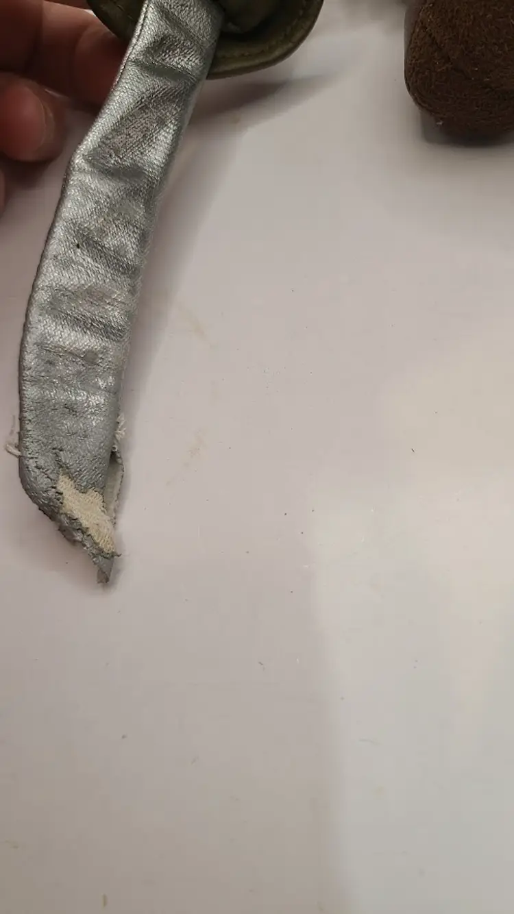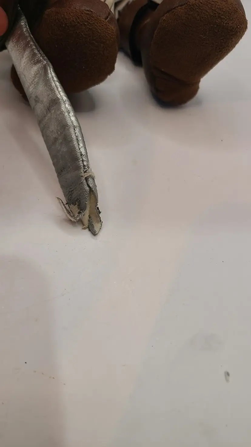 The fake leather fabric on the shoes and sword have quite a few small sections that have peeled off