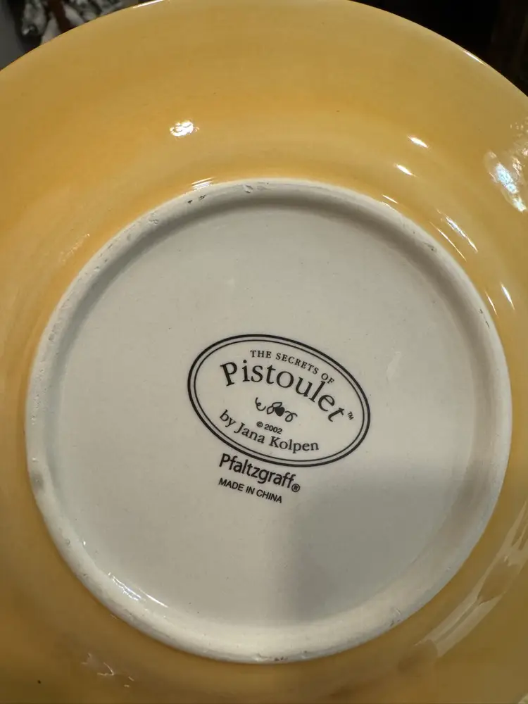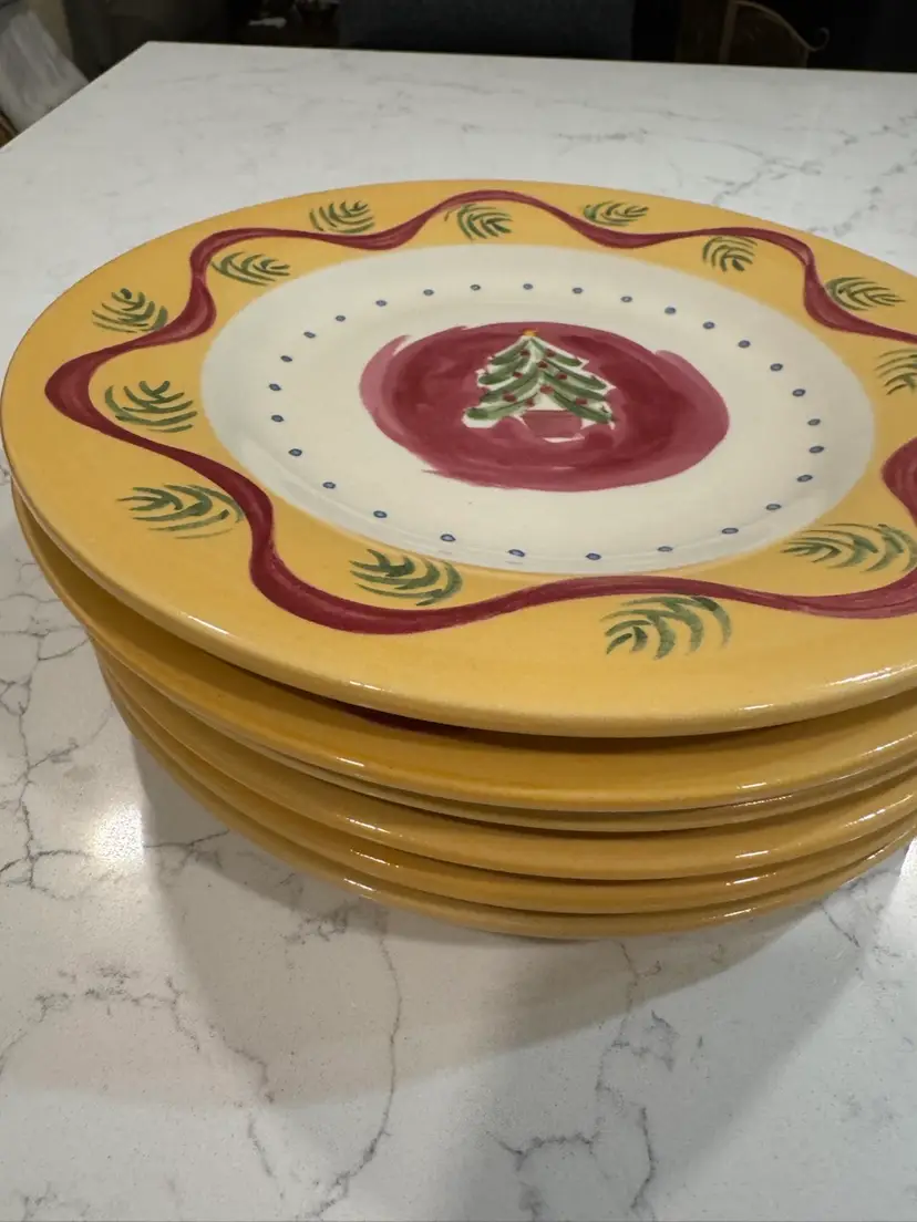 Featuring a charming holiday tree design at its center, surrounded by a red ribbon and green foliage border on a warm yellow rim. These plates are perfect for serving salads, desserts, or small appetizers during the holiday season. Made by the renowned brand Pfaltzgraff, known for its durable and delightful dinnerware. Excellent pre-owned condition, ready to bring cheer to your celebrations.