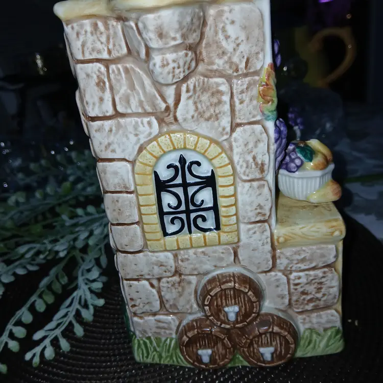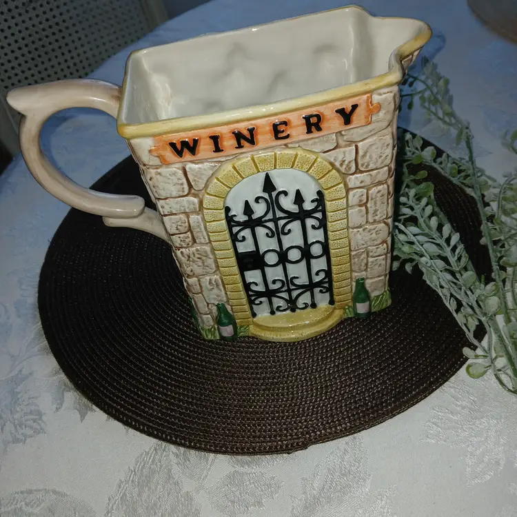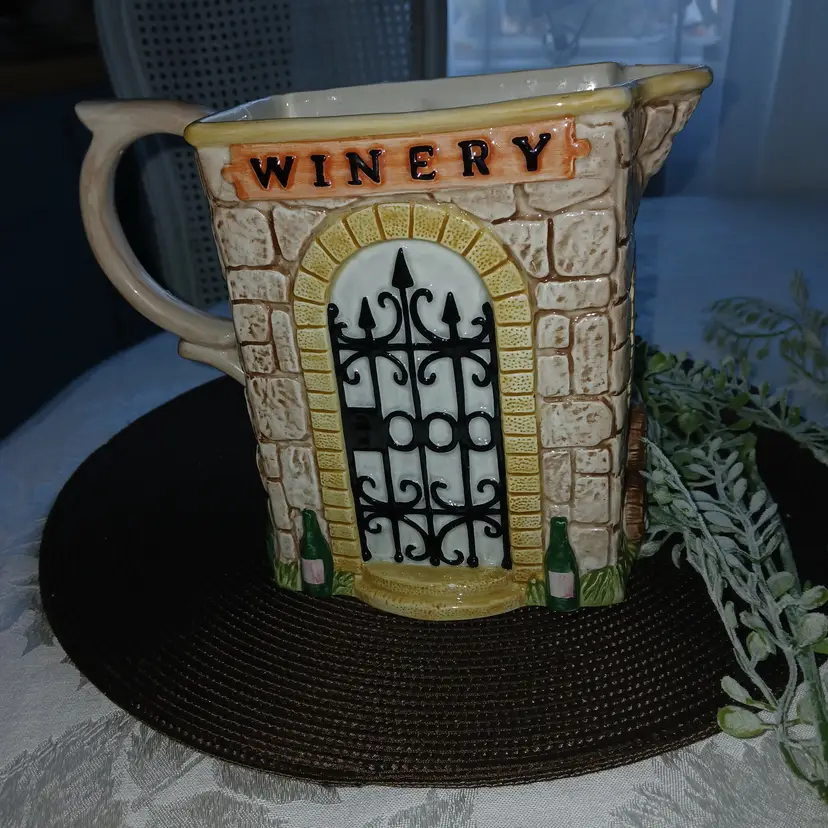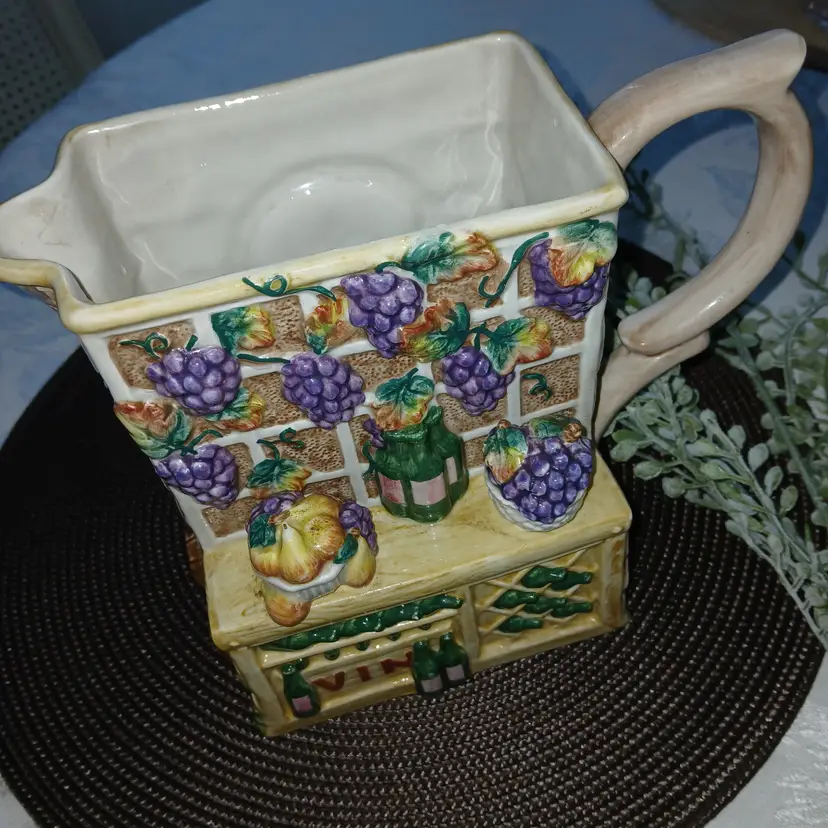 Pitcher from the Omenibus series by Fitz and Floyd Beautiful grape vineyard design. Would be great with greenery on a table. 1.75 qt. And 7" tall 9" wide from 1996.