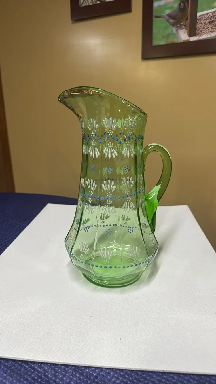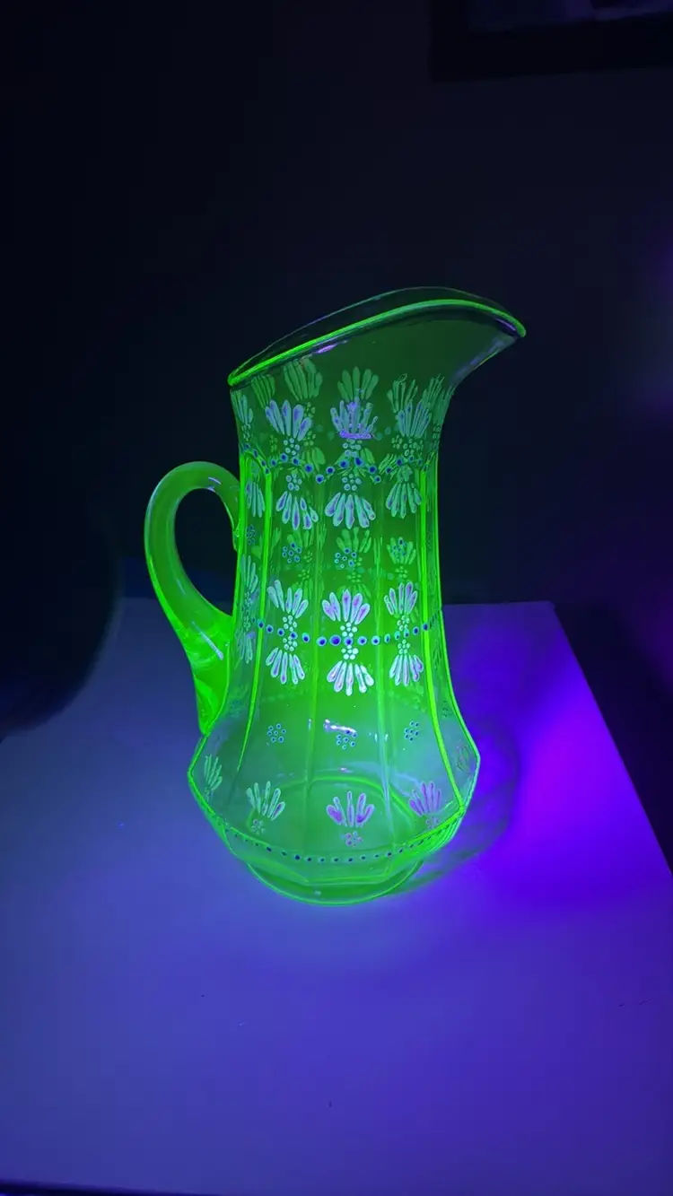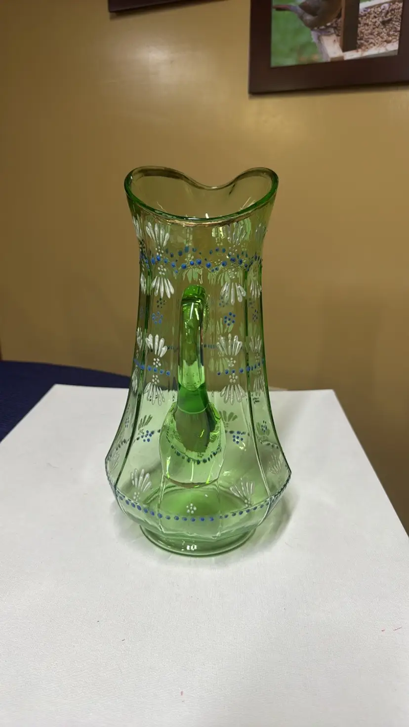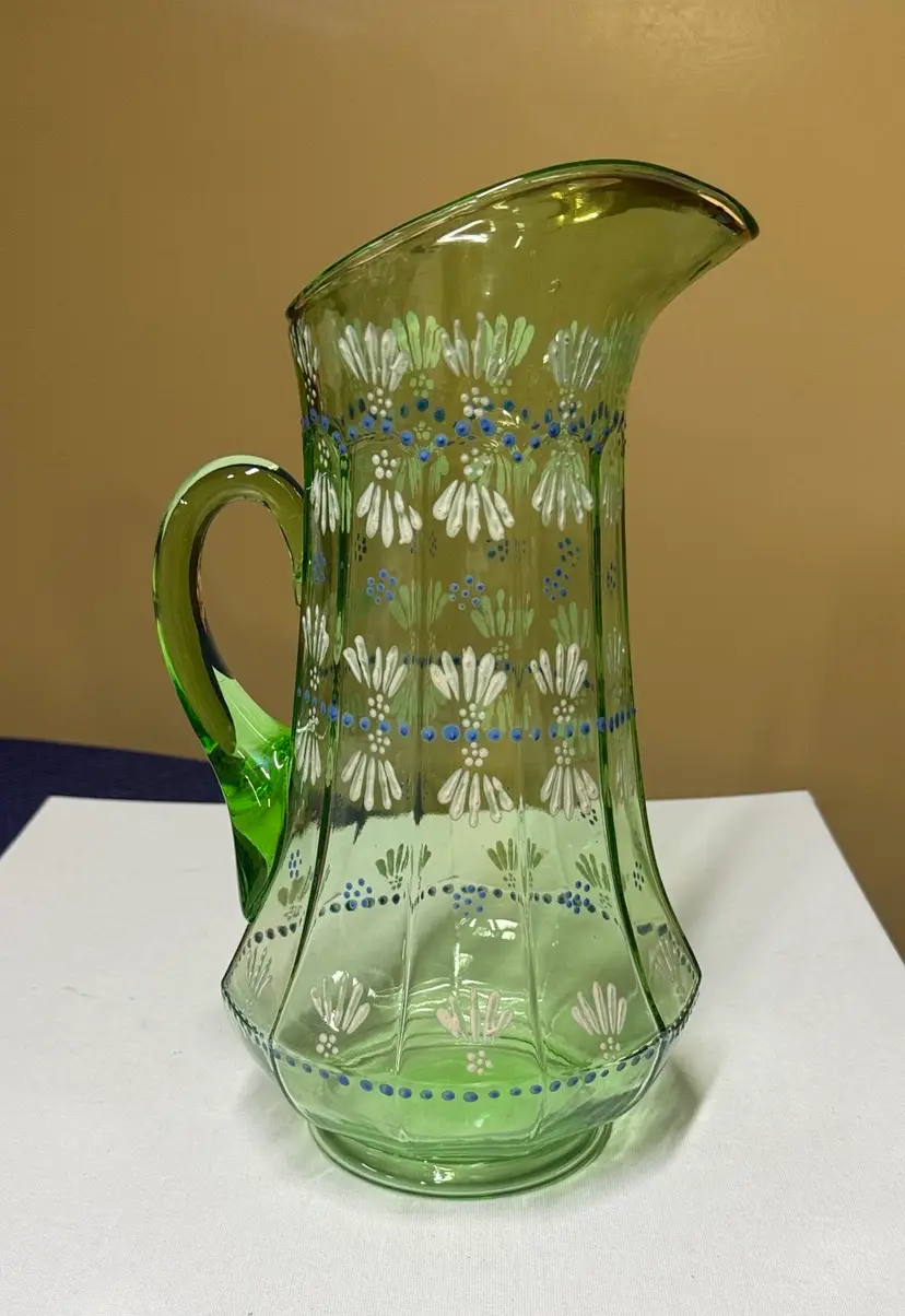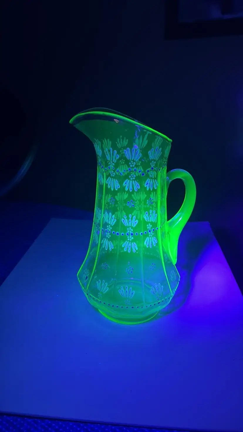 Pitcher tall hand painted uranium glass paneled 11.5” tall Glows vibrantly under black light This elegant green glass pitcher features a delicate floral design, perfect for adding a touch of sophistication to your home decor. The intricate patterns and vibrant color make it a standout piece for any room. Excellent condition with no breaks or chips (9028192525w2121)