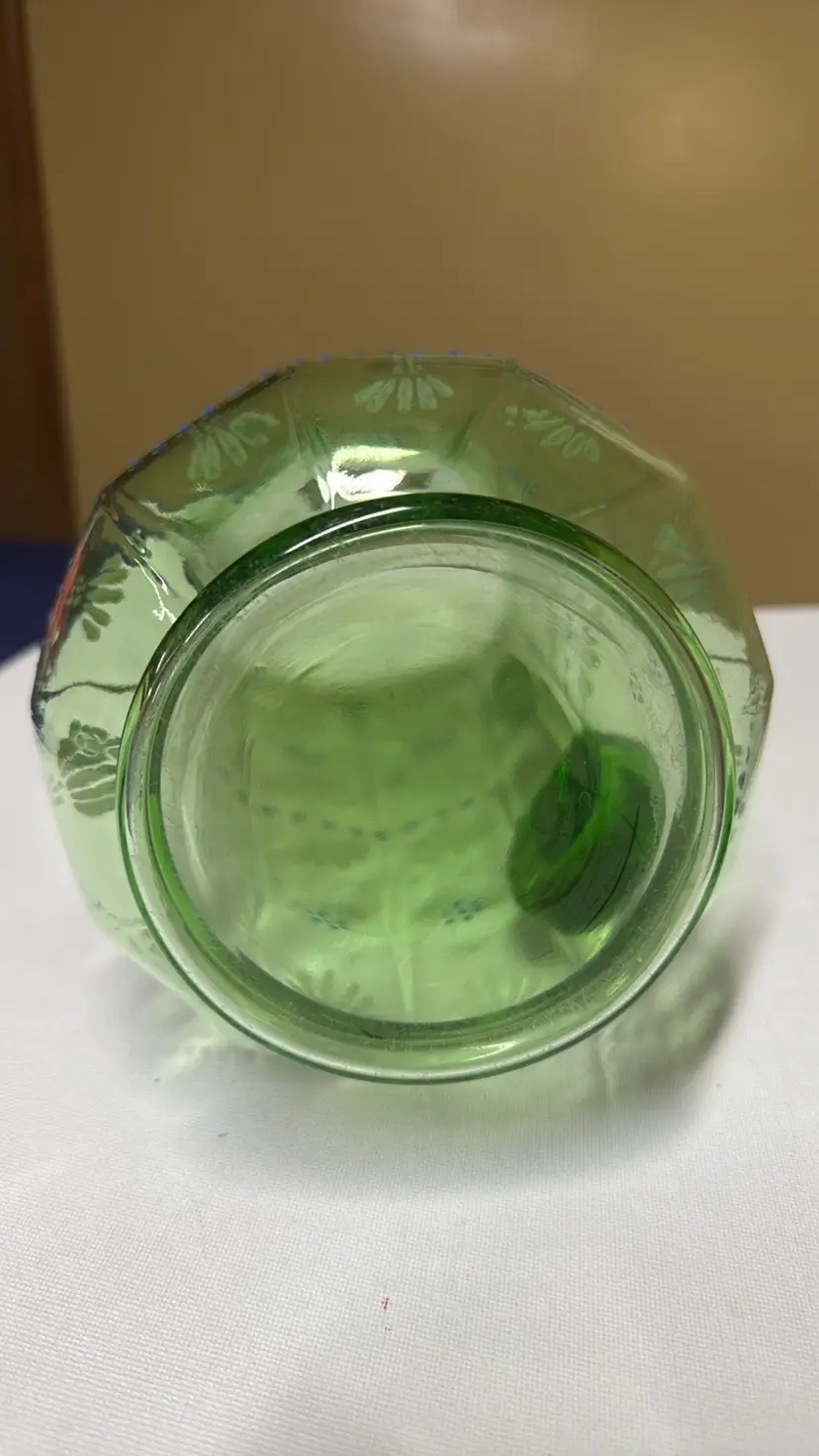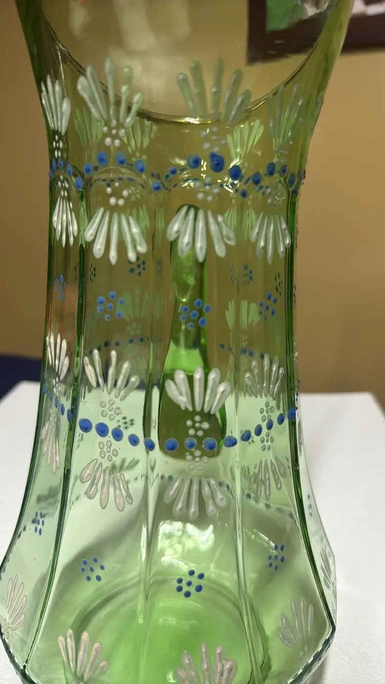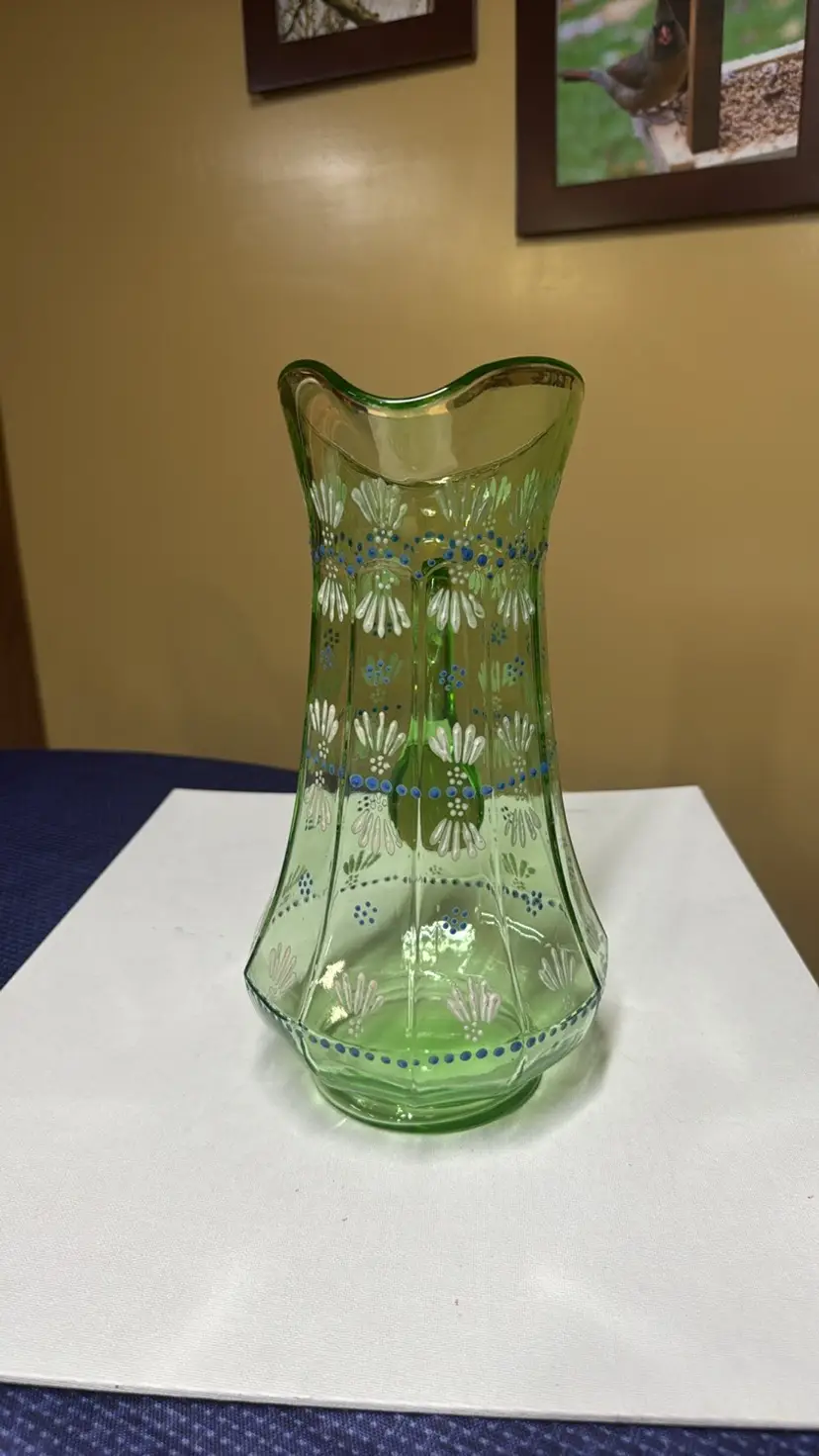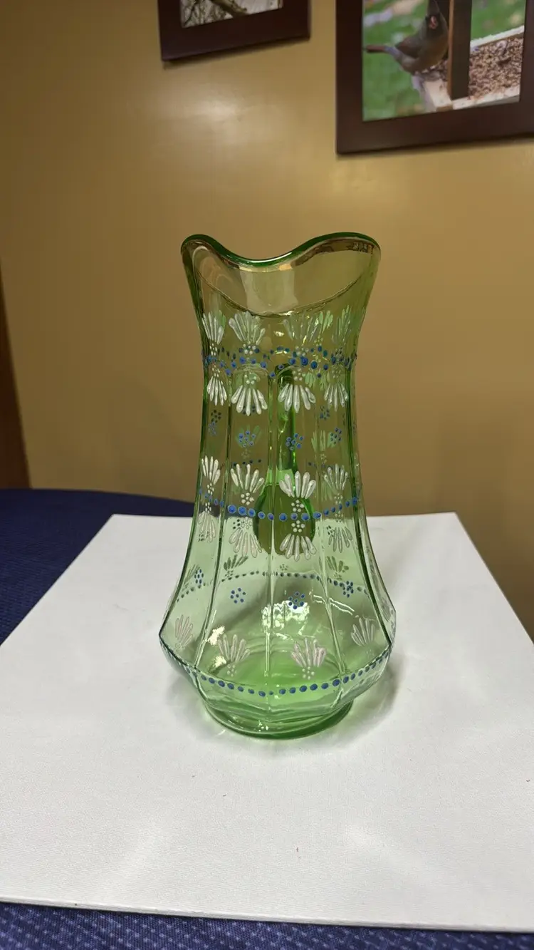 Pitcher tall hand painted uranium glass paneled 11.5” tall Glows vibrantly under black light This elegant green glass pitcher features a delicate floral design, perfect for adding a touch of sophistication to your home decor. The intricate patterns and vibrant color make it a standout piece for any room. Excellent condition with no breaks or chips (9028192525w2121)