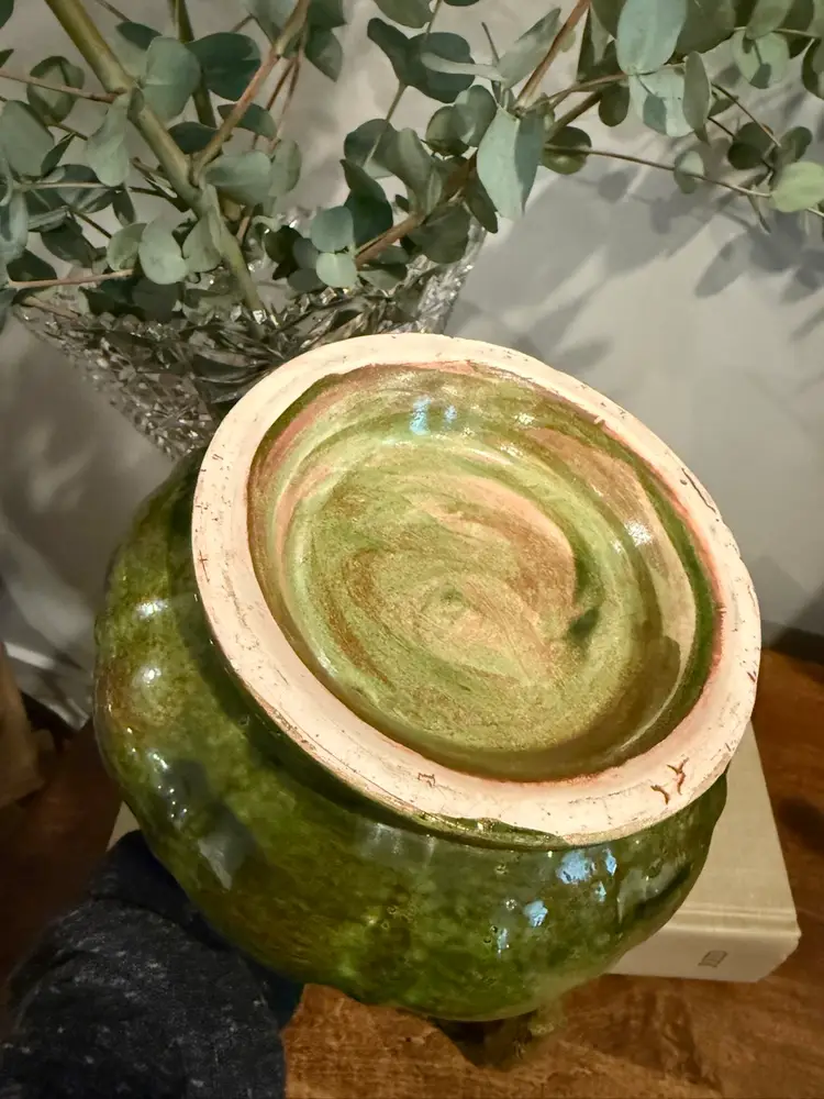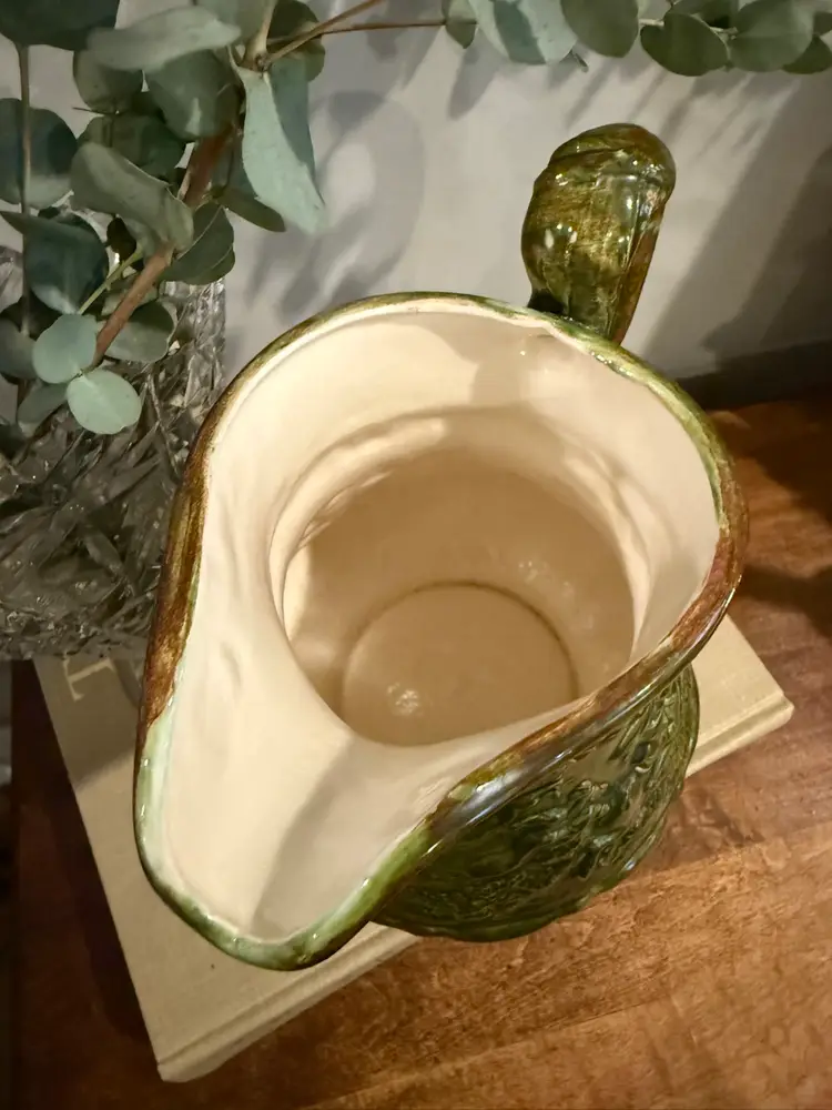 Vintage pottery pitcher from 1968 featuring the classic tavern scene. This decorative jug stands out with its rich green glaze, detailed embossed figures, and rustic charm, making it a unique collectible or display piece. The intricate design depicts various characters in a lively tavern setting. Handcrafted from ceramic, this piece exhibits excellent pre-owned condition without any cracks or major chips. The bottom shows slight wear consistent with age, but otherwise presents beautifully. Perfect for lovers of vintage decor or unique pottery.