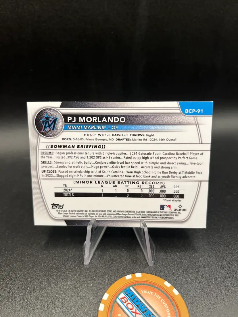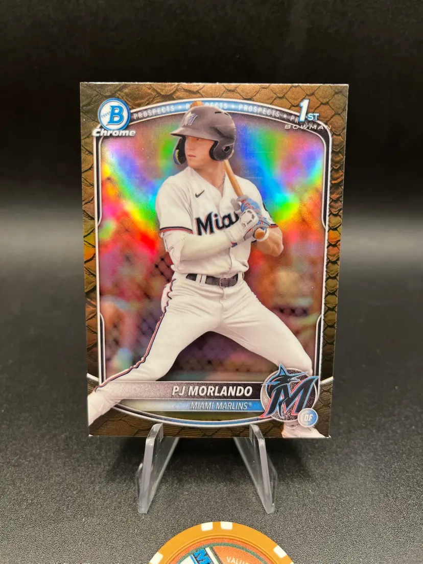 2025 Bowman PJ Morlando Reptilian chrome parallel. Miami Marlins. A bit of a soft corner.