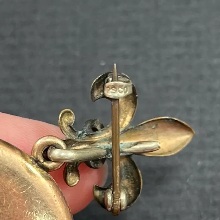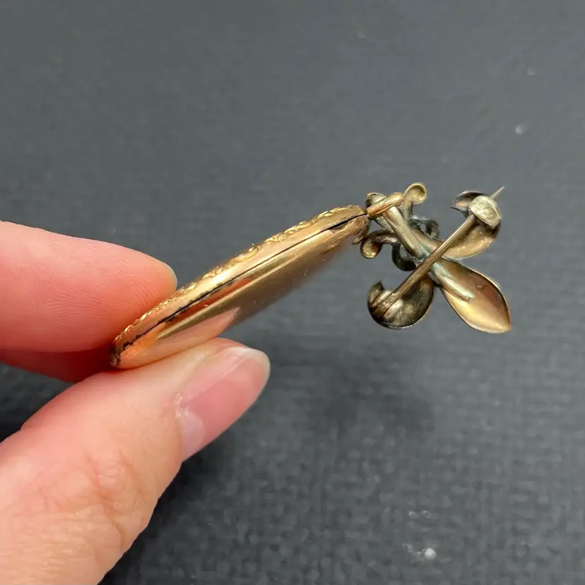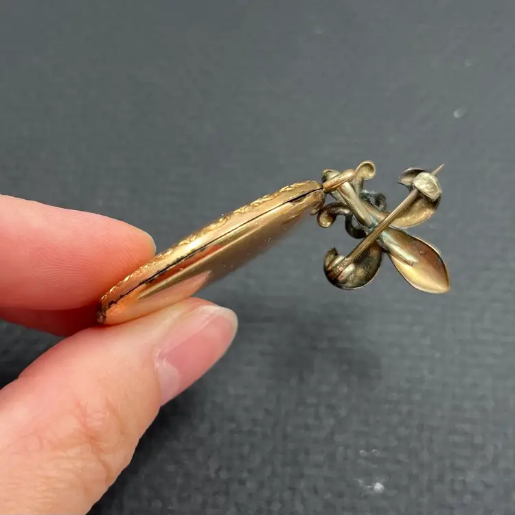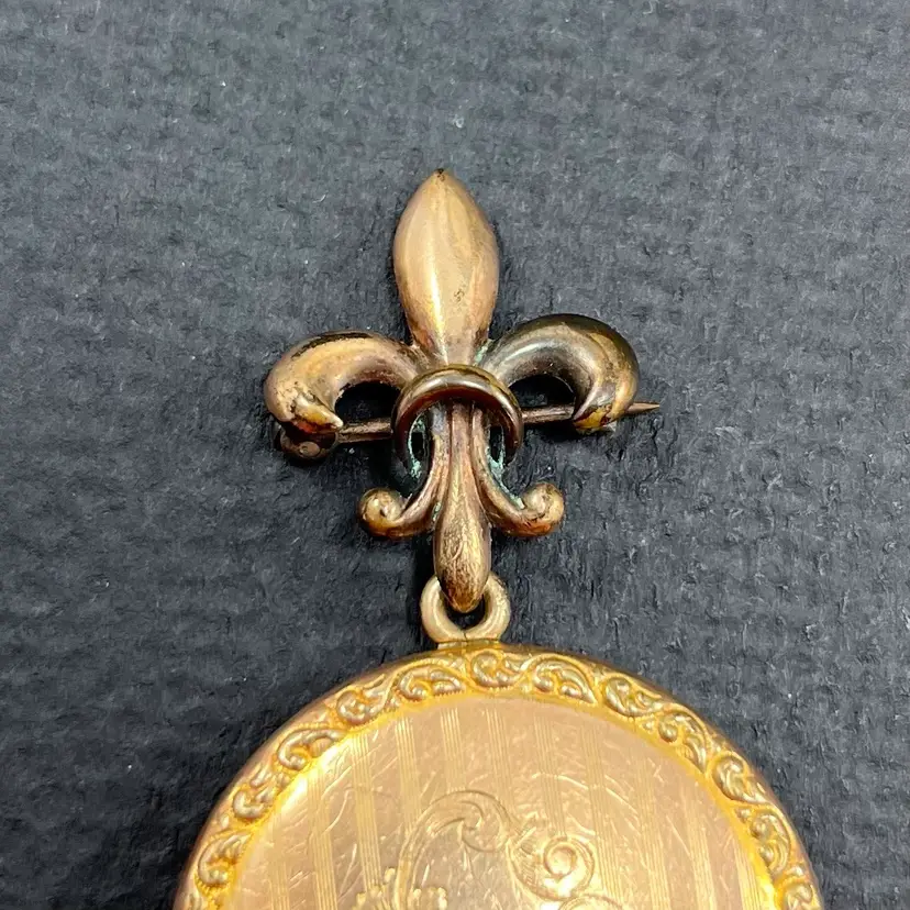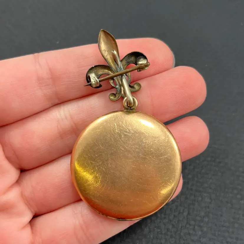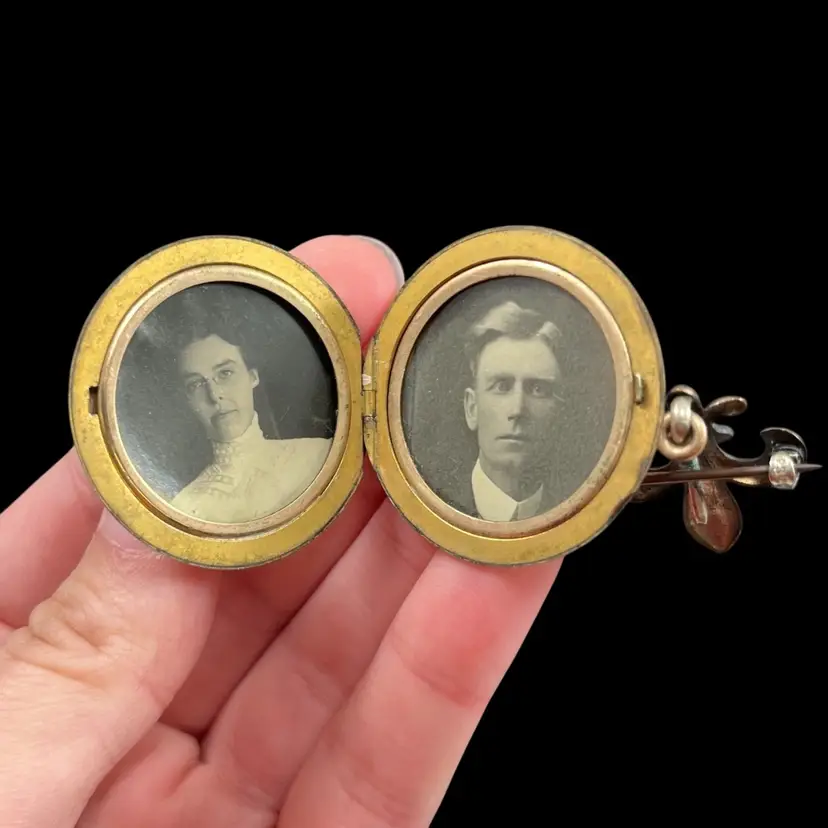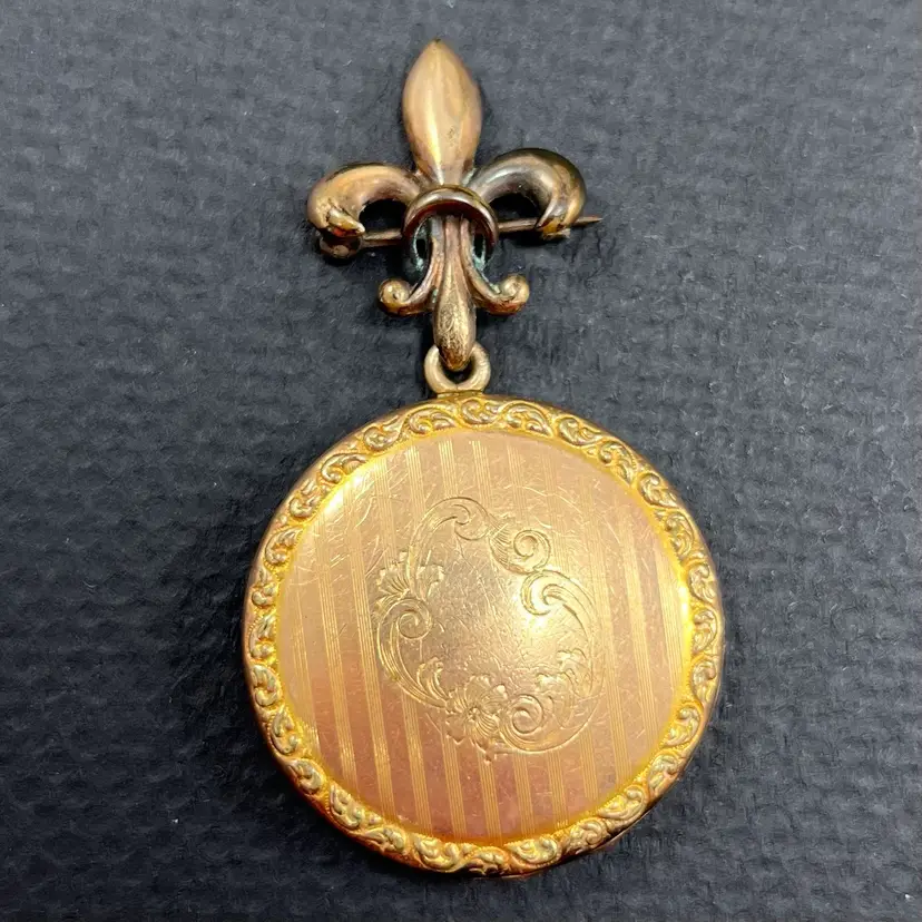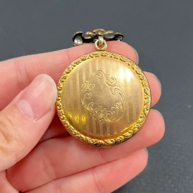 Approximately 2.5” long with locket being just under 1.5” diameter. In used condition with patina/wear to metal and some surface scuffing. Please see photos. Marked PSCO for Plainville Stock Co. out of Plainville, MA. Possible eras: с.1896, с.1915, с. 1934, с.1950, с.1943