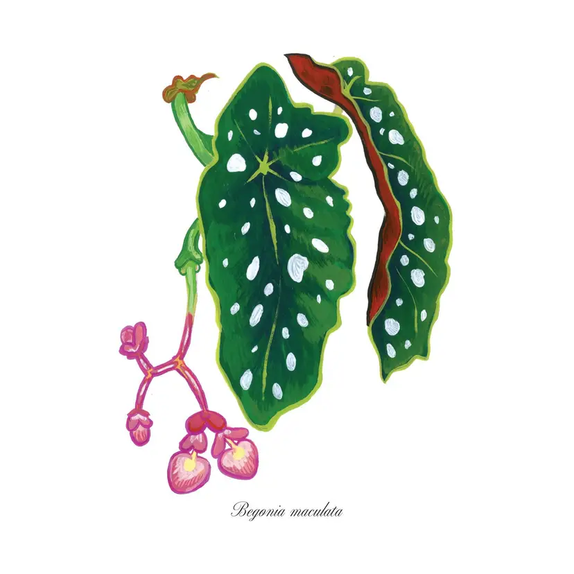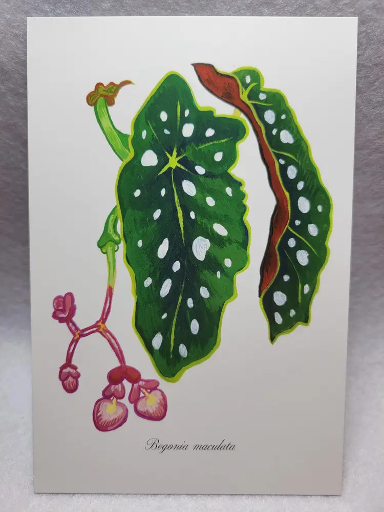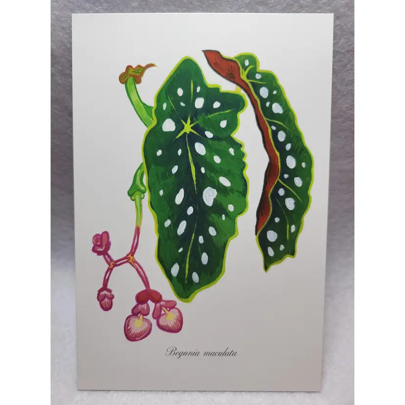 4"x6" prints of gouache botanical illustrations of beloved begonia varieties. Coated front with blank, uncoated back. Each plant is identified with its binomial.