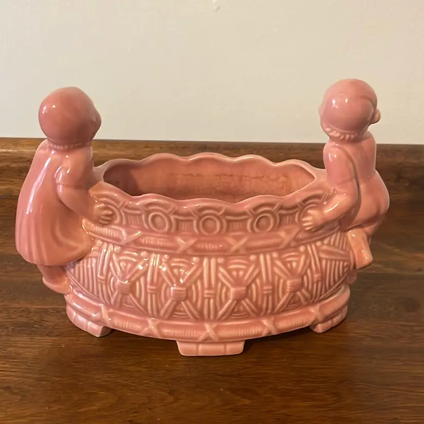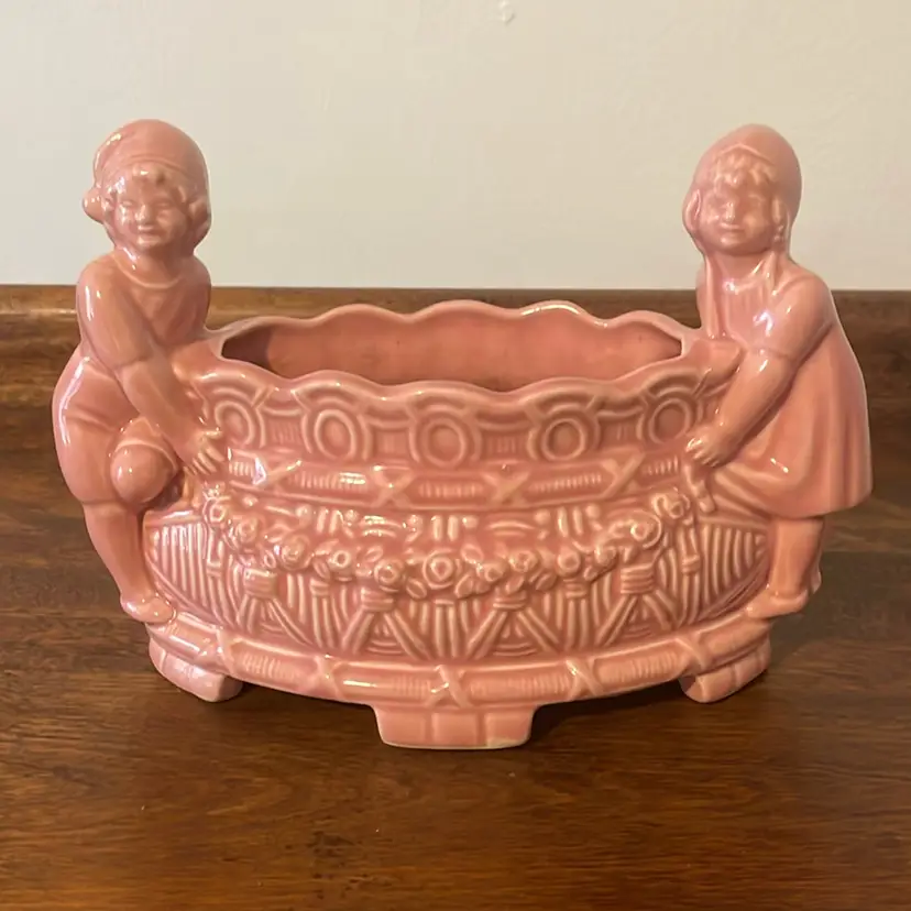 Planter Boy and Girl Dutch Sweethearts Vintage Pink Mid Century. 9” x 8”. No chips or cracks. Does have crazing. See photos. J400