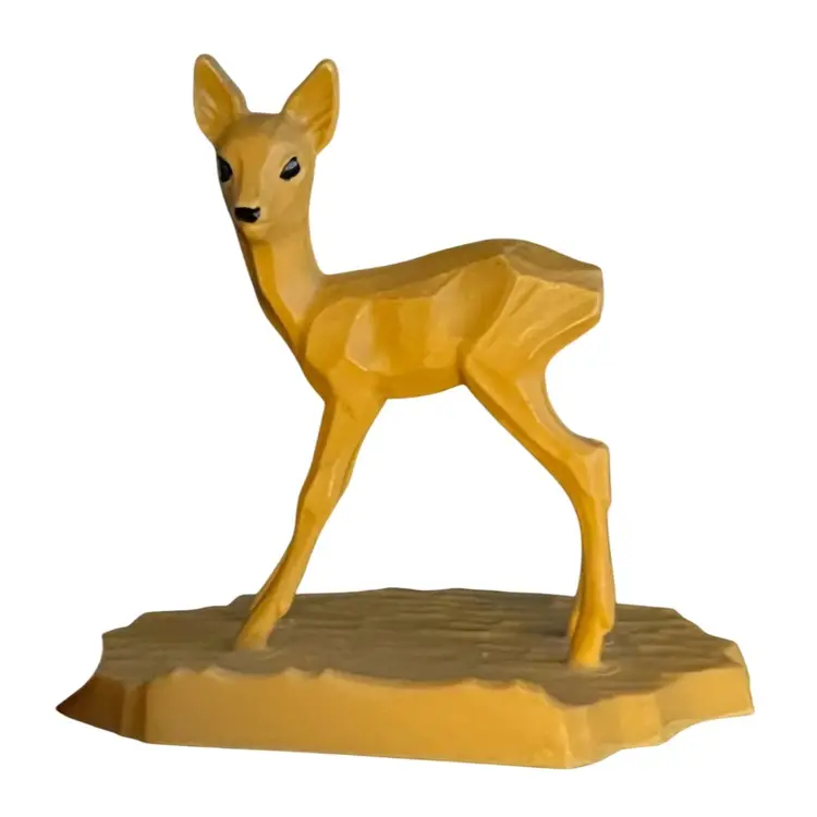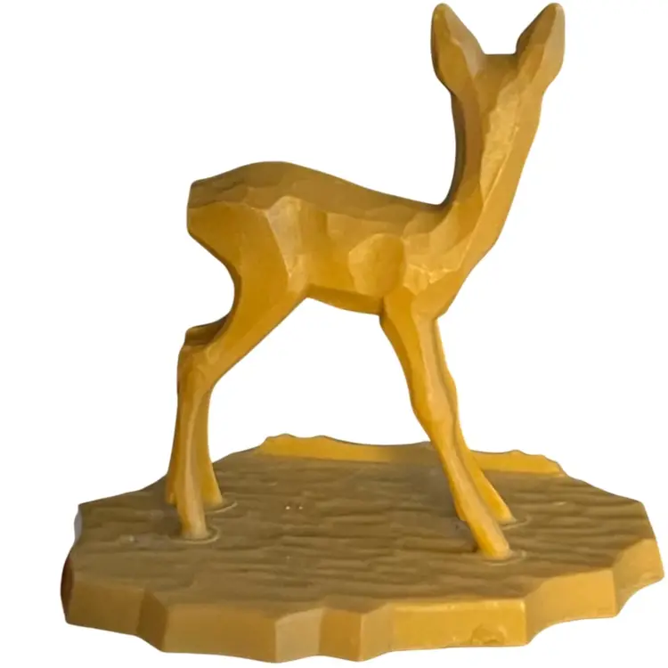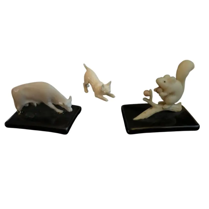 One plastic bull on black base (3/4 in. tall, 1 1/4 in. wide), one plastic squirrel on black base (1 in. tall, 1 1/4 in. wide), 1 stone dog (1 in.), and 1 plastic deer on platform (2 in.)