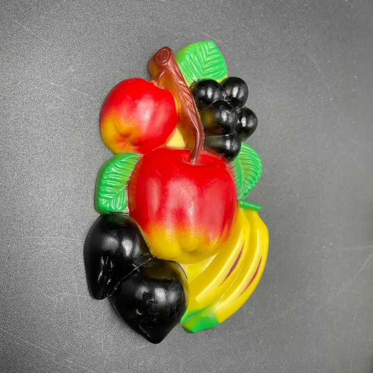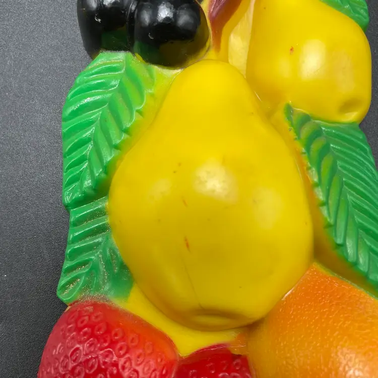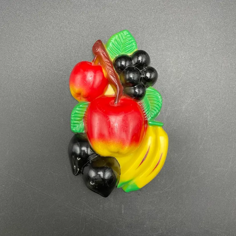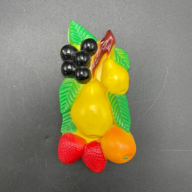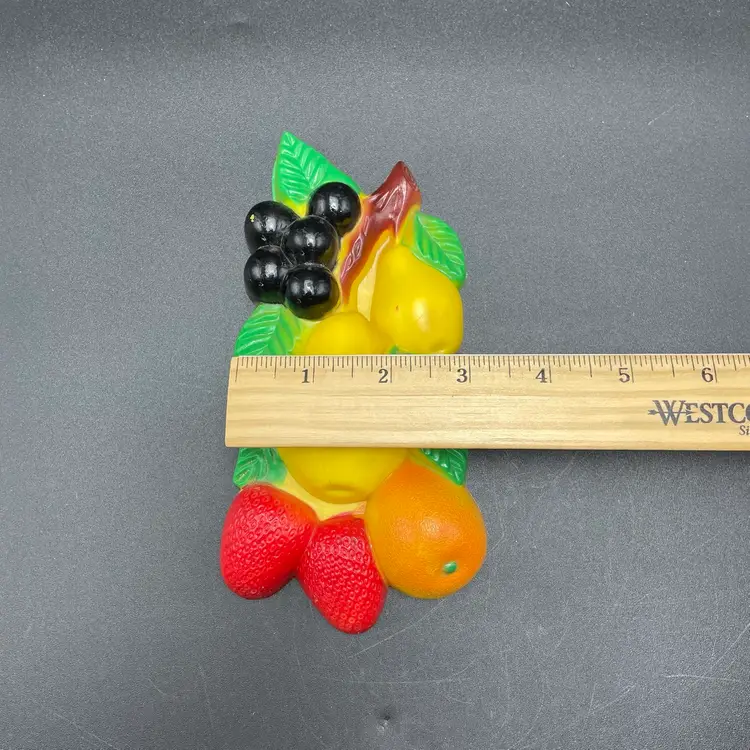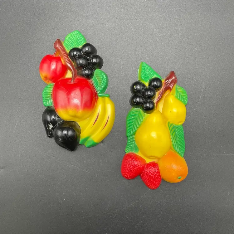 This is a vintage set of 2 plastic bunches of fruit magnets/wall hangings. The magnets are not very strong. Each measure approximately 7" long x 3.5" wide. There is some wear due to age and use as shown in pictures. No chips or cracks.
