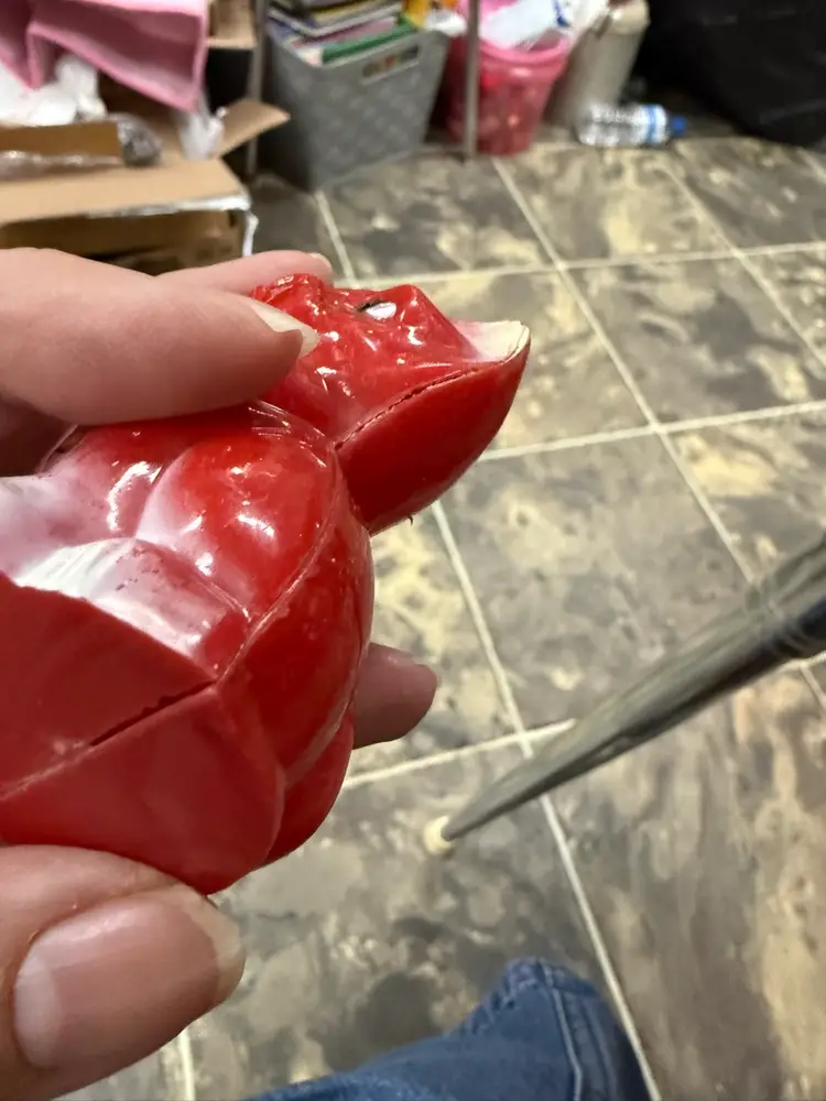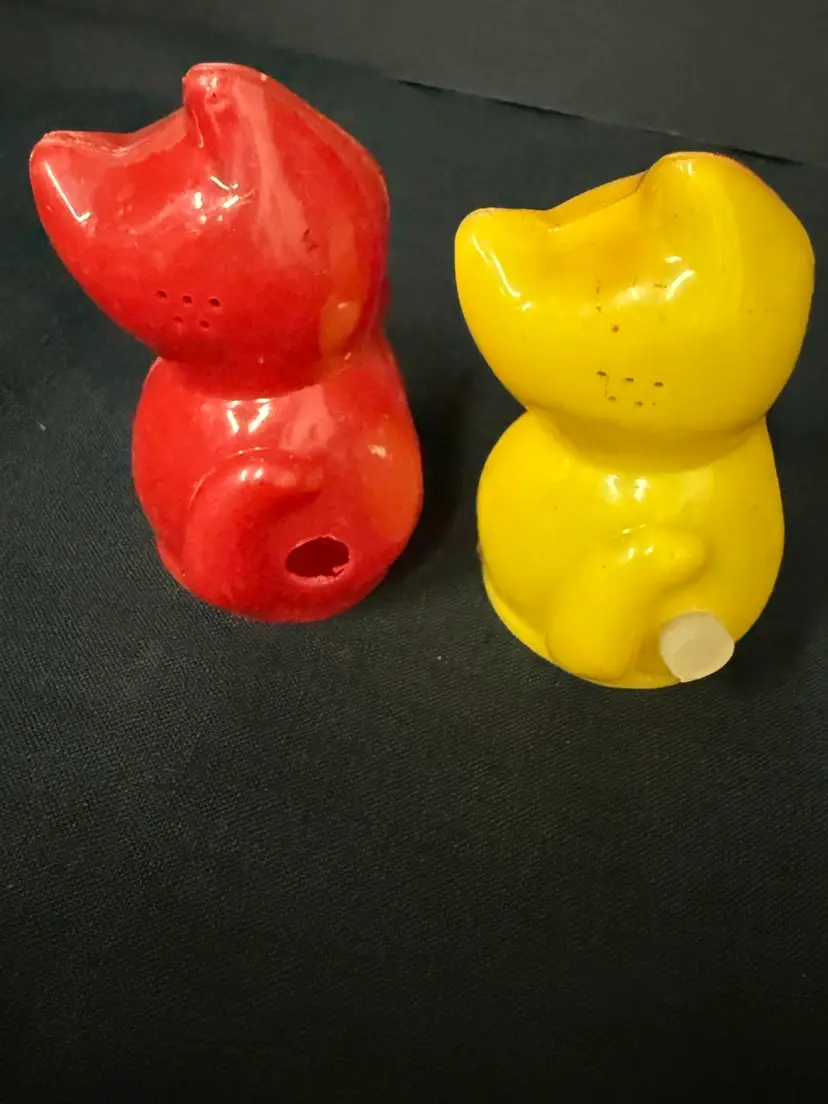 Hard plastic, possibly celluloid salt and pepper shakers. Dates around 1950’s. Made in Japan. Missing one stopper and the pepper has a seam coming apart as shown. I refund overage on shipping.