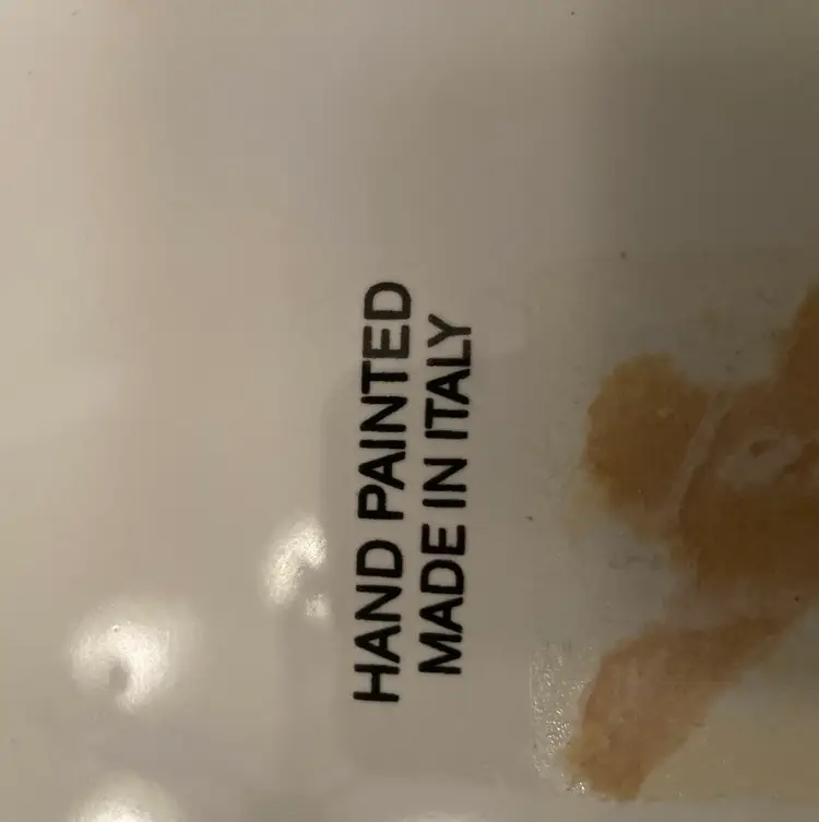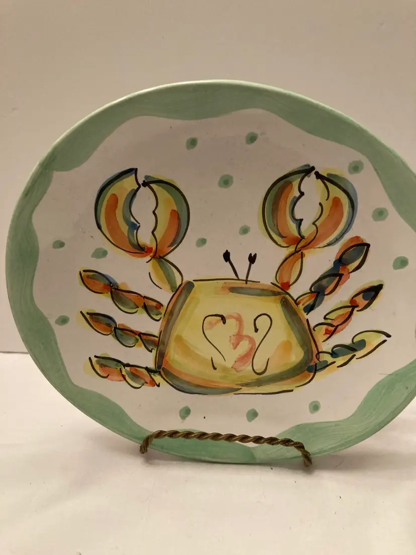 This colorful plate is 8.5” long and 7.5” wide. It has a concave oval shape. No chips or crack but there is some sticker residue on the back.