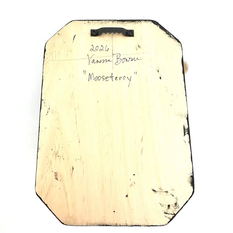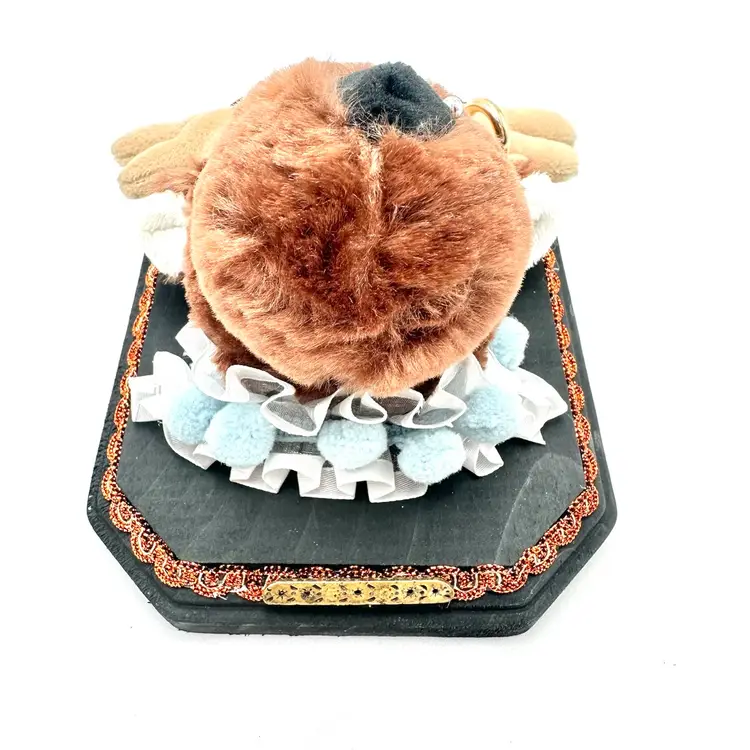 Repurposed plush moose decapitated and mounted on a wood plaque Measures 5 x 7” adorned with fancy trim, pompom collar, and repurposed jewelry Named “Moos-terry,” like mystery, sort of Saw tooth hanger attached for hanging One of a kind