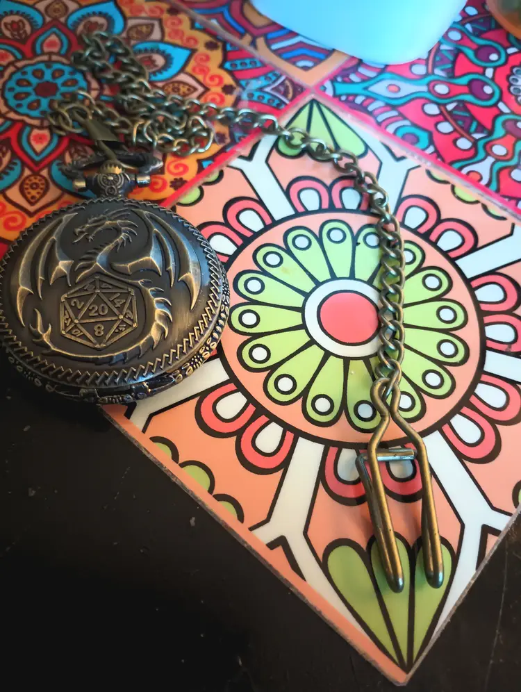 Pocket watch dice charm a auniqueblend of time and chance, this pocket watch features a vintage design filled with colorful multi sided dice. Attached to a sturdy belt clip,it comes with a chain for easy attachment and portability,making it a perfect gift for gamers and collectors.