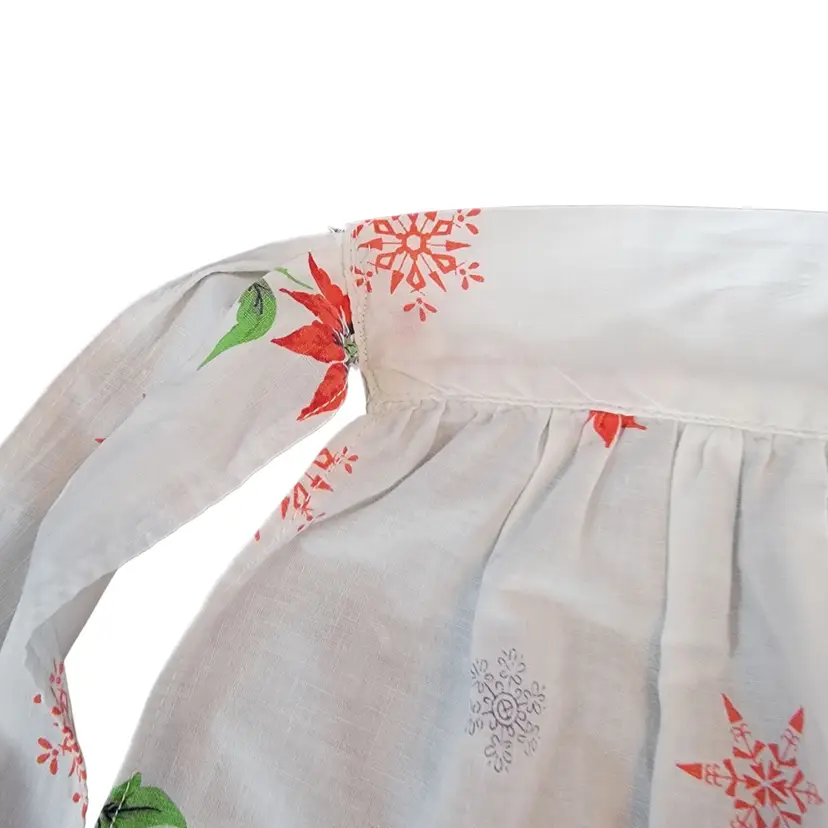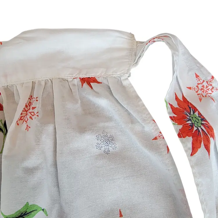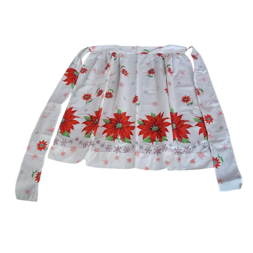 This charming Christmas apron tells a story of festive gatherings and holiday cheer. Its vibrant poinsettia print and delicate snowflakes evoke memories of warm kitchens filled with laughter and seasonal aromas. Crafted for hosting, it blends practicality with timeless holiday style. A perfect addition for creating joyful moments this season.