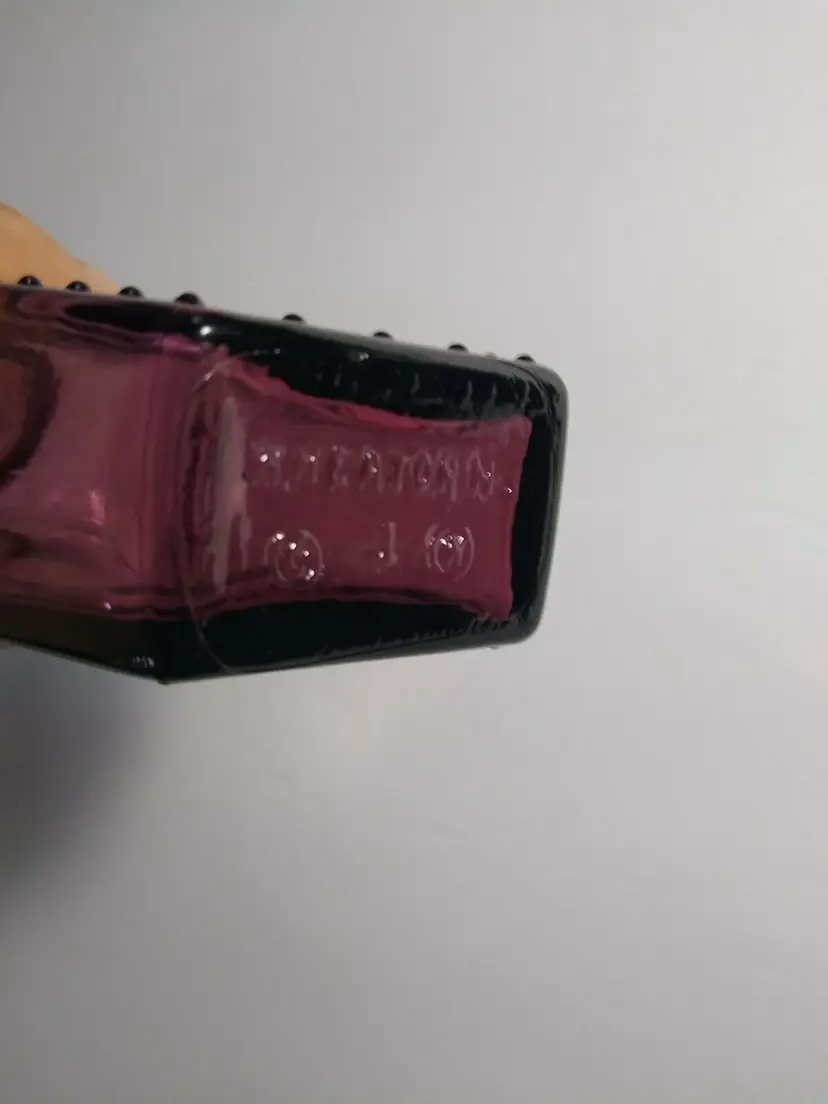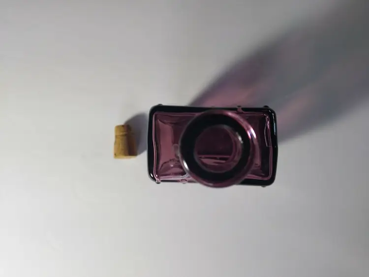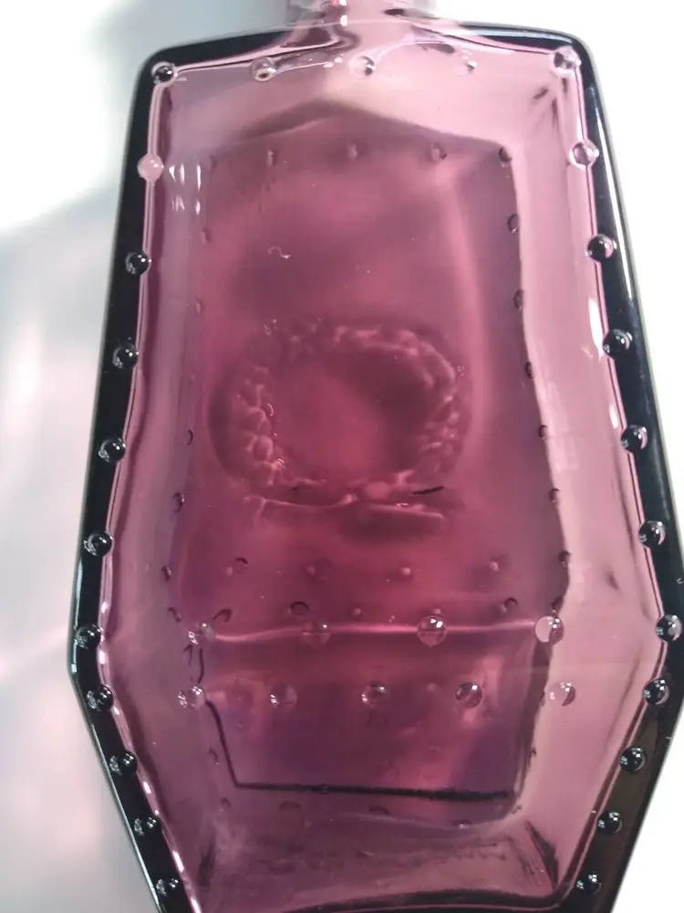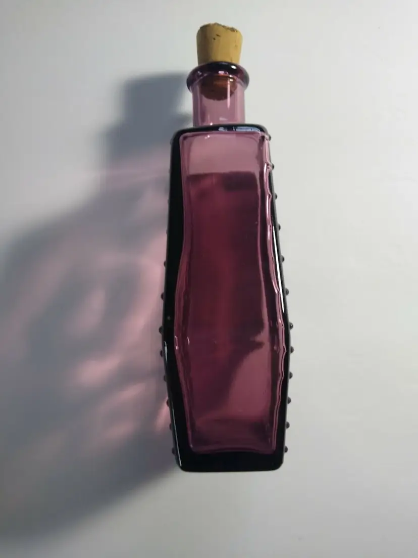 Vintage Wheaton Glass bottle circa 1971. Shaped like a coffin. Color is amethyst purple translucent with great 3-D look on each side. Marked on base and bottom front. Old cork stopper included with indents. These bottles look amazing in a window ledge with natural light shining through it. Great clean condition. Size is 5" x 2.5" x 1.5".