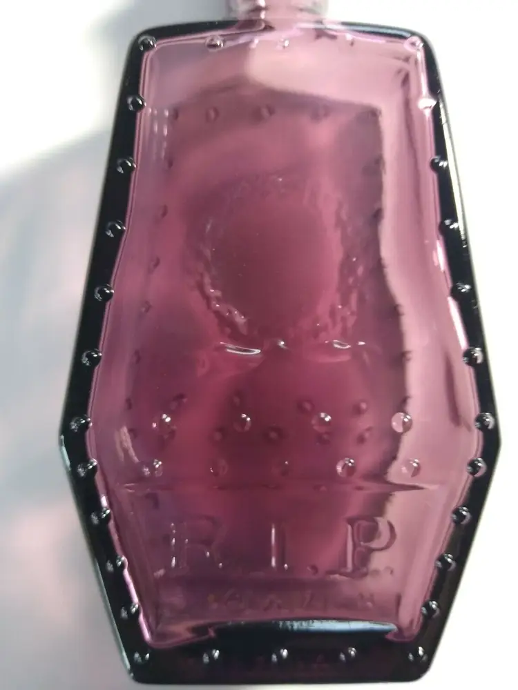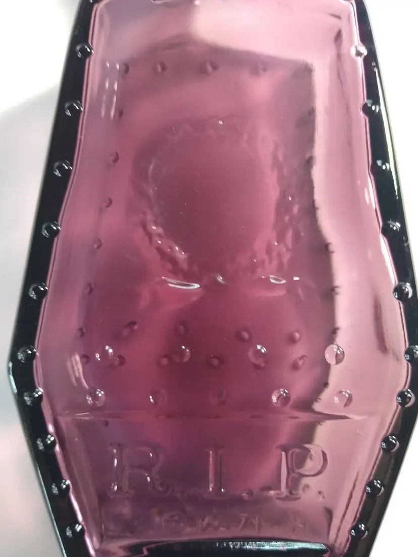 Add a spooky touch to your Halloween collection with this unique poison medicine bottle. The purple Wheaton bottle is shaped like a coffin and features the words "RIP" on the front. This reproduction bottle is a perfect addition for any gothic or horror themed display. Made in the United States, this collectible item is in excellent shape and ready to be displayed. Whether you're a fan of Halloween or just love unique collectibles, this coffin shaped bottle is a must-have.