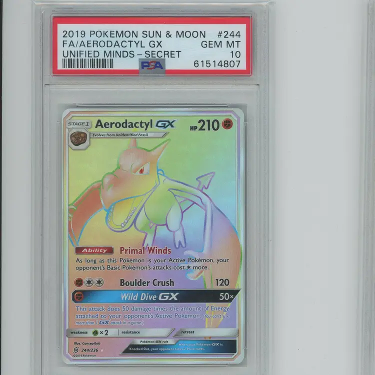 The product is a highly sought-after Aerodactyl GX Secret Rare Holo card from the Pokémon TCG set Unified Minds. Manufactured by The Pokémon Company in 2019, this English-language card features a full art design and is a chase collectible for Pokémon fans. With a PSA 10 GEM MINT rating, this card is a valuable addition to any collector's deck.