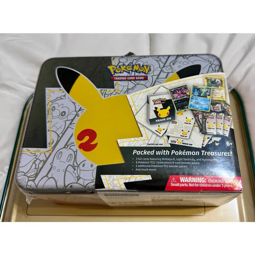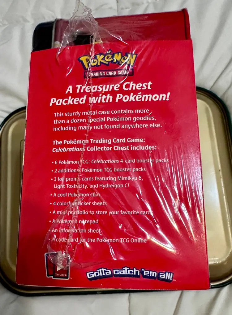 Product Details Card Text:The Pokémon TCG: Celebrations Collector Chest includes: • 6 Pokémon TCG: Celebrations 4-card booster packs • 2 additional Pokémon TCG booster packs (Packs and contents may vary.) • 3 foil promo cards featuring Mimikyu (Delta Species), Light Toxtricity, and Hydreigon C! • A cool Pokémon coin • 4 colorful sticker sheets • A mini portfolio to store your favorite cards • A Pokémon notepad • An information sheet • A code card for the Pokémon TCG Online TCGplayer Tip:The Celebrations Collector Chest is great for collectors, enthusiasts and those seeking some exclusive promos. Additionally, the Celebrations set contains some notable Pokémon like Mew, Zamazenta and more big names.