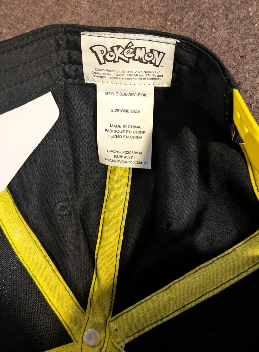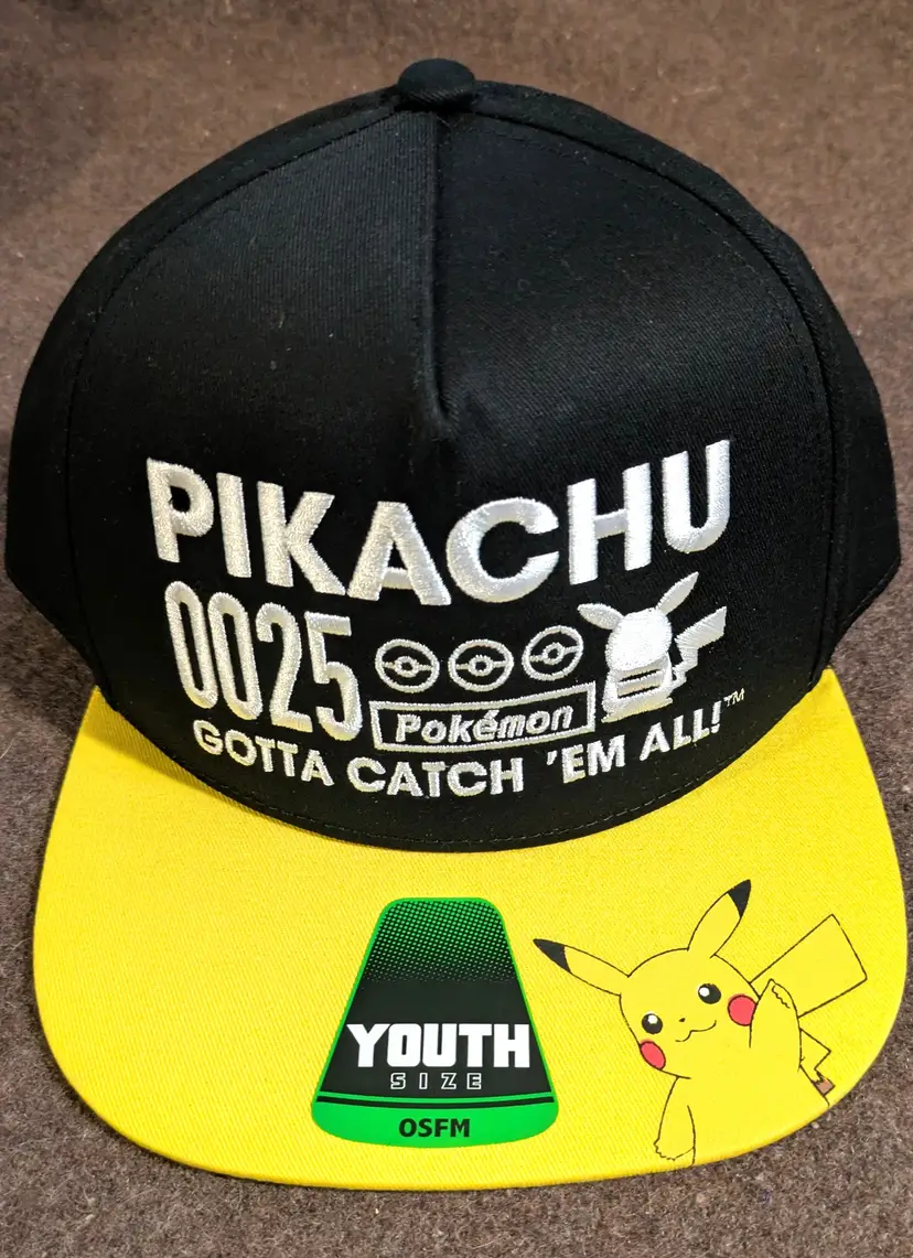 Gotta Catch Em' All! NWT Official Pokémon Pikachu youth snapback hat featuring a black crown with embroidered Pikachu graphics and a bright yellow flat brim. Designed in youth one-size-fits-most (OSFM) with an adjustable snapback closure for a comfortable fit. Made with durable materials and bold stitching, perfect for everyday wear, school, or Pokémon fans and collectors. Great gift idea for kids who love Pikachu and Pokémon merchandise. Hat is new with tags as shown in photos.