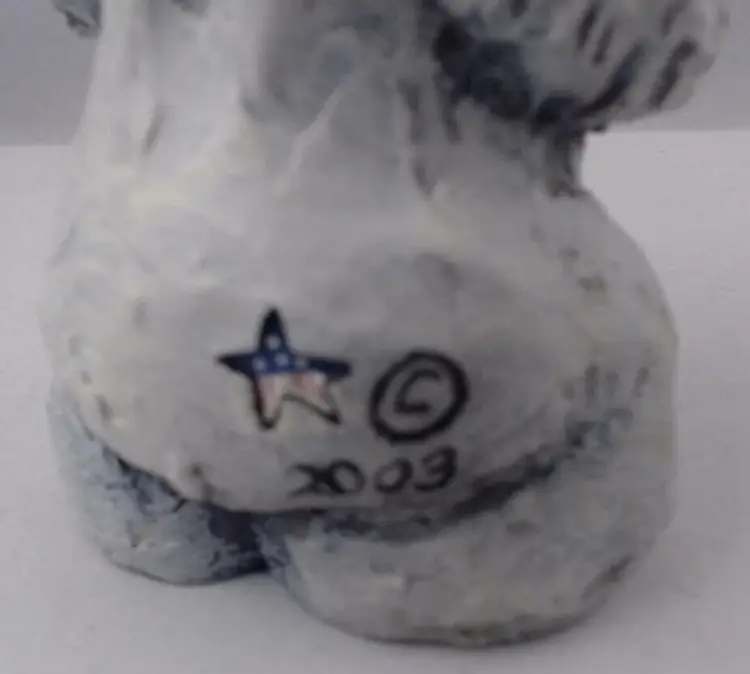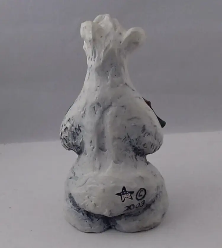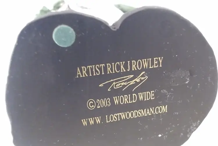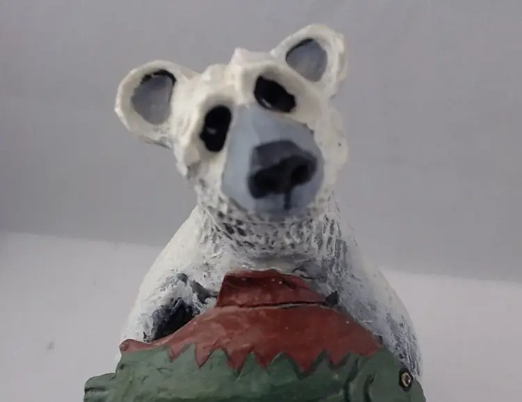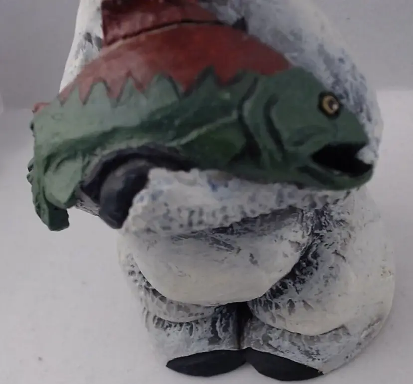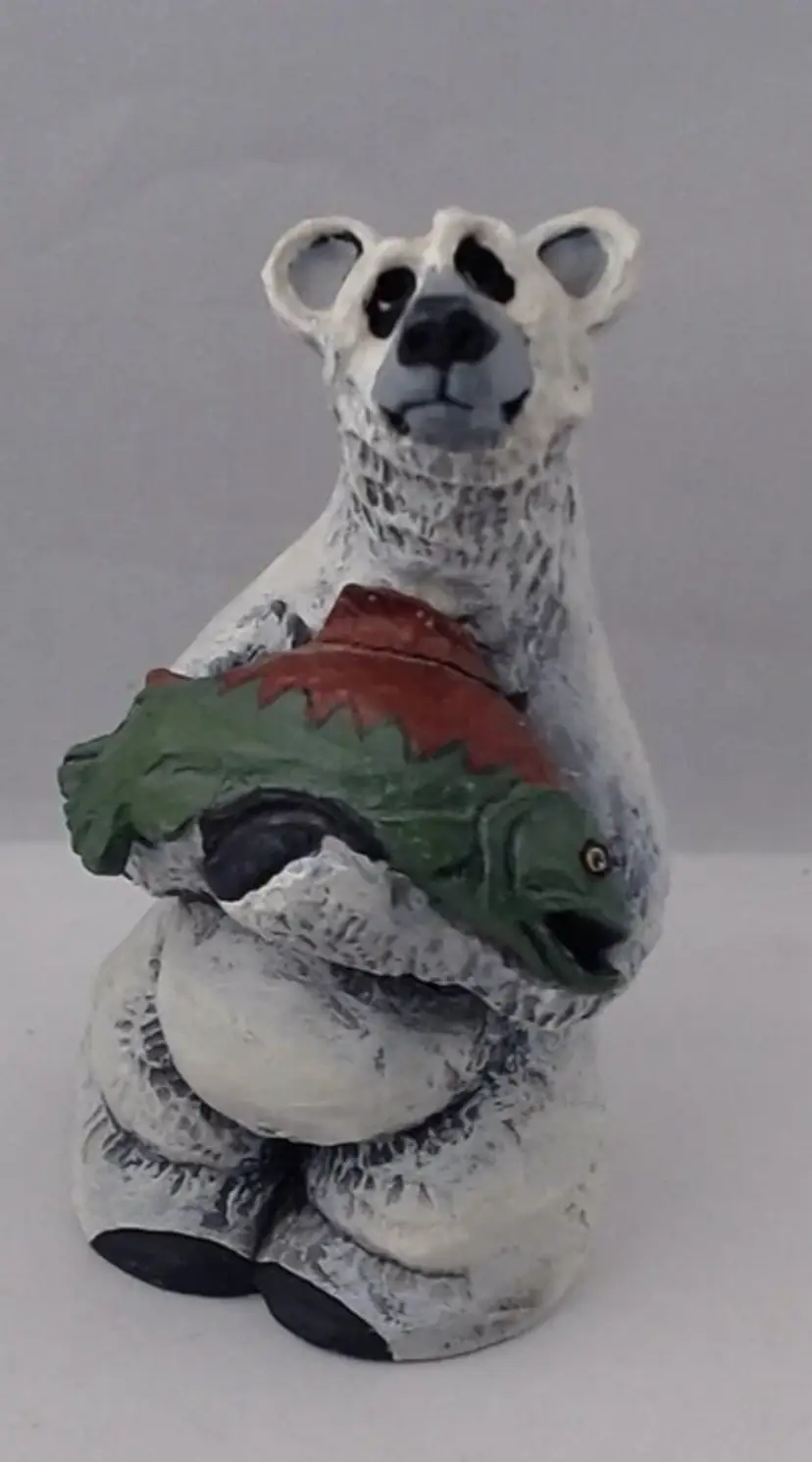 This is a very cute Resin Figurine by Rick J. Rowley (signed and marked) of a sorrowful Polar Bear holding his salmon dinner. He is 5.5" tall and is just as sorrowful looking as he can be. So cute and full of character. It is produced in 2003 by World Wide and www.Lostwoodsman.com