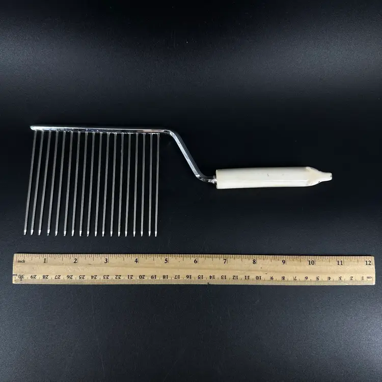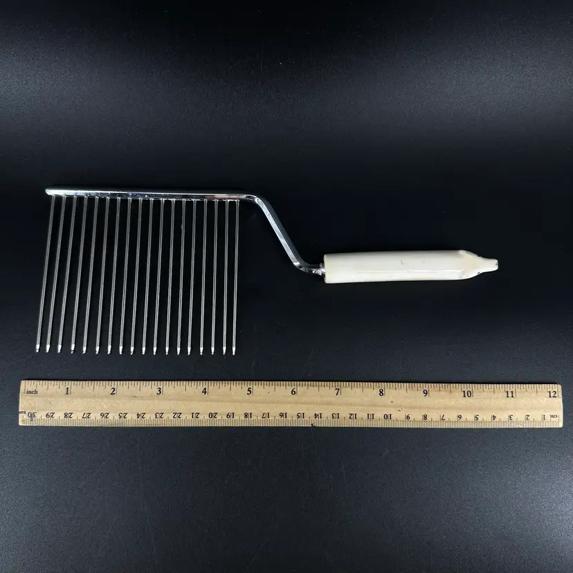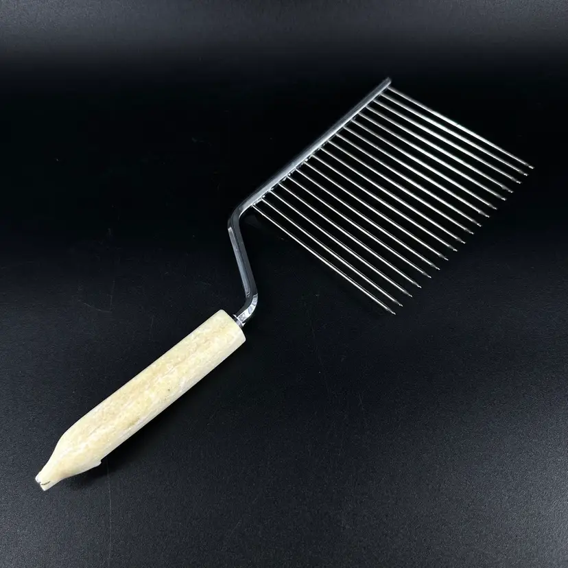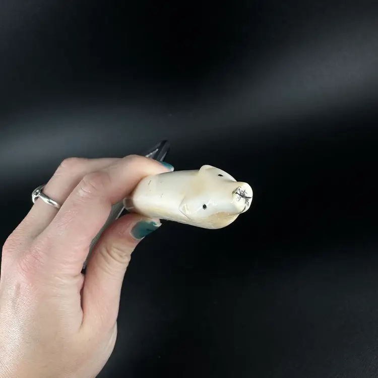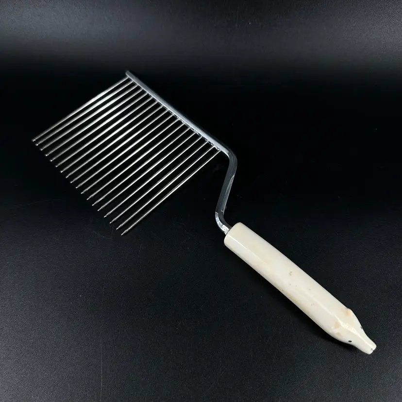 This Polar Bear Angel Food Cake Cutter is approximately 10” in length. The handle does have some wear on it where the black paint is worn off. The handle appears to be made out of antler. There are no chips or cracks, also no signatures or markings on it as well.