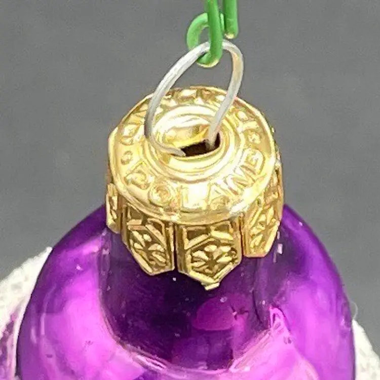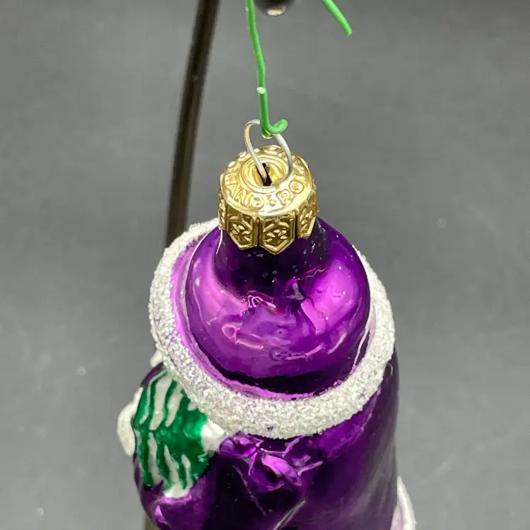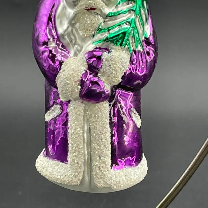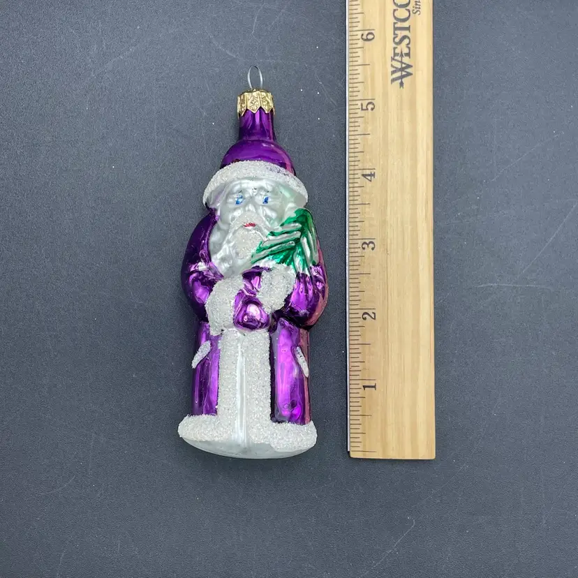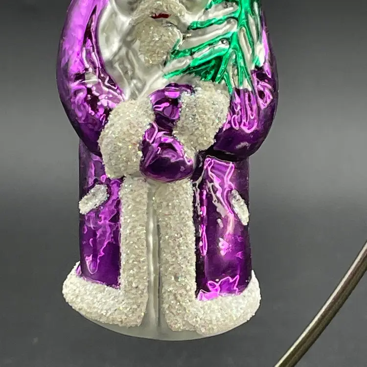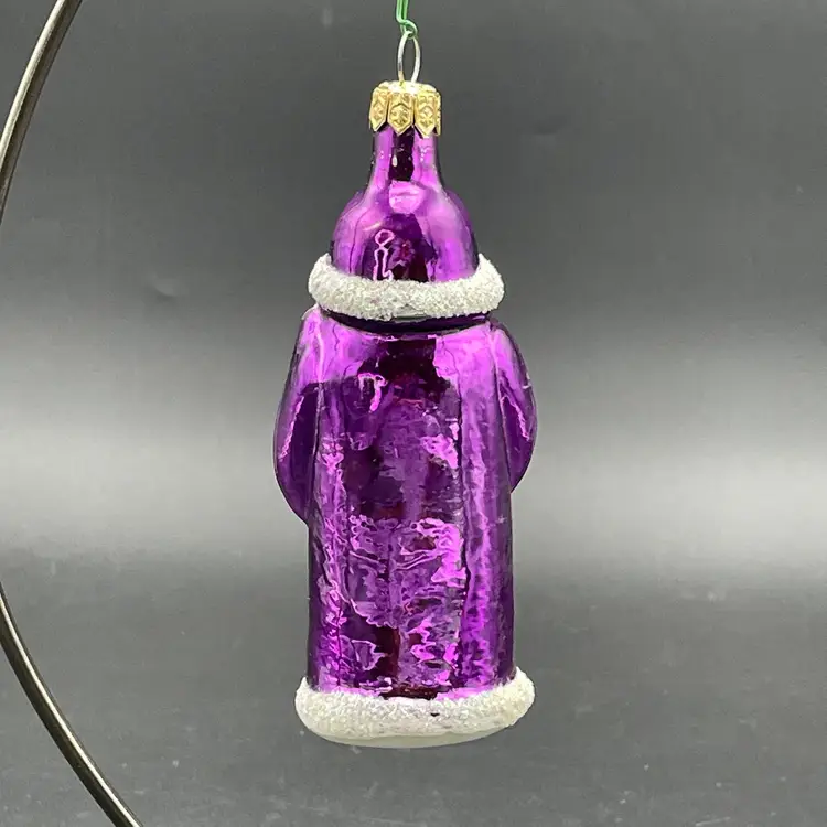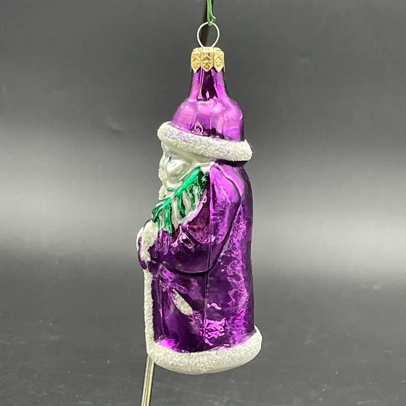 This is a vintage blown glass purple Santa hanging ornament. Made in Poland. Measures approximately 5.25" long. No chips or cracks.