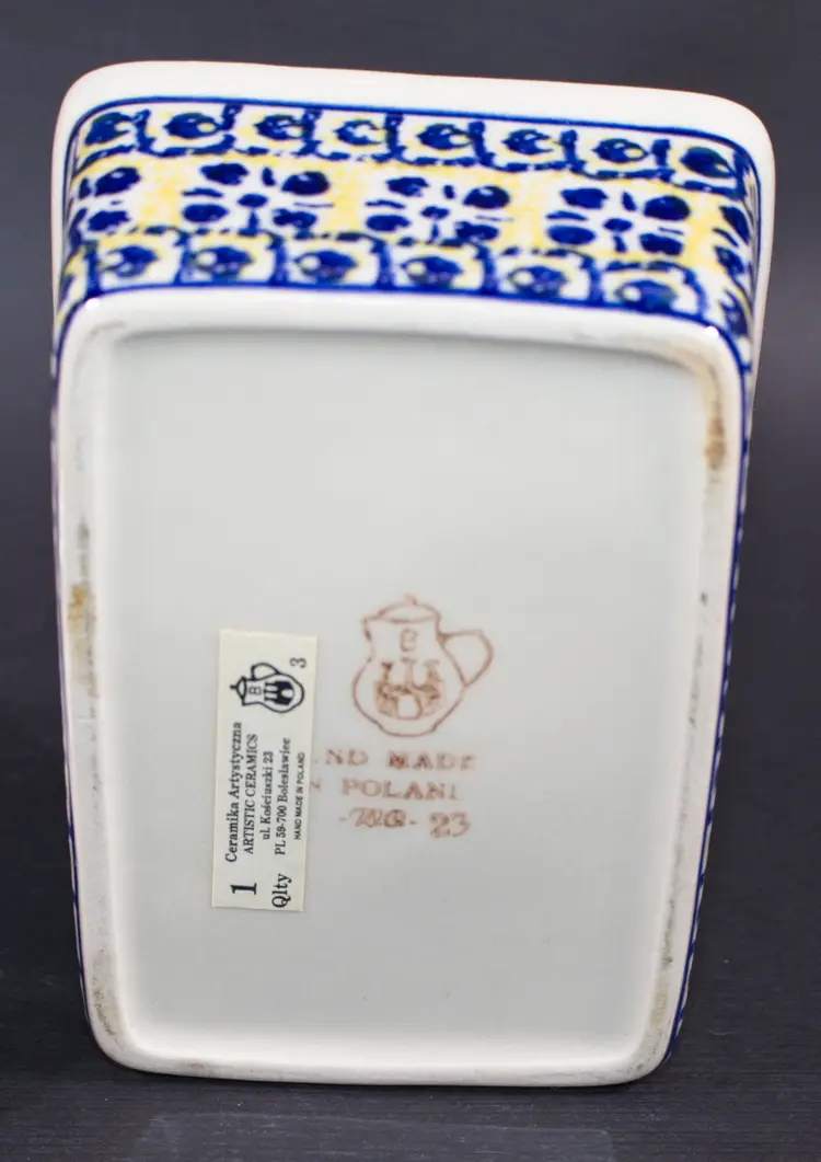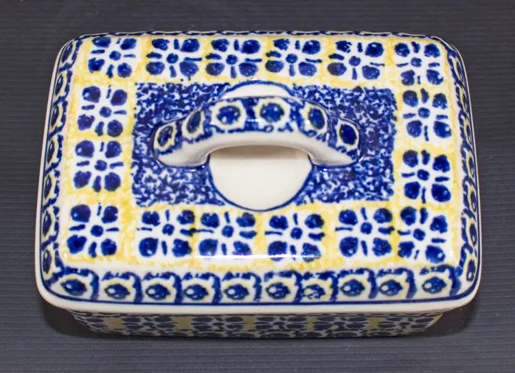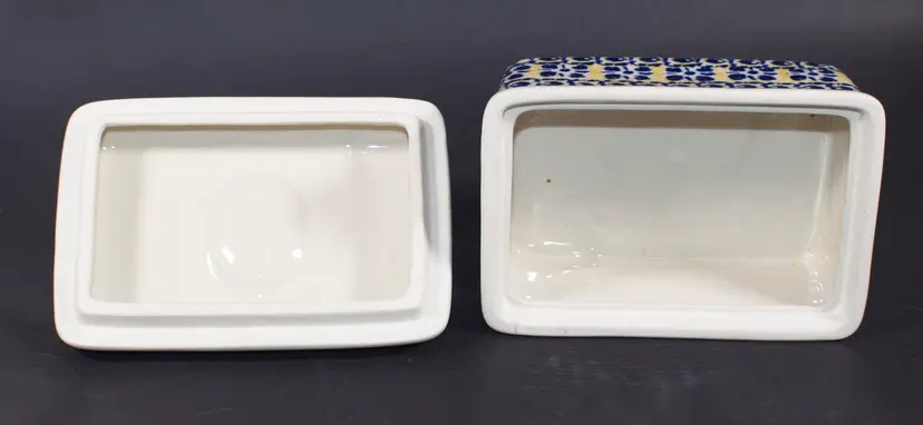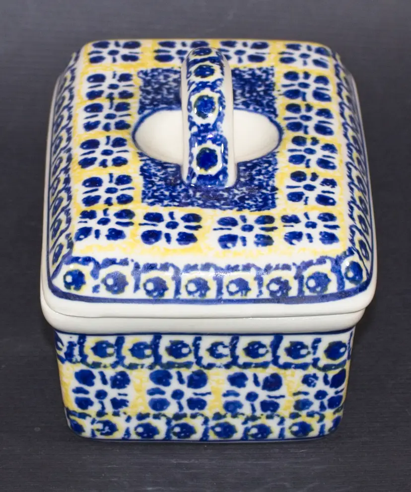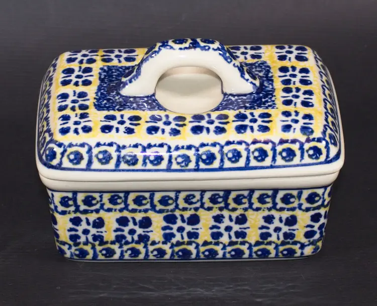 Polish Boleslawiec Pottery Covered Butter Tub by Ceramika Artystyczna Hand Made. In good condition. 5.5" long x 4" wide x 4" tall.