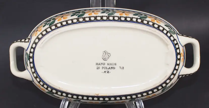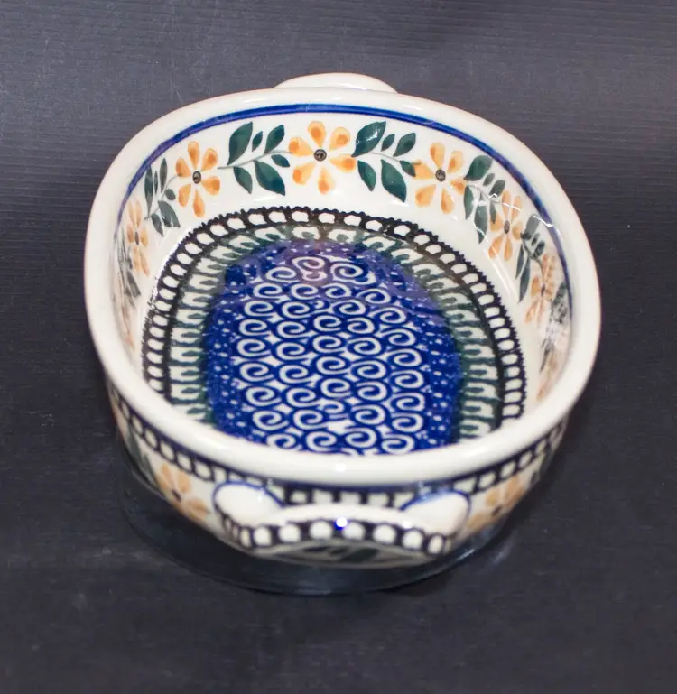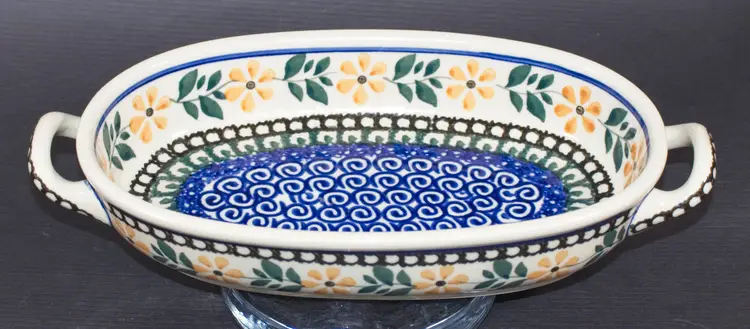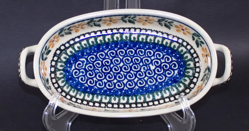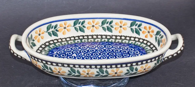 Polish Boleslawiec Pottery Oval Baker Tray with Handles Hand Made Floral Pattern. In good condition. 9.5" long x 5" wide x 1.75" tall