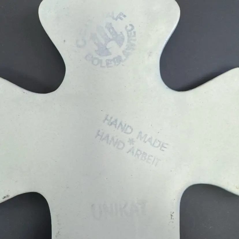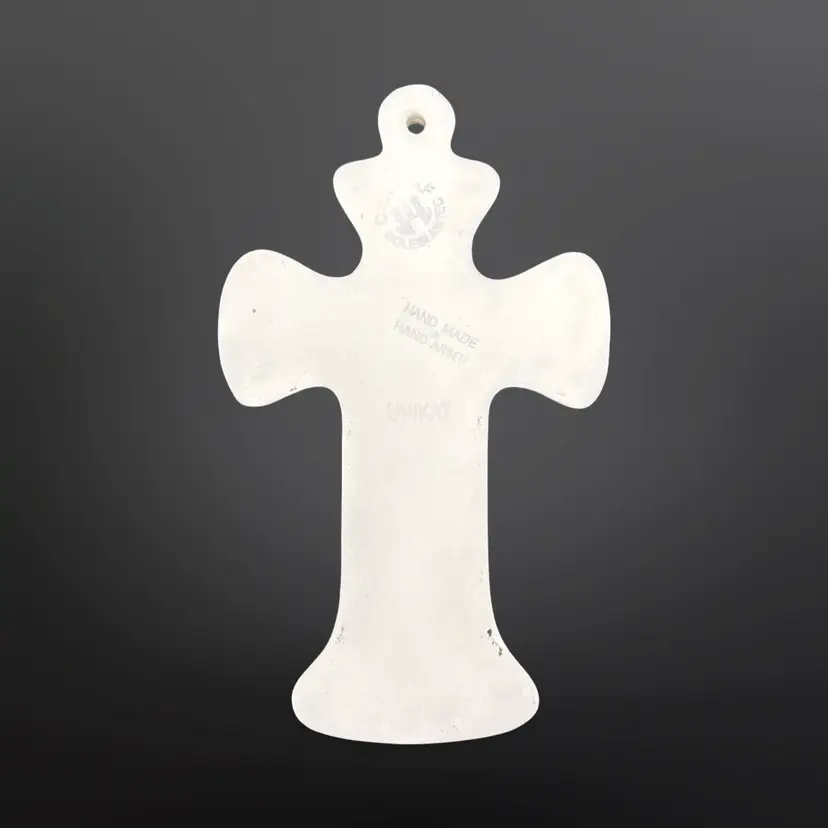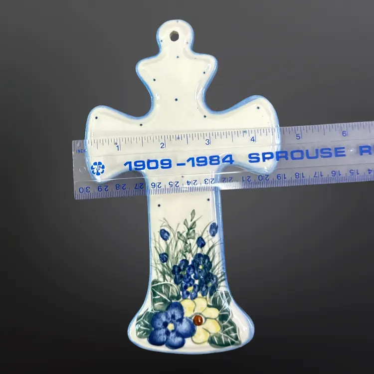 Beautiful hand made unikat, or unique design polish pottery cross. Features blue and yellow flowers and blue dots on an off white background. No chips, cracks, damage. Measures approximately 4.5” W x 7.5” H