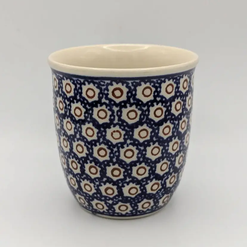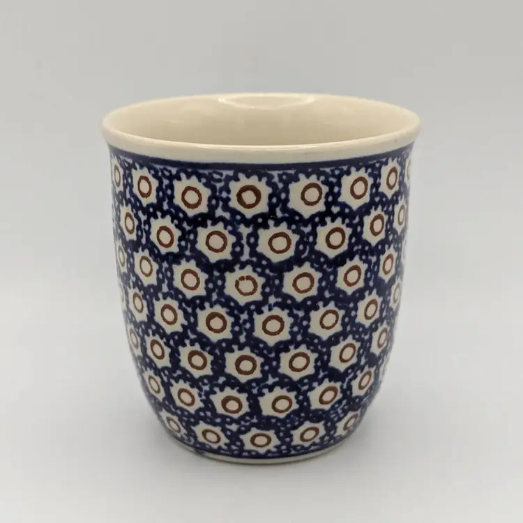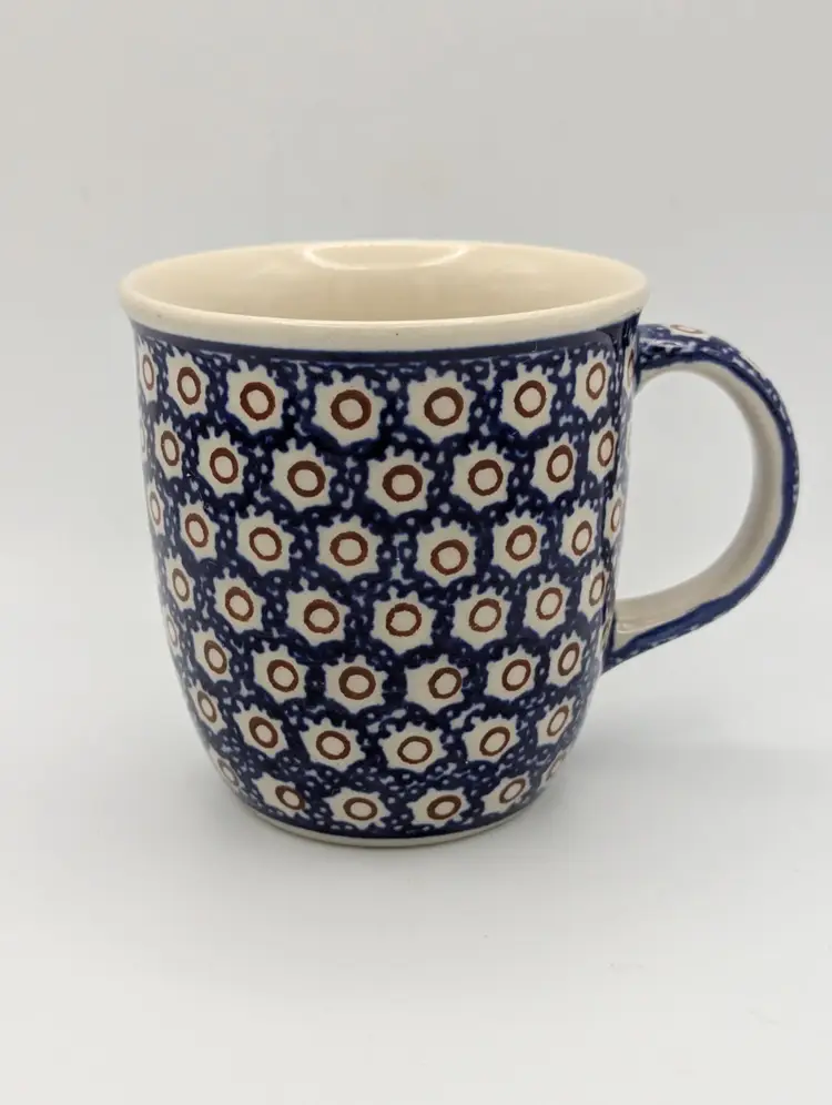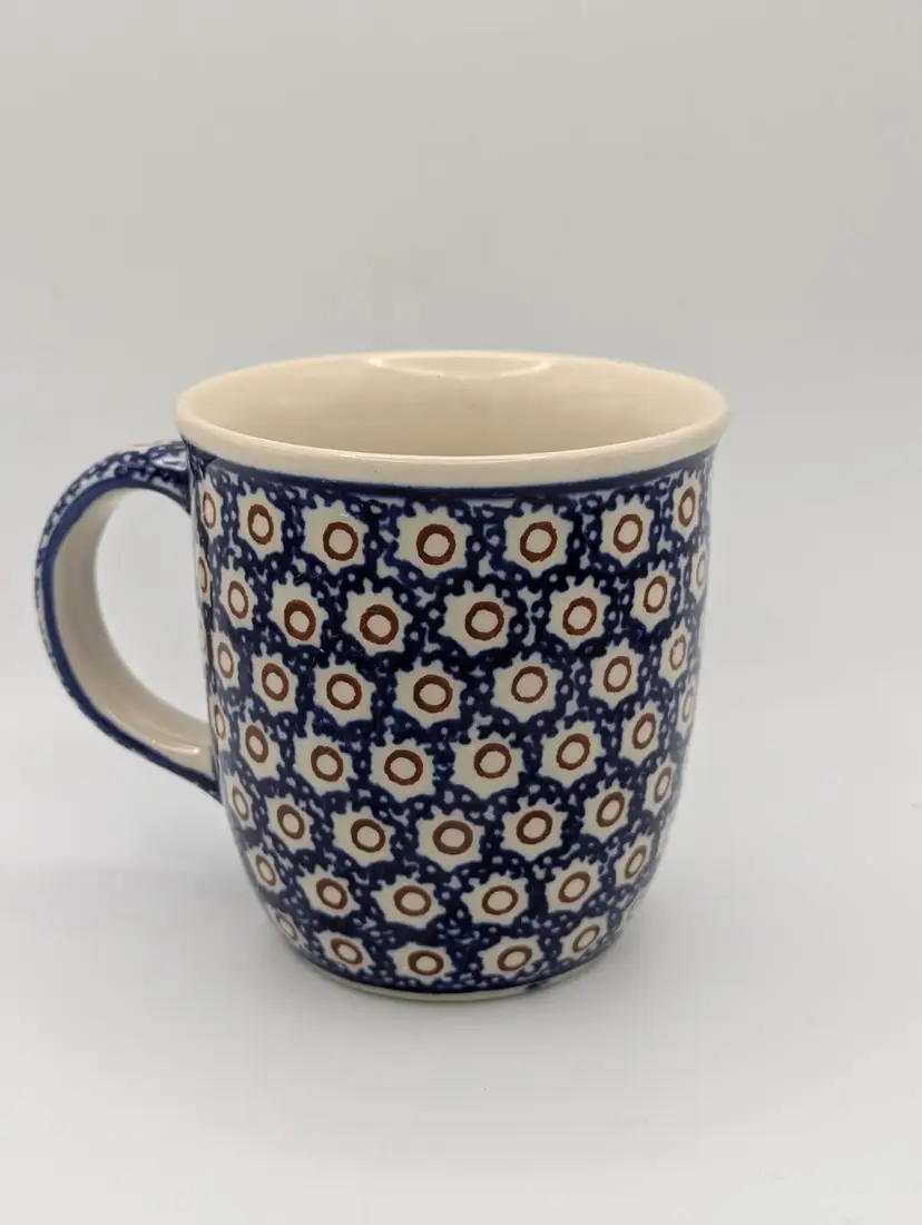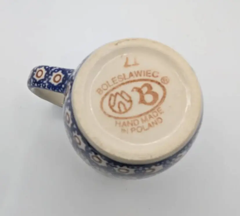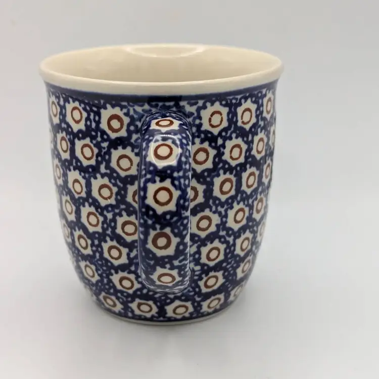 This mug features the polka dot or Dot to Dot design which is a traditional style, and traditional blue color Polish Boleslawiec Pottery is made from local clay. The manufacturing and glazes used are lead free and are safe in microwave, freezer, dishwasher and oven. The mug is stamped on the bottom. Hand painted - Hand made.