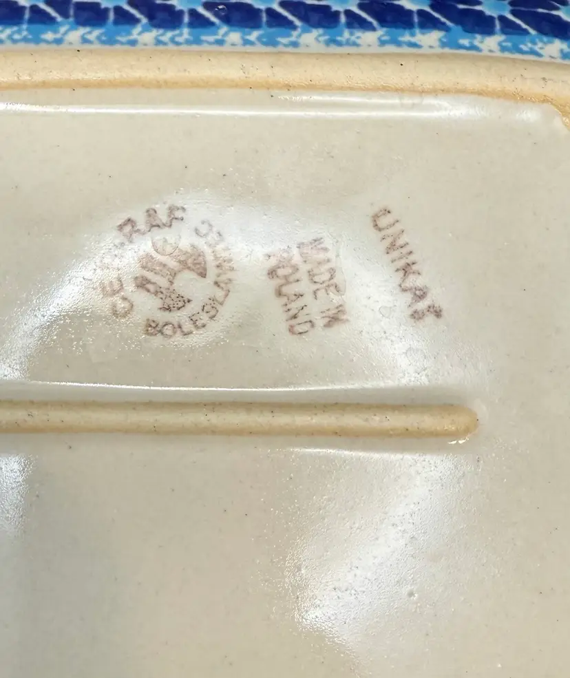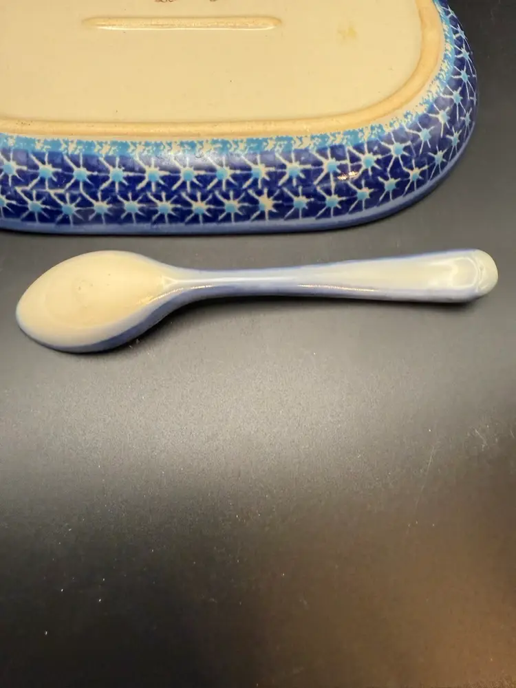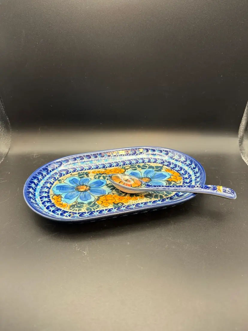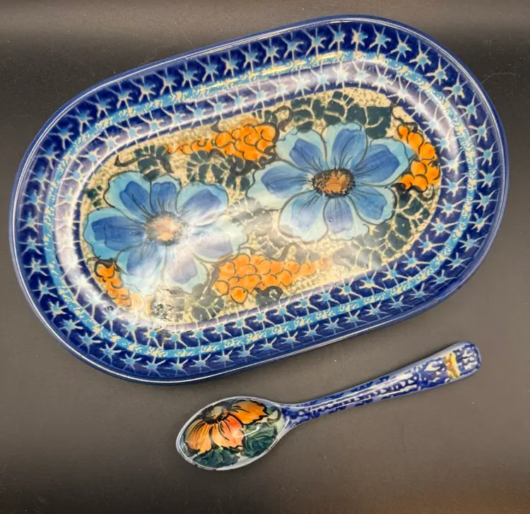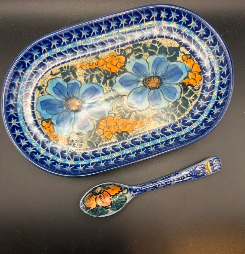 Polish Pottery Oval Condiment Dish With Matching Spoon