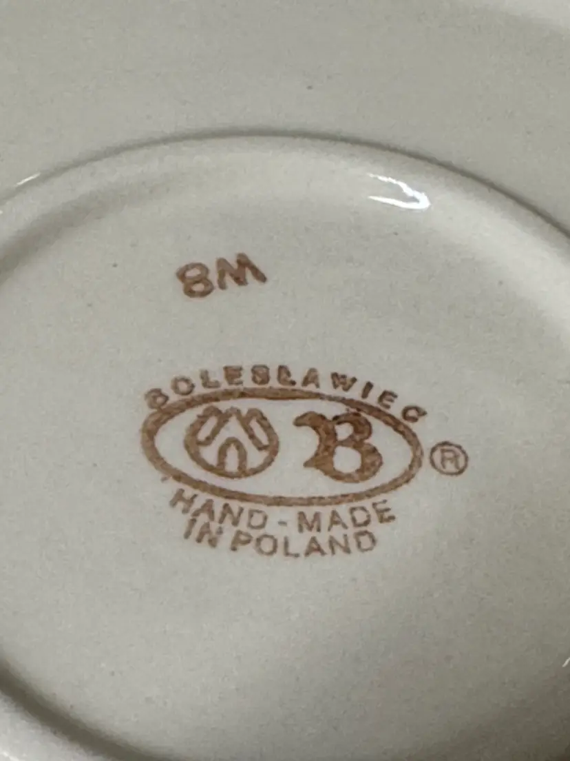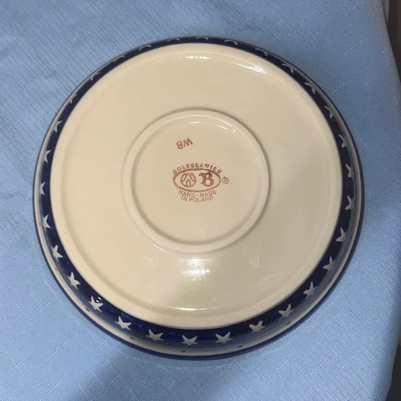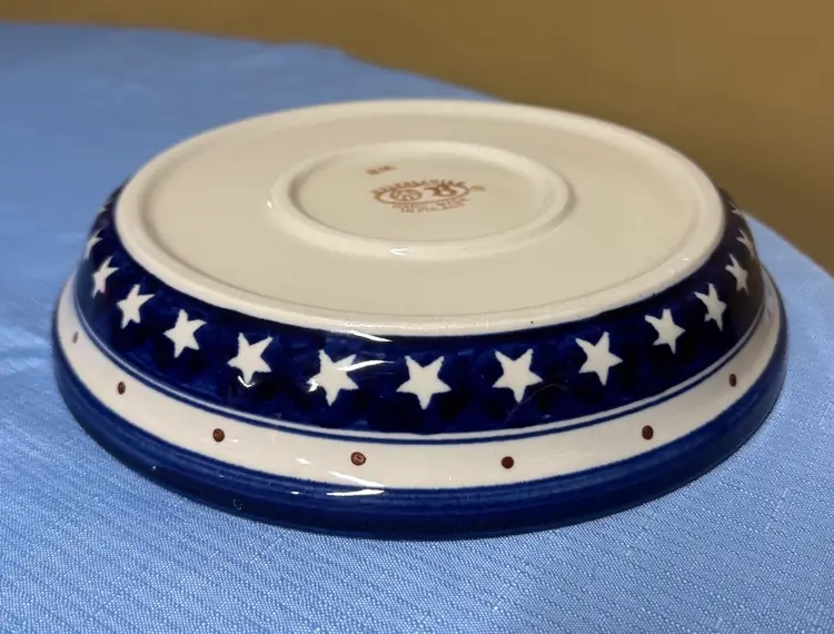 Polish Pottery Pie Dish Plate 9.5” Stars Blue White Red handmade Polish pottery pie plate features a distinct Stars & Stripes pattern and is produced by artisans in Bolesławiec, Poland. Pattern: Americana-themed blue background with white stars and brown dot accents. Dimensions: Approximately 9.5 inches in diameter and 1.75 inches high. Material: Durable ceramic stoneware, designed to be functional and decorative Deep navy ceramic with white star pattern. Glossy glazed finish. Classic Americana look. Great for serving or display. Excellent condition with no breaks or chips and I don’t see any use scratches. (3973262610)