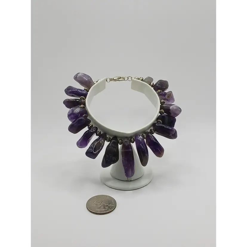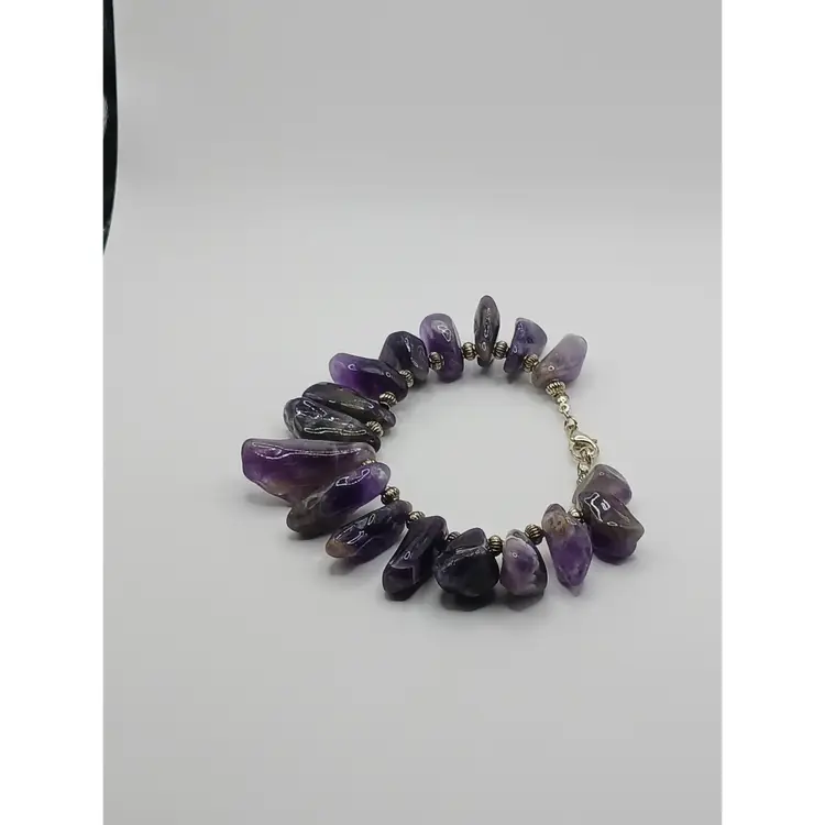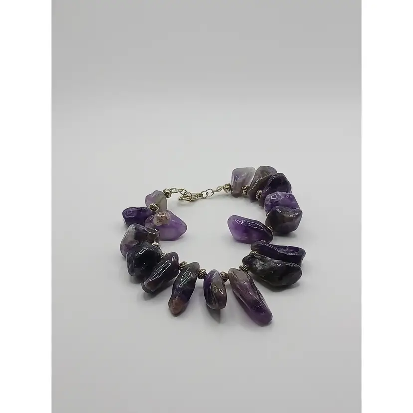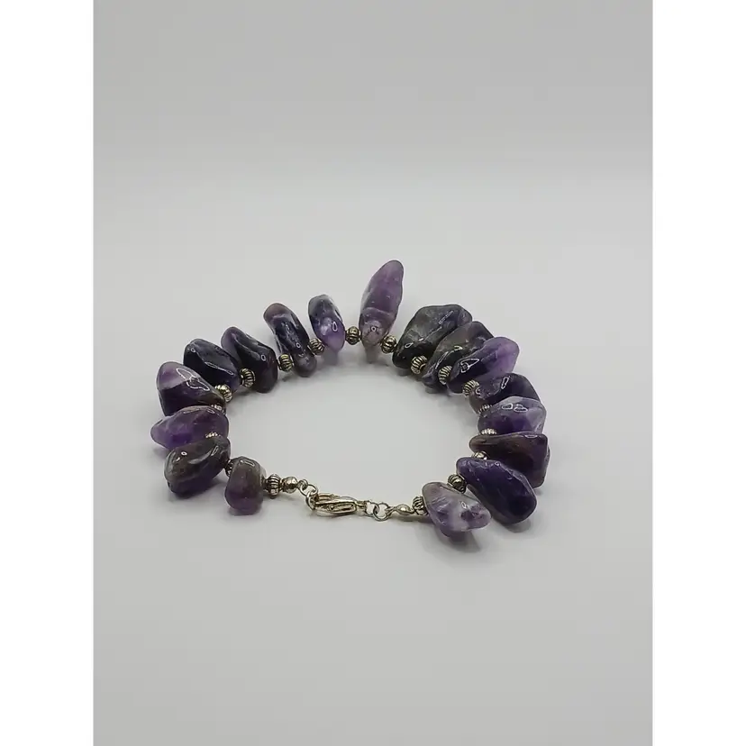 Amethyst Gemstones that measure between 1/2 x 1/2 x 3/8 inches - 5/8 x 1 5/16 x 3/8 inches have been strung together with Tibetan Silver Spacer beads to make this 8 inch Bracelet. Stones have been polished to bring out the shine in each of the stones. Amethyst helps in promoting good health on all fronts - physical, mental and spiritual. Physically, amethyst is known to bolster the immune system, reduce tension and headaches, and promote restful sleep. Mentally, its effects include alleviating worries and fears, encouraging clear thinking, and trusting one's intuition.