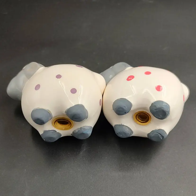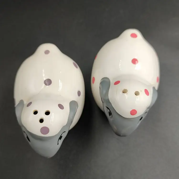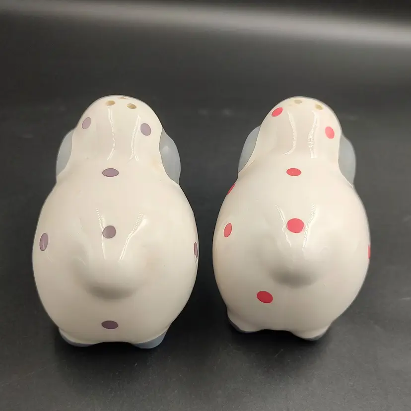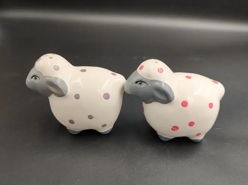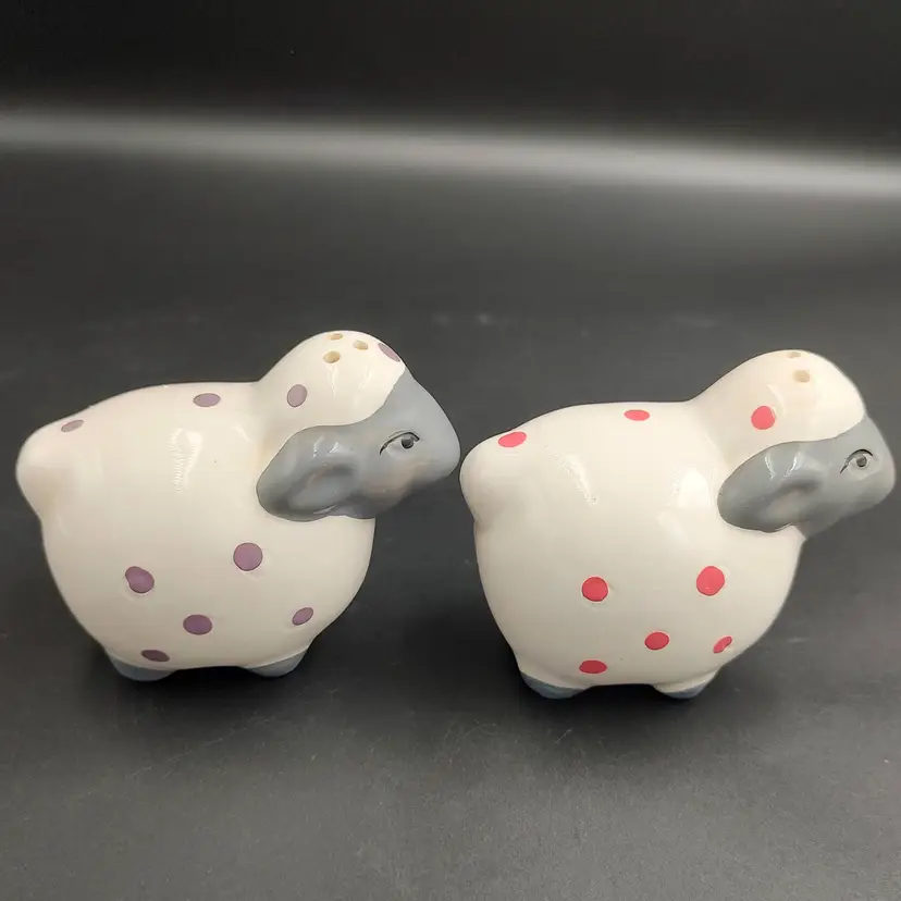 Polkadot Ceramic Sheep Salt and Pepper Shaker Set. Manufacturers defects and paint touched up. Height 3" x width 2.5" x length 3.5".