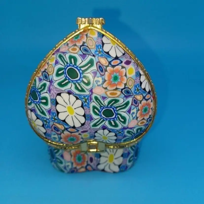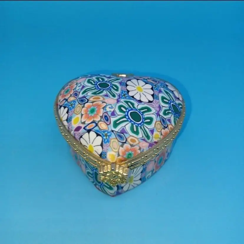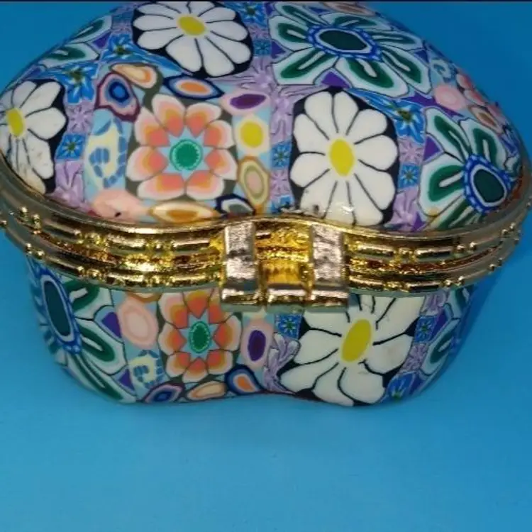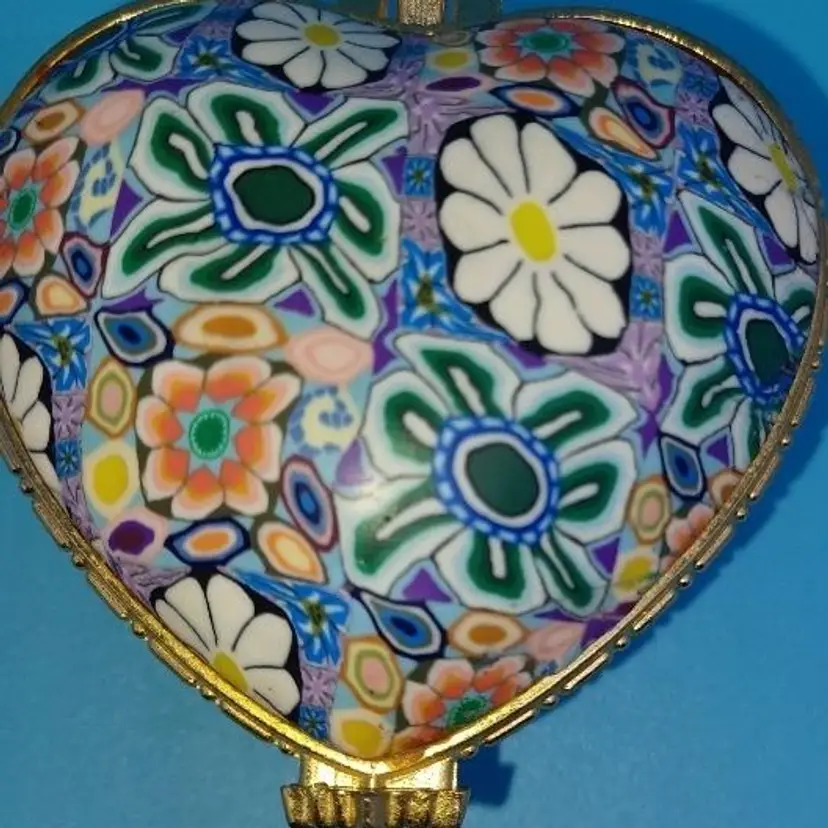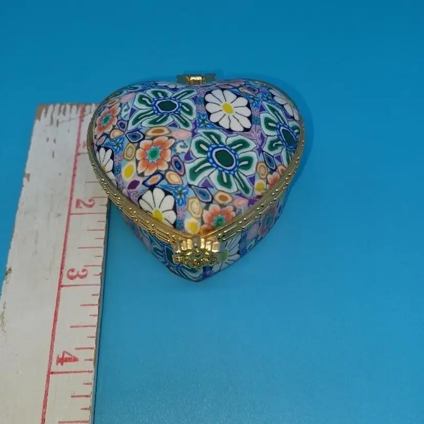 Polymer Millefiori Heart Shaped Trinket Box Colorful Measured 3 in Red lined Gold edges Very pretty Please see all pictures as they're the best description All items from a smoke-free home with pets Experienced fragile shipper