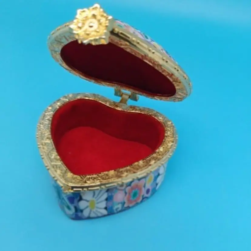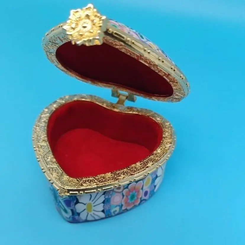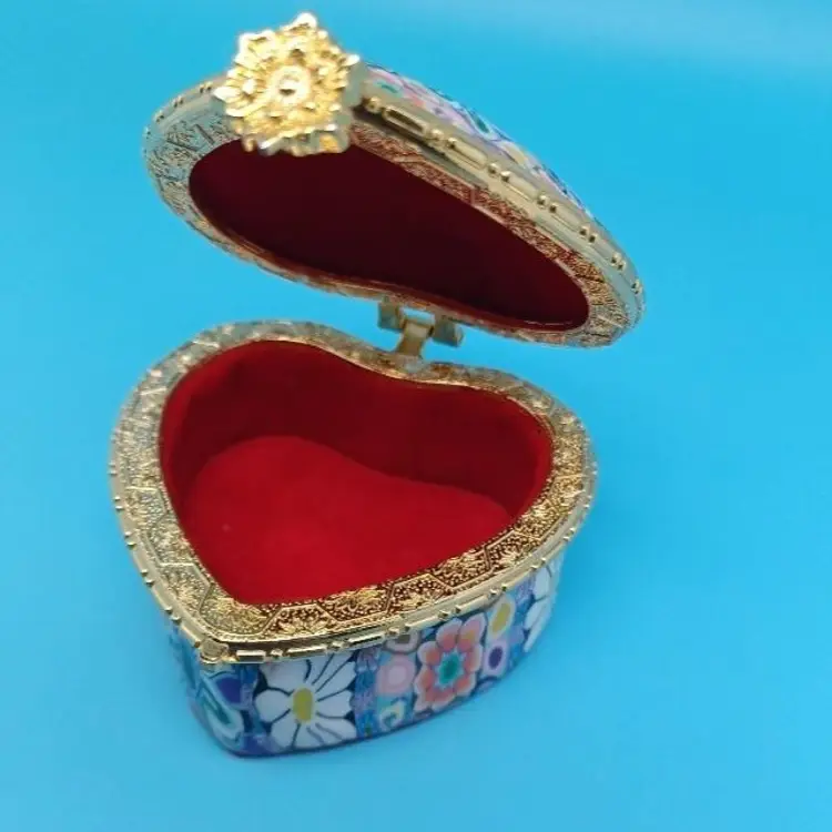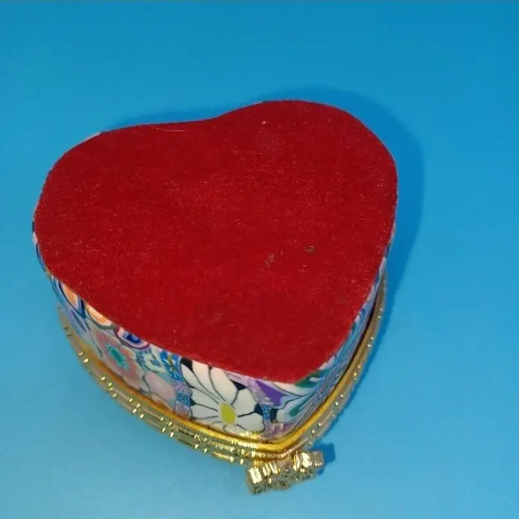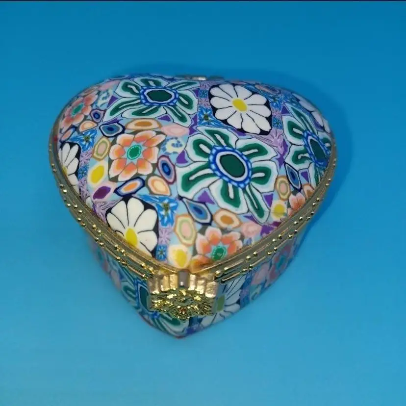 Polymer Millefiori Heart Shaped Trinket Box Colorful Measured 3 in Red lined Gold edges Very pretty Please see all pictures as they're the best description All items from a smoke-free home with pets Experienced fragile shipper
